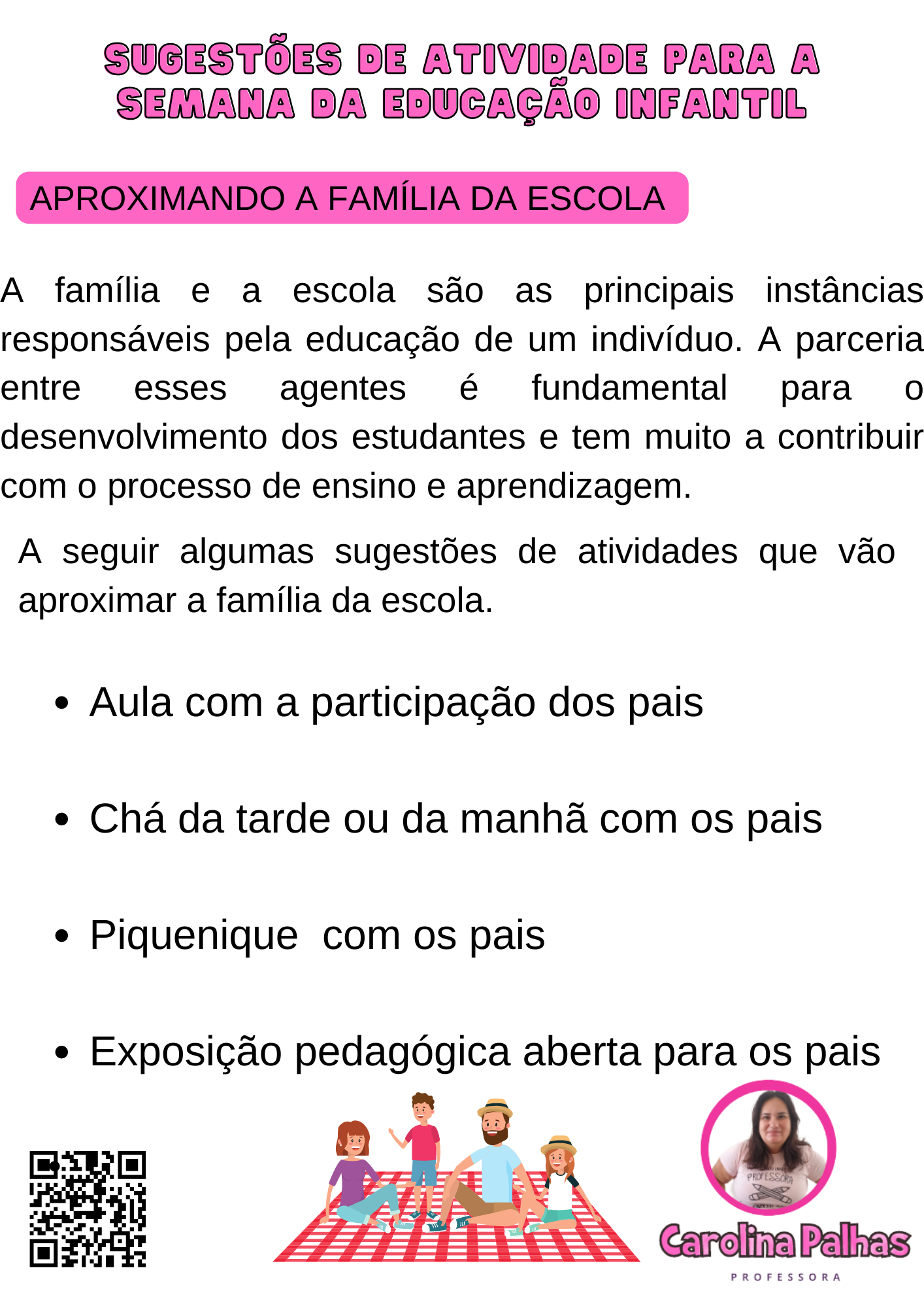 A seguir algumas sugestões de atividades que vão aproximar a família da escola.