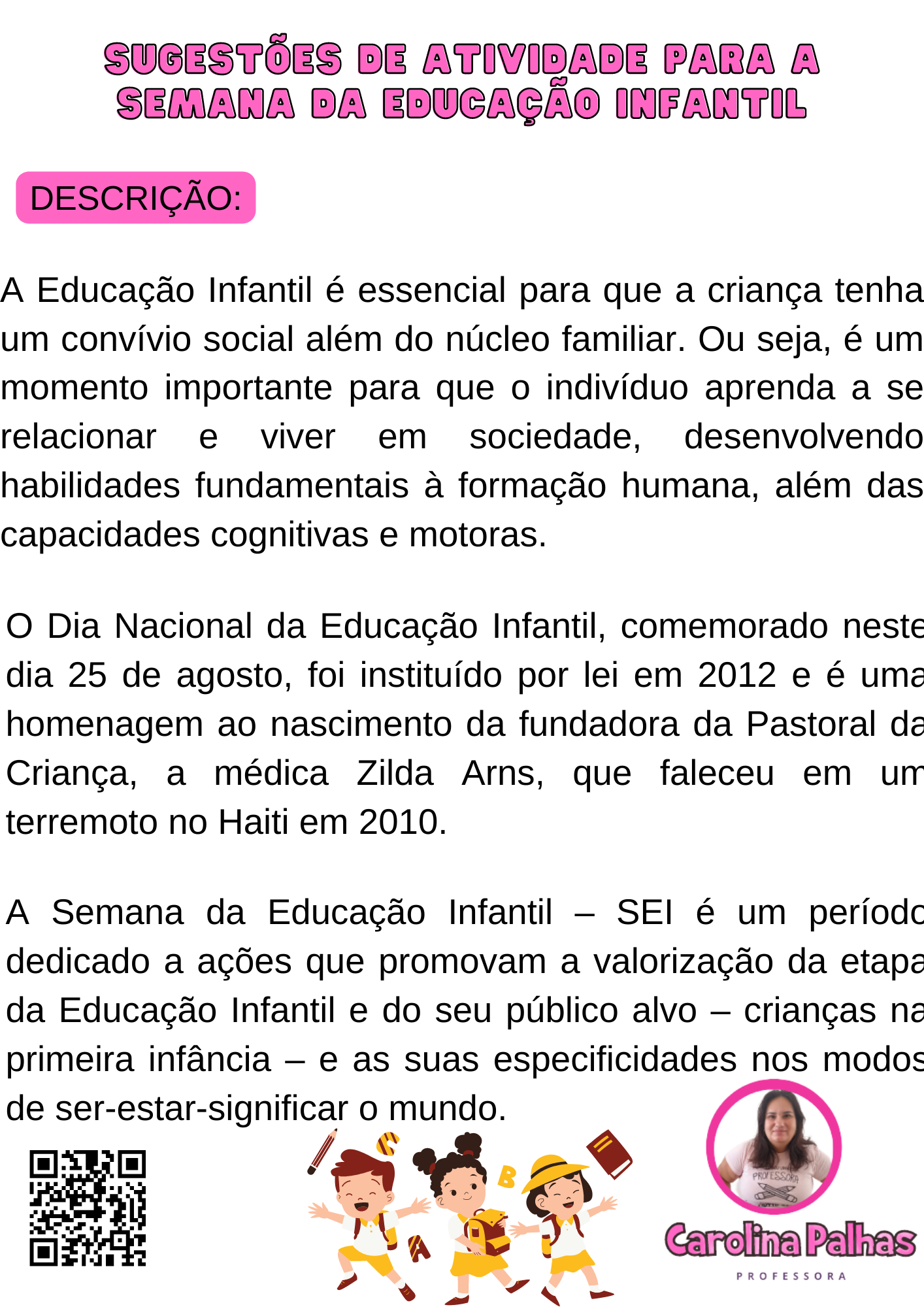 O Dia Nacional da Educação Infantil, comemorado neste dia 25 de agosto, foi instituído por lei em 2012 e é uma homenagem ao nascimento da fundadora da Pastoral da Criança, a médica Zilda Arns, que faleceu em um terremoto no Haiti em 2010.