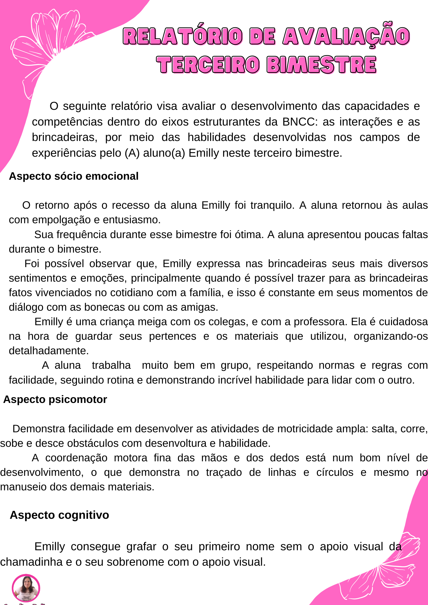 O seguinte relatório visa avaliar o desenvolvimento das capacidades e competências dentro do eixos estruturantes da BNCC: as interações e as brincadeiras, por meio das habilidades desenvolvidas nos campos de experiências pelo (A) aluno(a) Emilly neste terceiro bimestre.