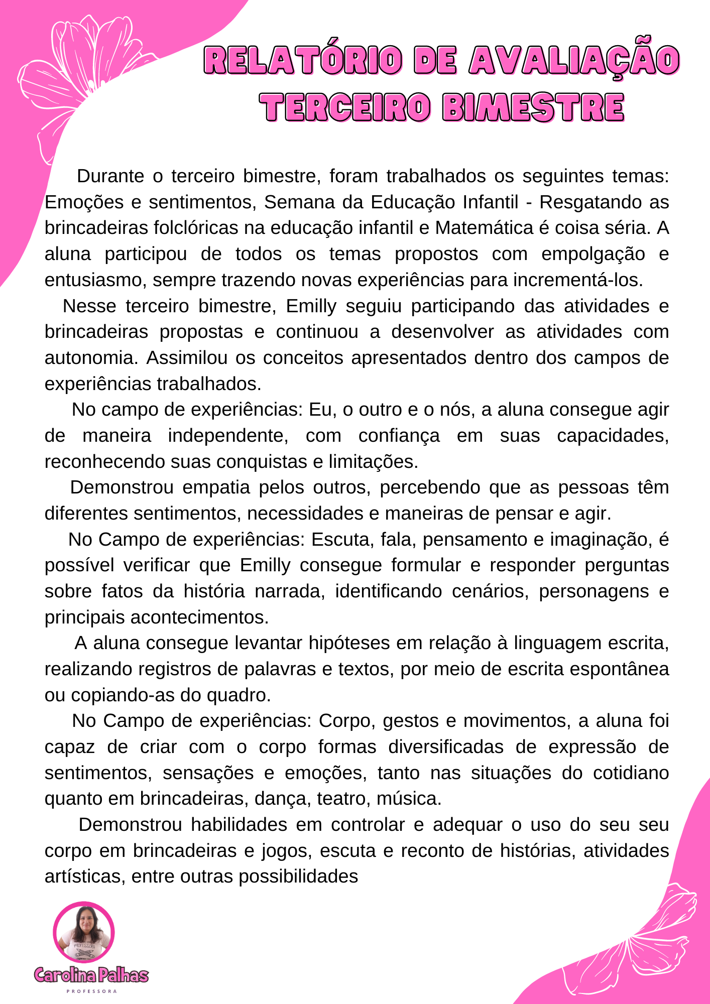 Nesse terceiro bimestre, Emilly seguiu participando das atividades e brincadeiras propostas e continuou a desenvolver as atividades com autonomia. Assimilou os conceitos apresentados dentro dos campos de experiências trabalhados.