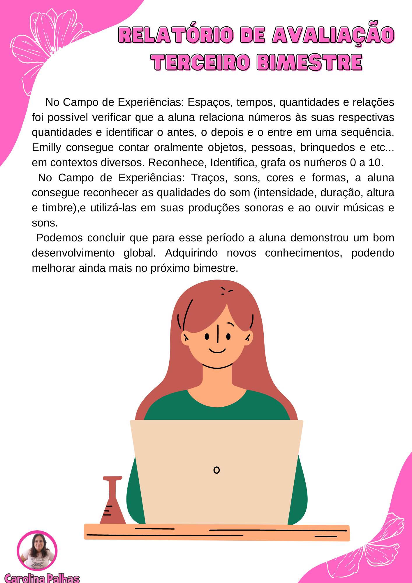 Podemos concluir que para esse período a aluna demonstrou um bom desenvolvimento global. Adquirindo novos conhecimentos, podendo melhorar ainda mais no próximo bimestre.