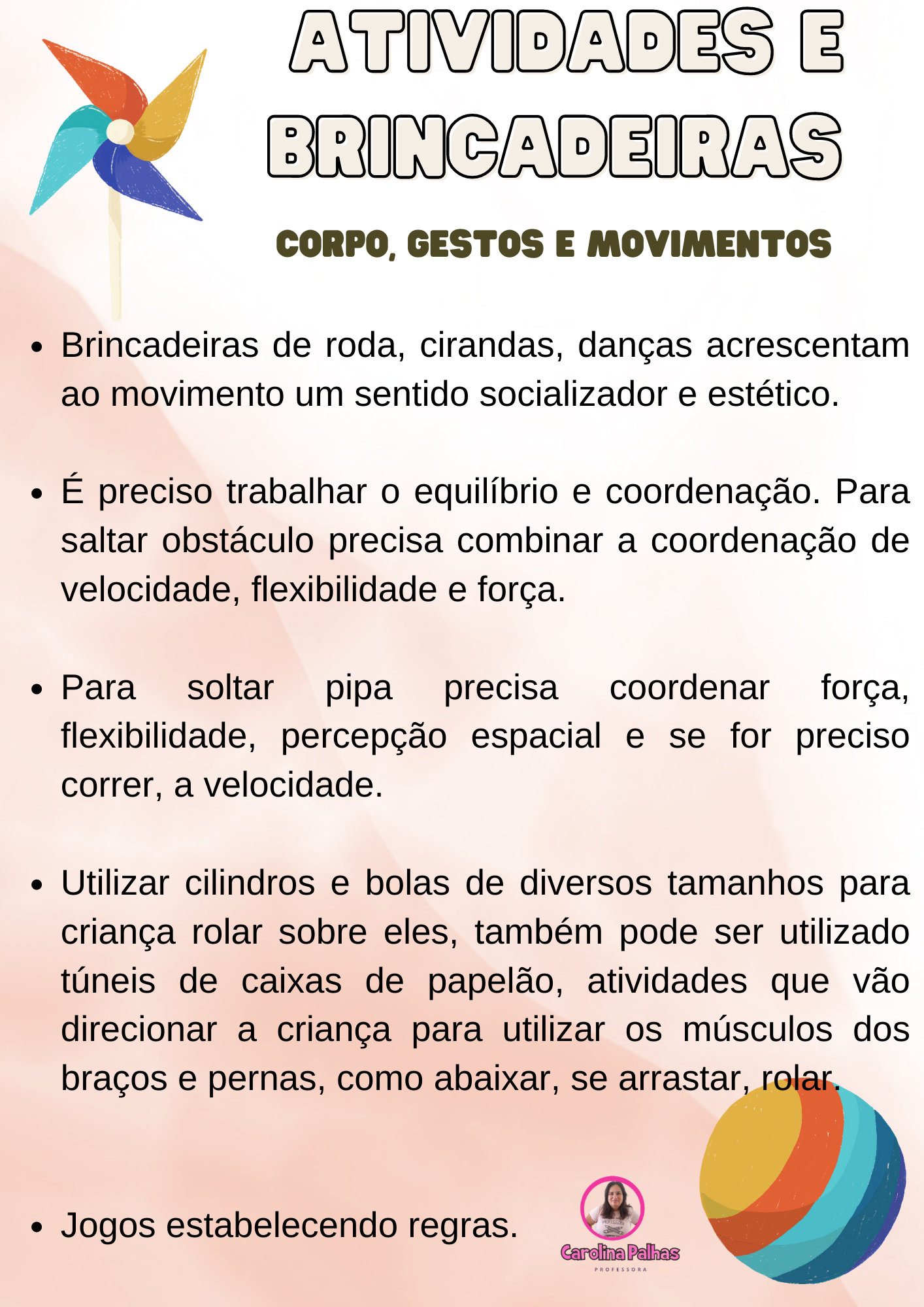 - Brincar com bambolês, rolar pneus, pular obstáculos, seguir linhas no chão, brincadeira de estátua, pular obstáculos, batatinha frita, favorece o controle muscular.