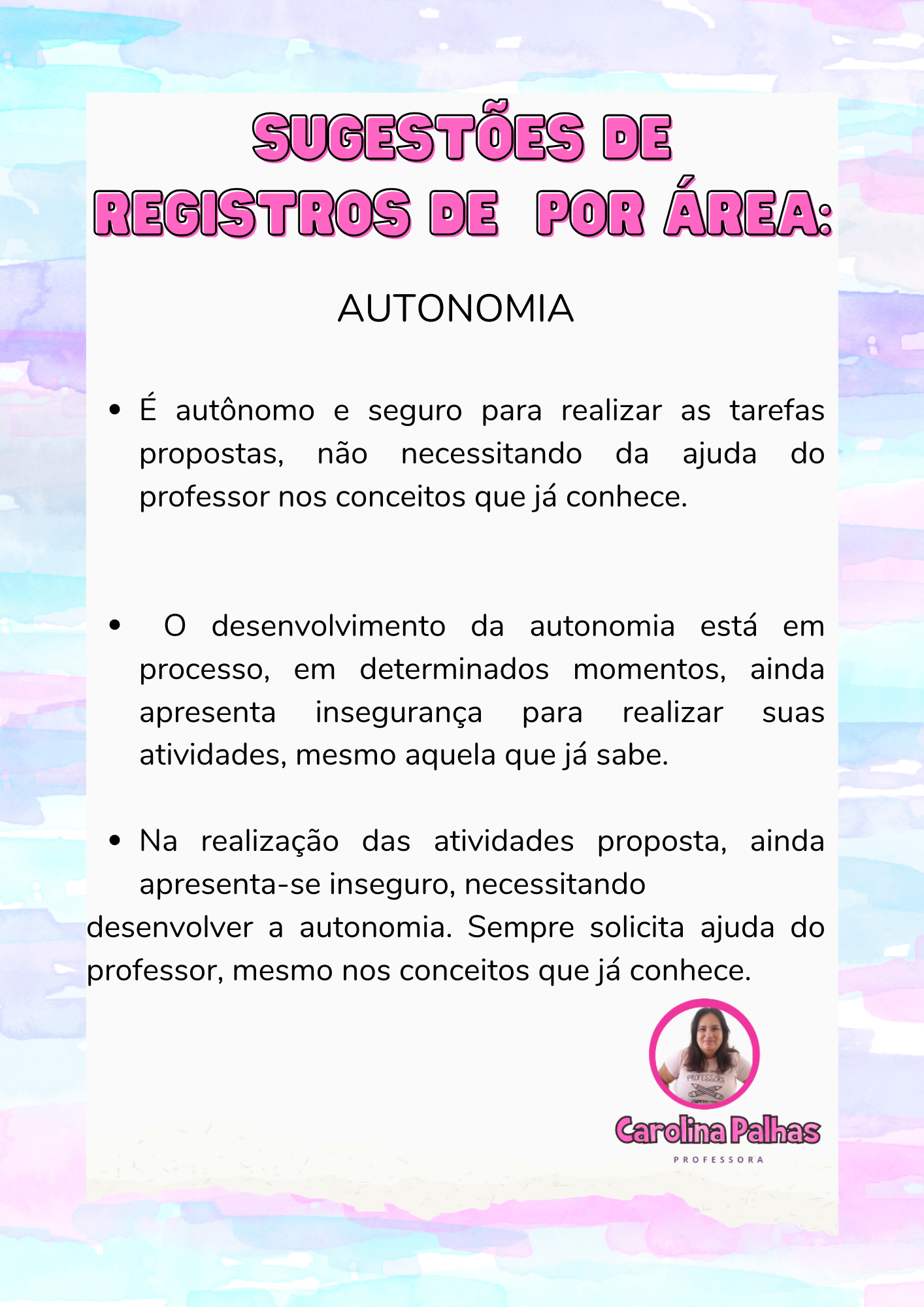 • O desenvolvimento da autonomia está em processo, em determinados momentos, ainda apresenta insegurança para realizar suas atividades, mesmo aquela que já sabe.