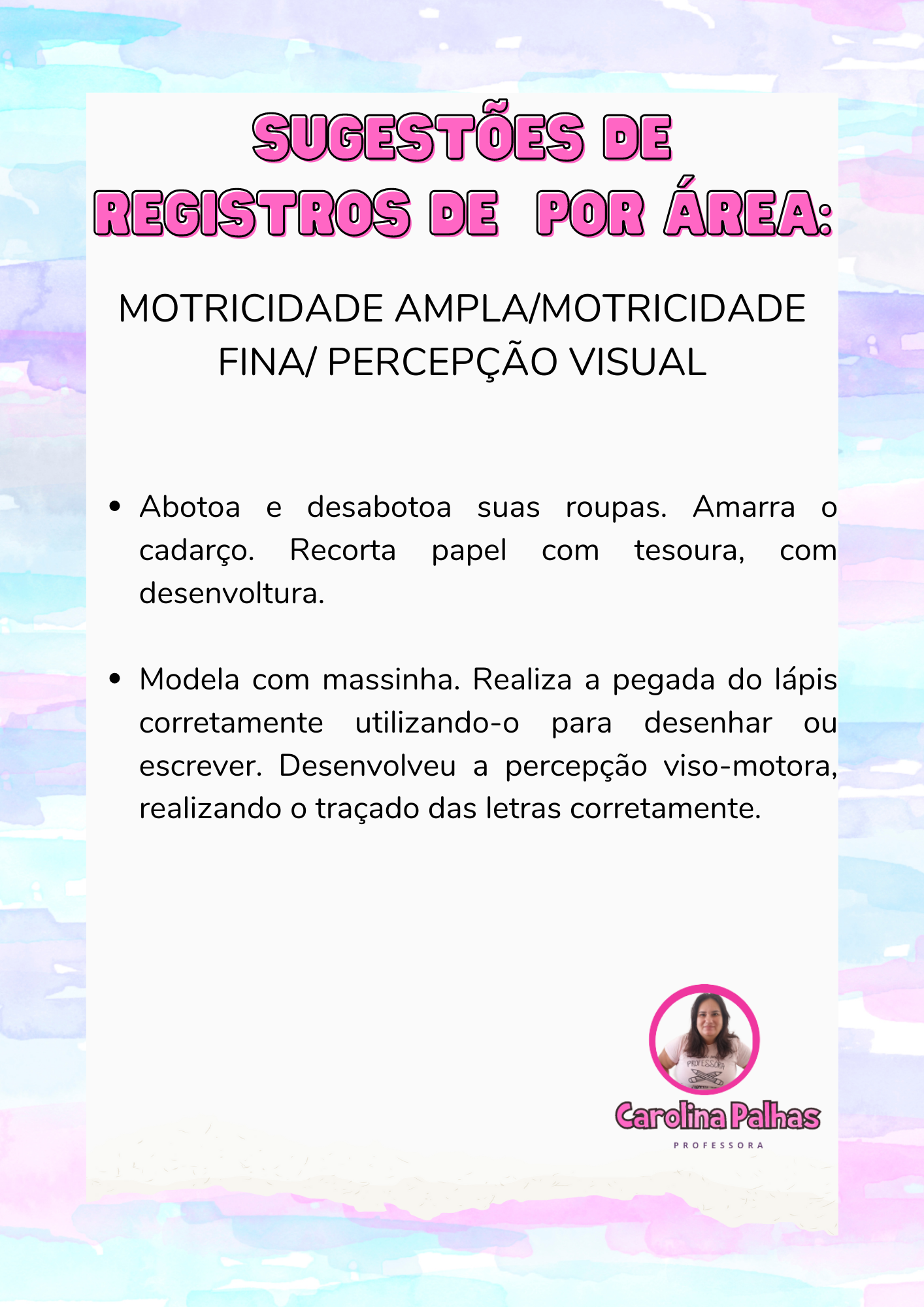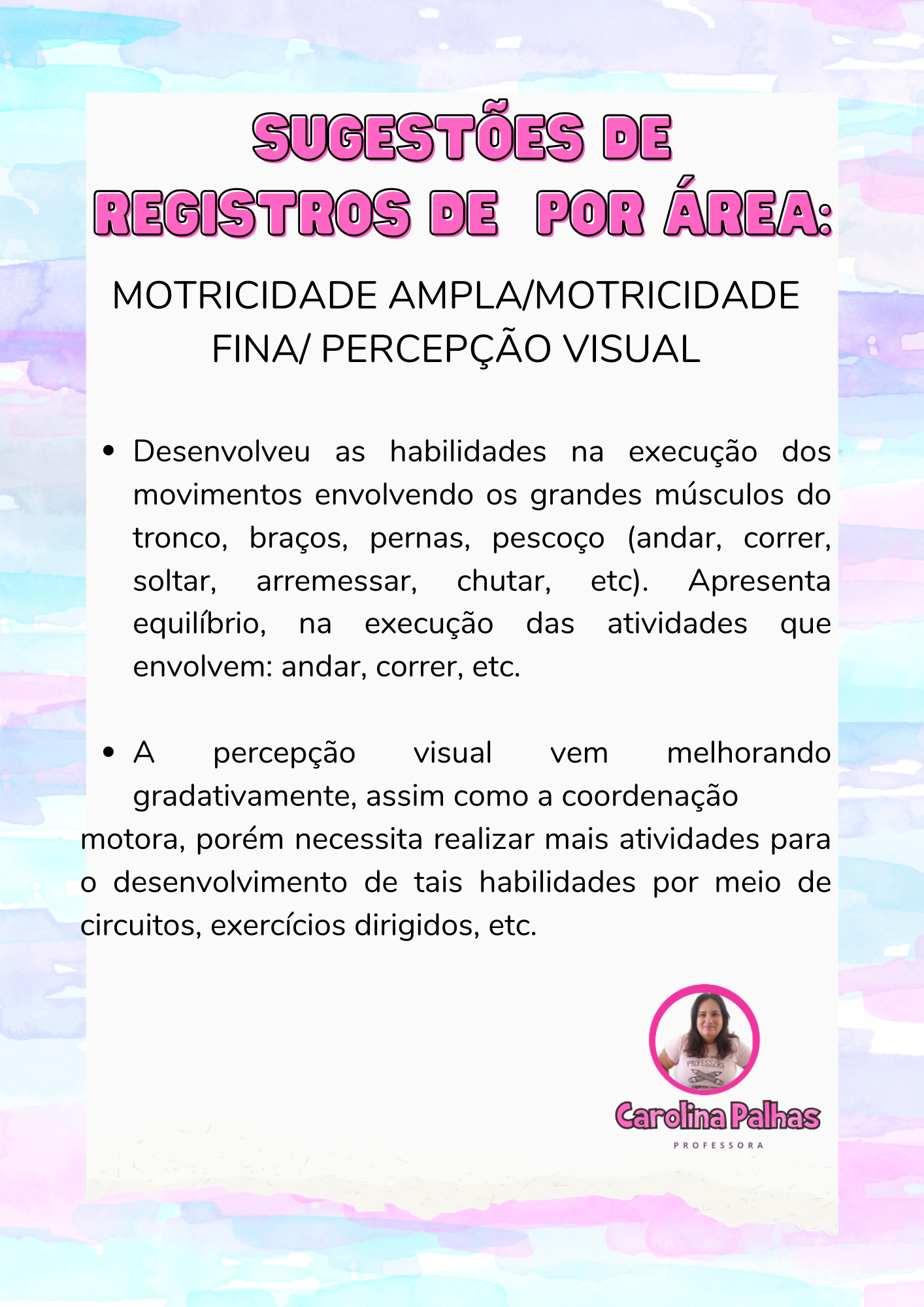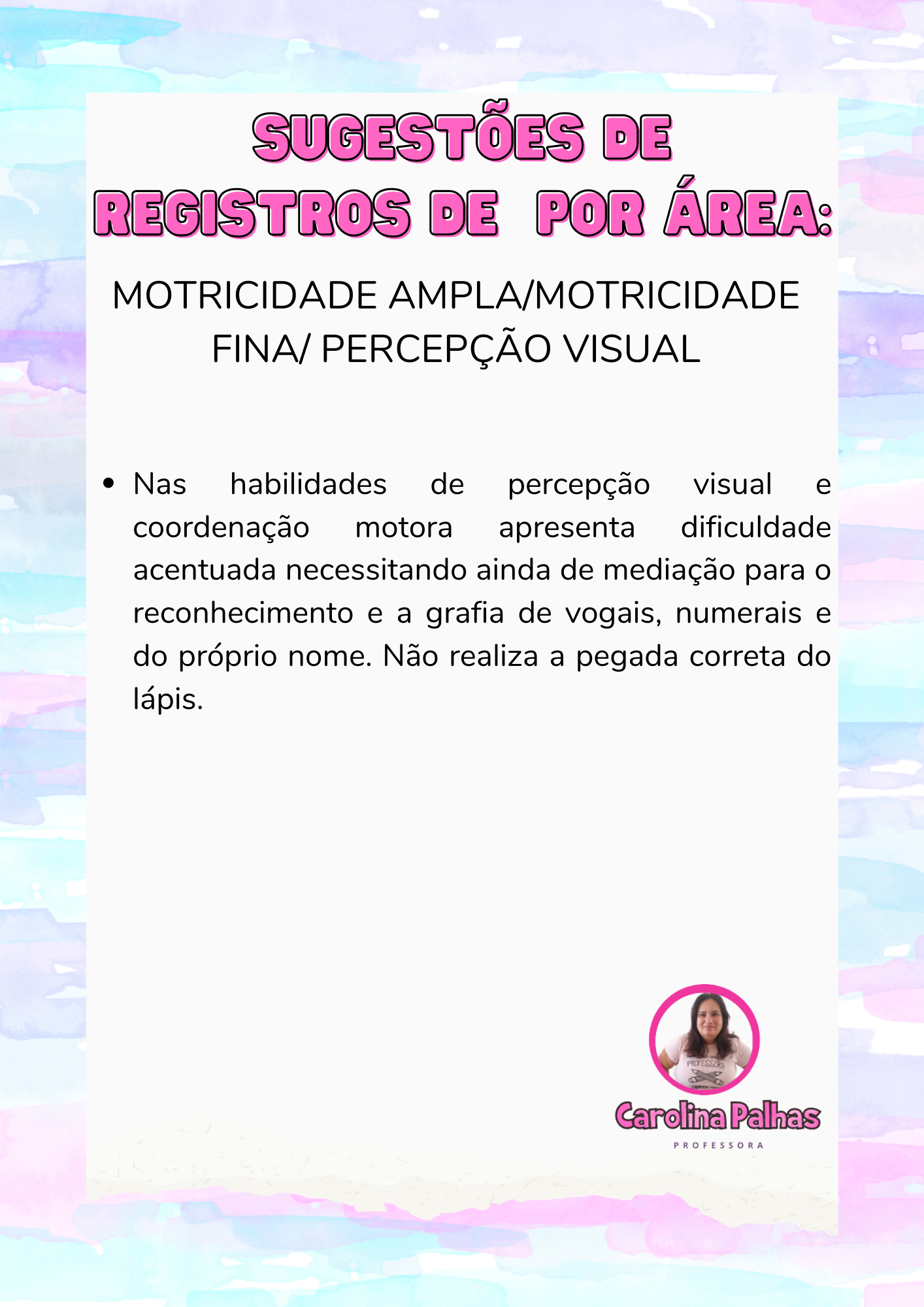 • A percepção visual vem melhorando gradativamente, assim como a coordenação motora, porém necessita realizar mais atividades para o desenvolvimento de tais habilidades por meio de circuitos, exercícios dirigidos, etc.
