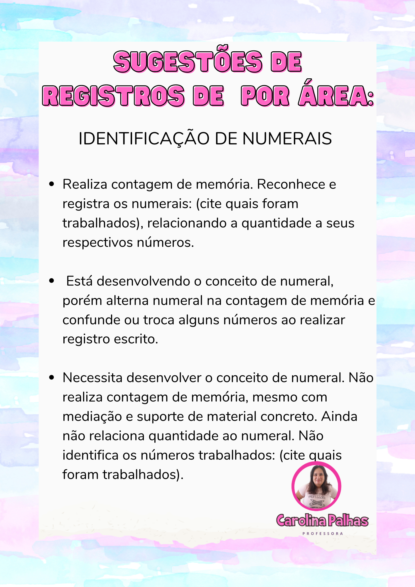 • Necessita desenvolver o conceito de numeral. Não realiza contagem de memória, mesmo com mediação e suporte de material concreto. Ainda não relaciona quantidade ao numeral. Não identifica os números trabalhados: (cite quais foram trabalhados).