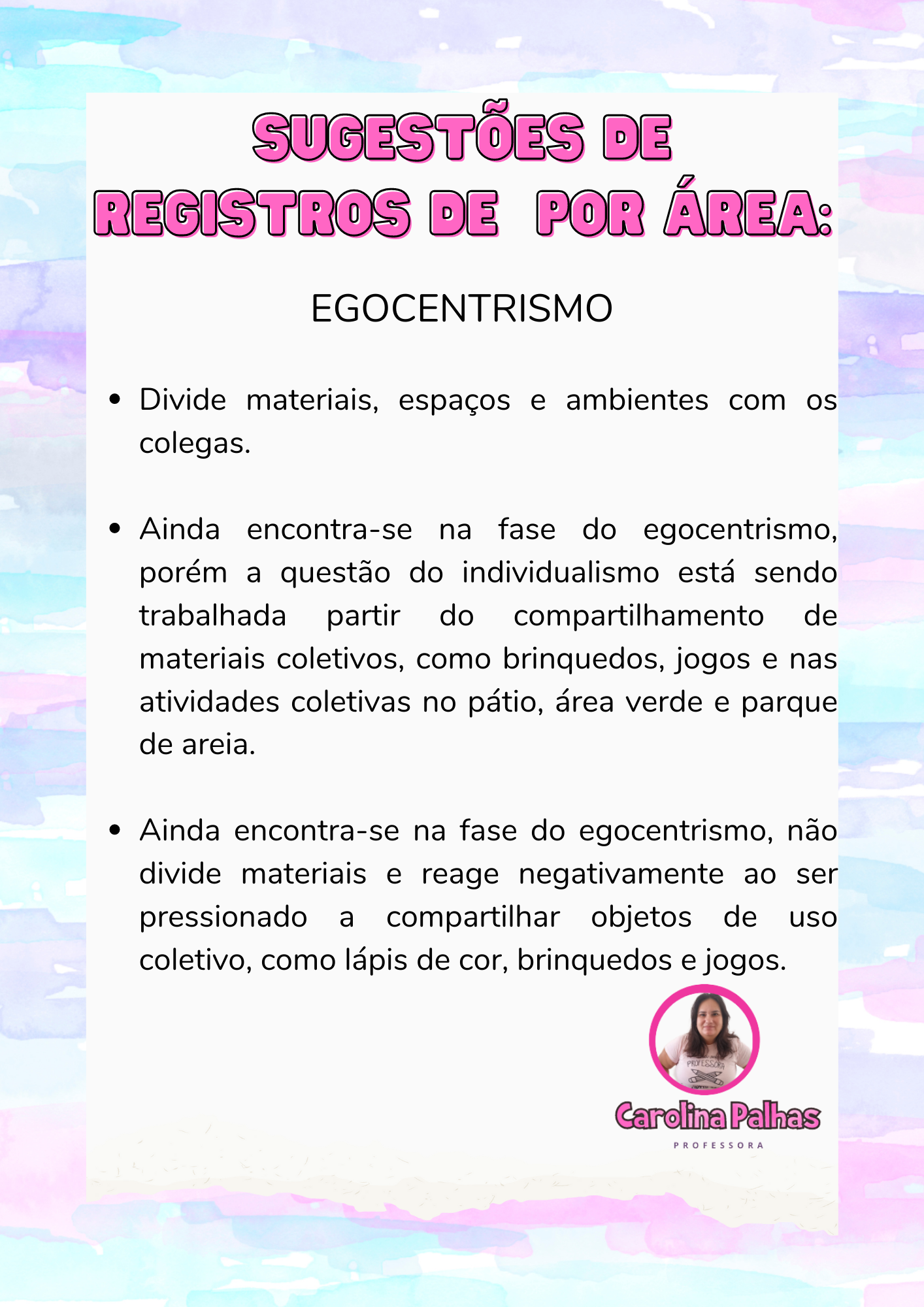 • Ainda encontra-se na fase do egocentrismo, não divide materiais e reage negativamente ao ser pressionado a compartilhar objetos de uso coletivo, como lápis de cor, brinquedos e jogos.