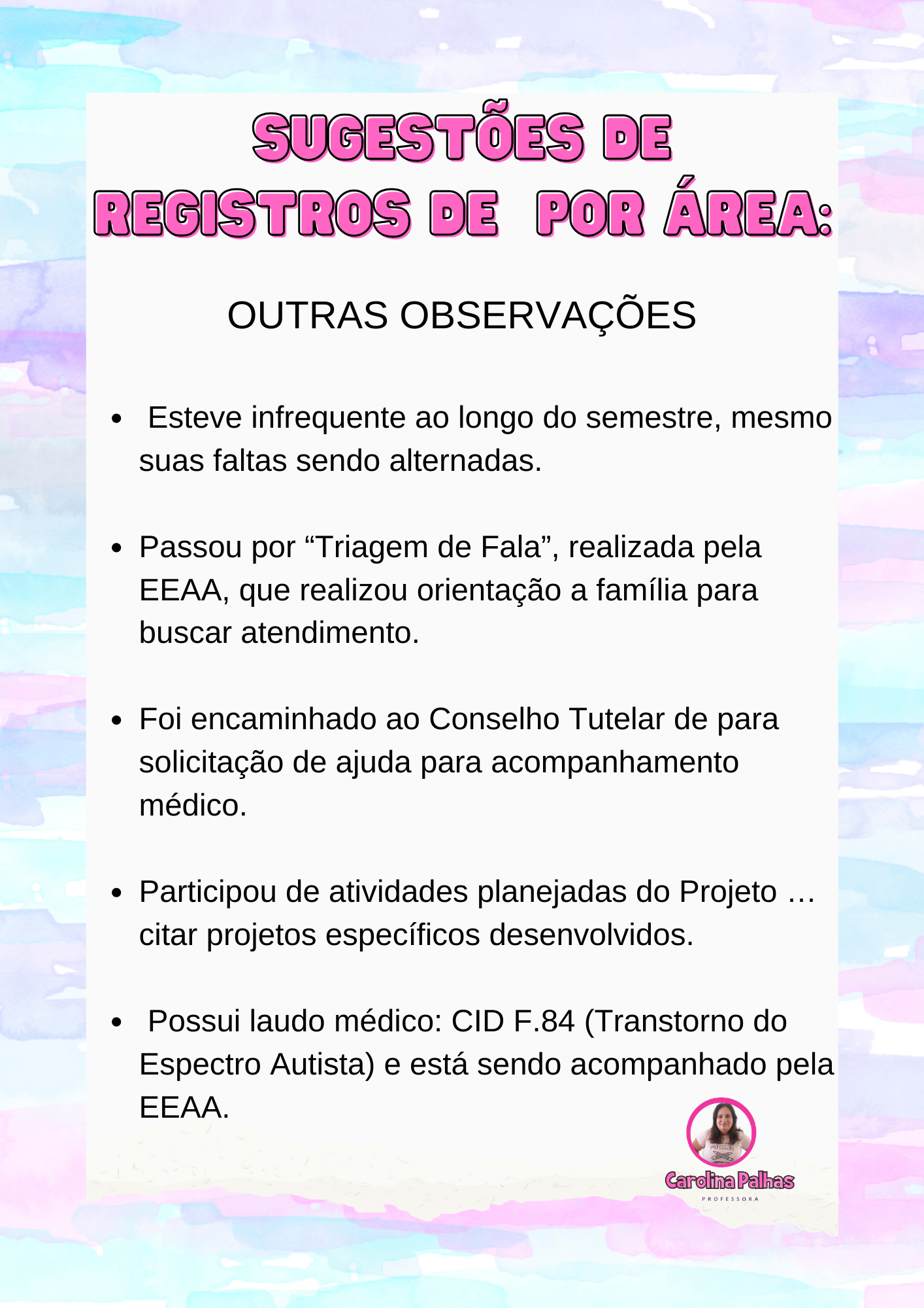 SUGESTÕES DE REGISTROS DE POR ÁREA: