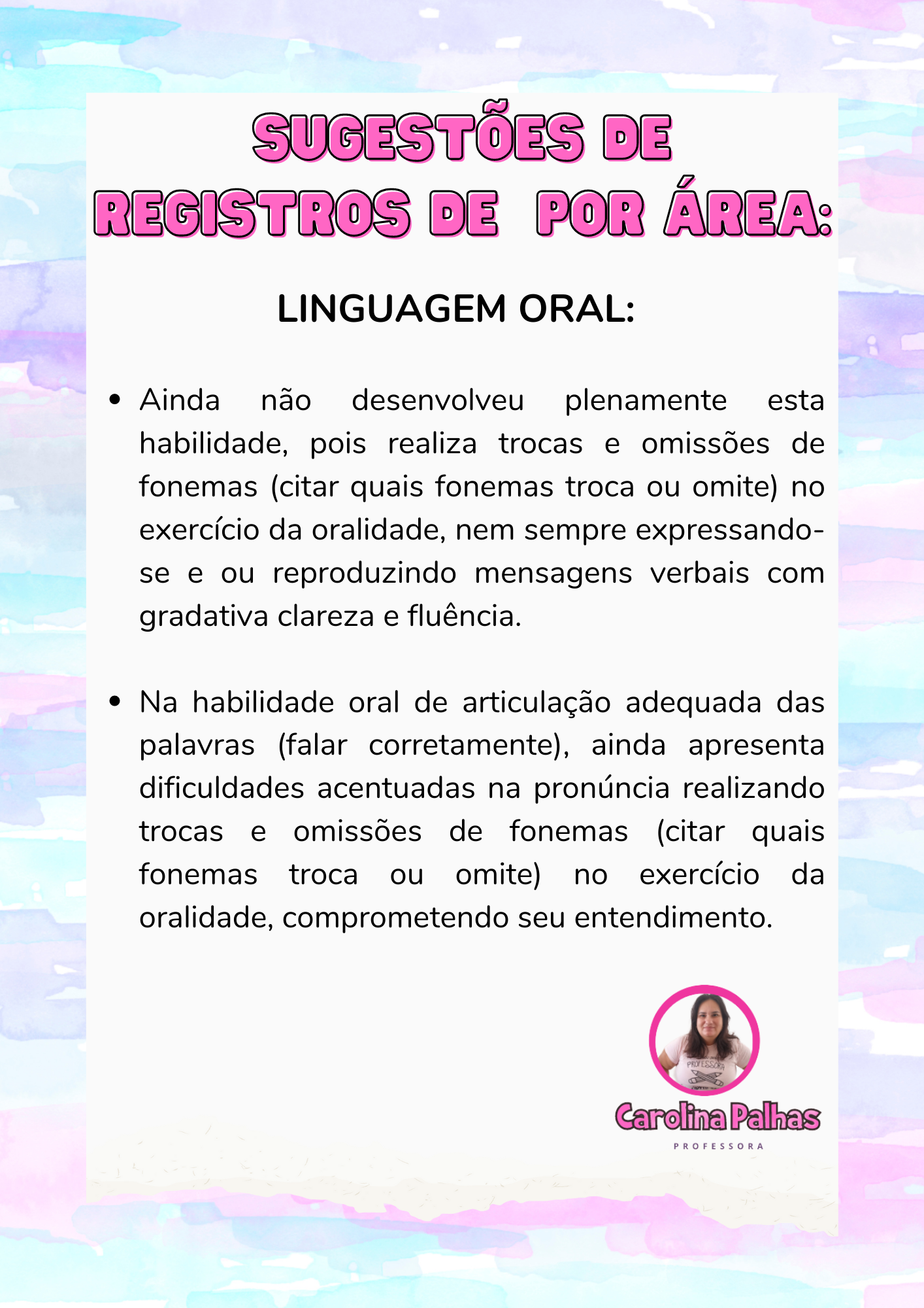 • Na linguagem oral, na aquisição paulatina das habilidades básicas necessárias à produção e emissão correta de fonemas, ainda não desenvolveu plenamente esta habilidade, pois realiza trocas e omissões de fonemas (citar quais fonemas troca ou omite) no exercício da oralidade, nem sempre expressando-se e ou Correta de fonemas.