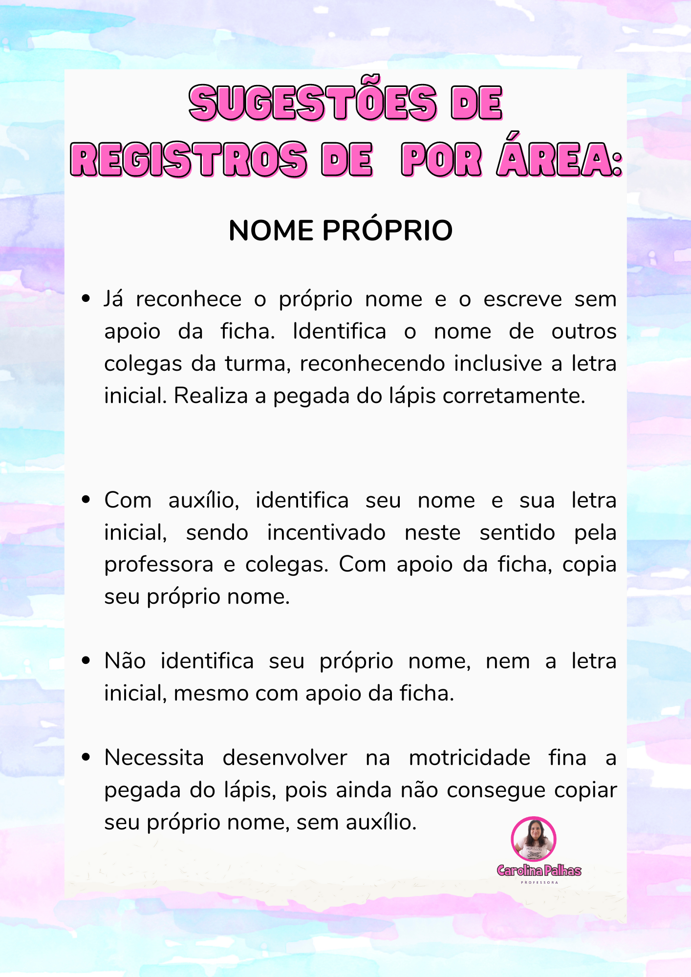 • Necessita desenvolver na motricidade fina a pegada do lápis, pois ainda não consegue copiar seu próprio nome, sem auxílio.