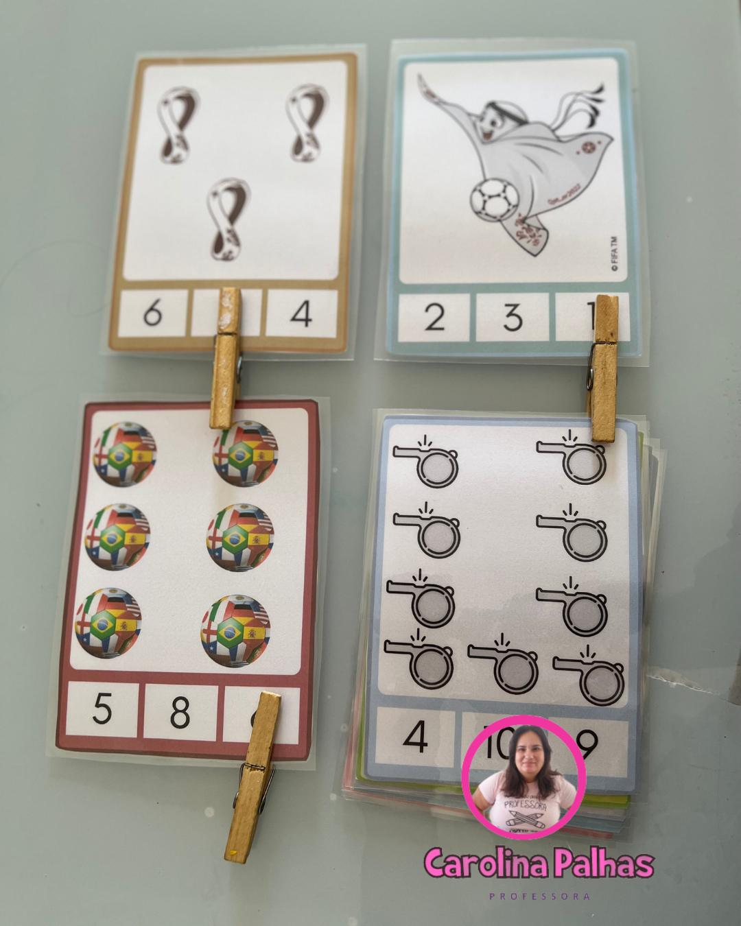 Atividade de número e quantidade utilizando pregador com o tema Copa do mundo