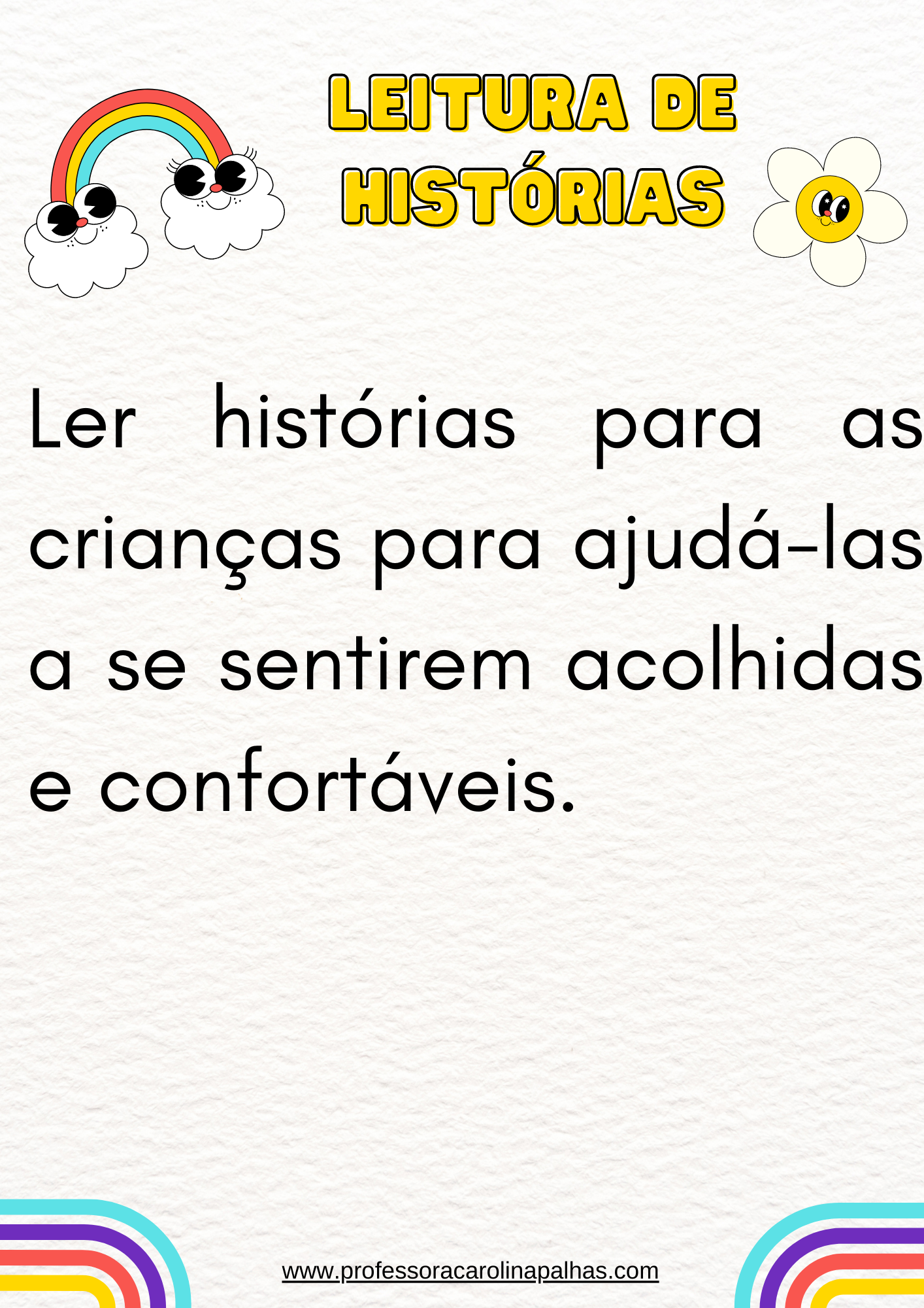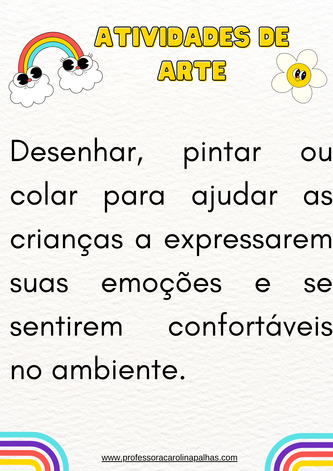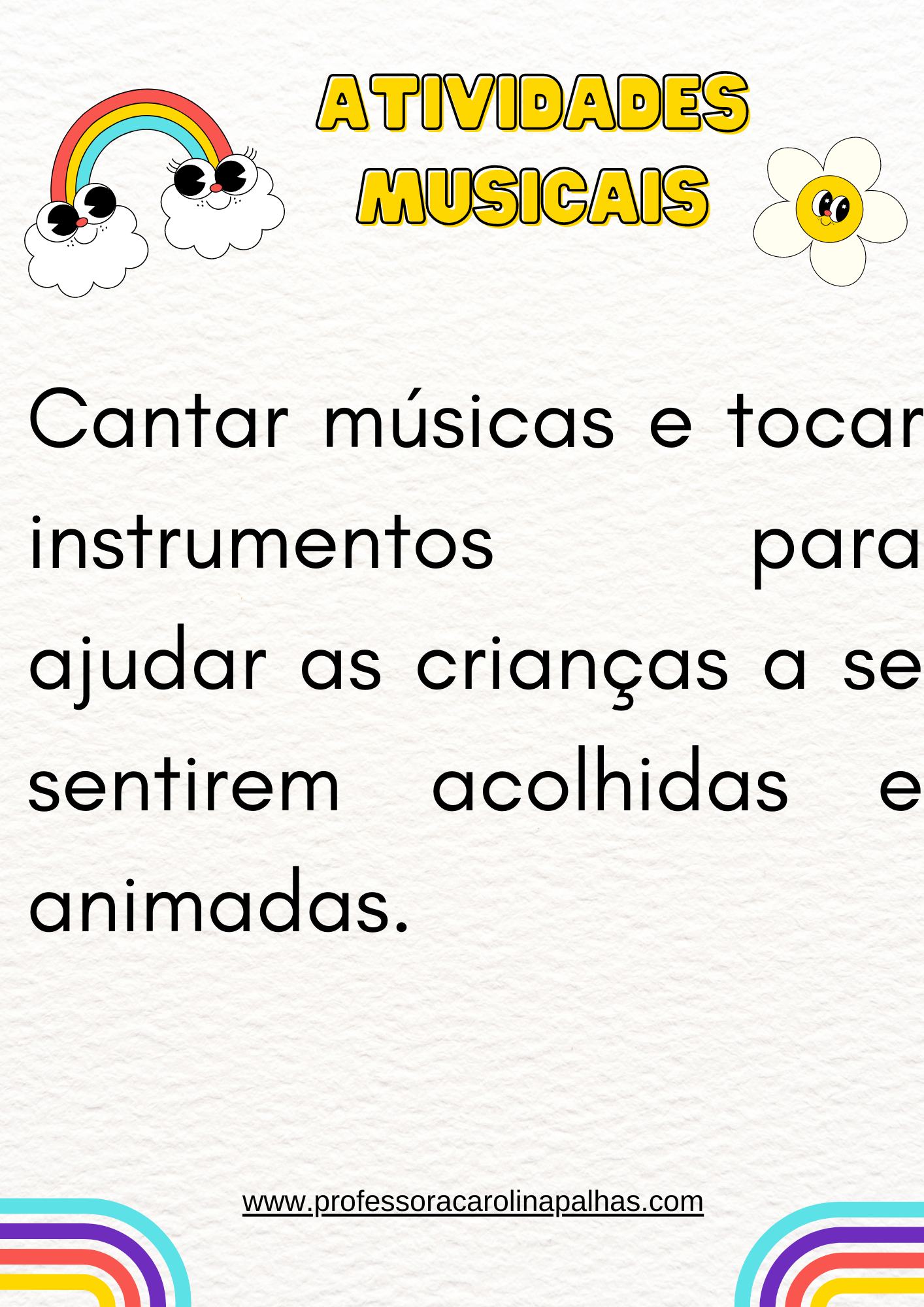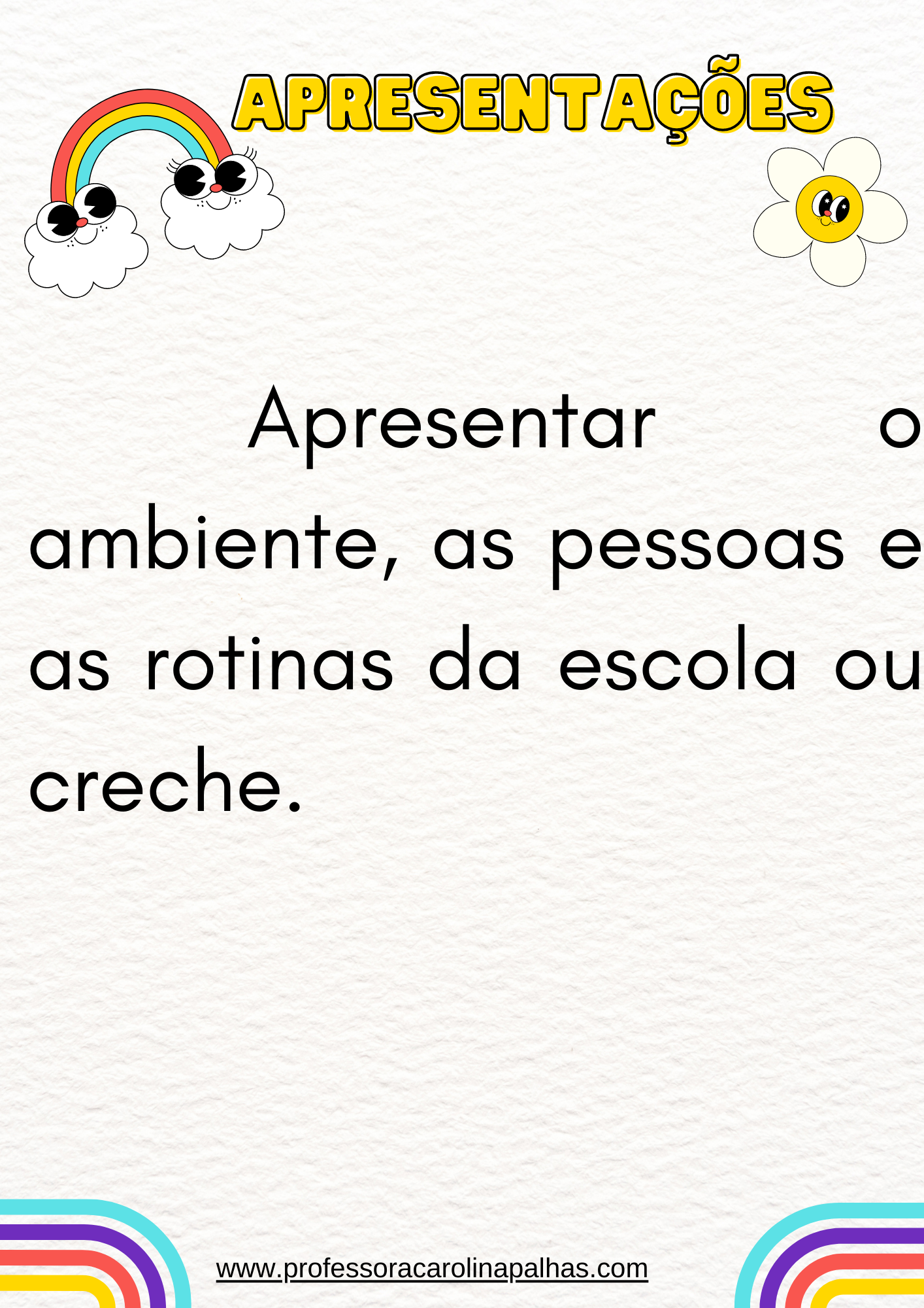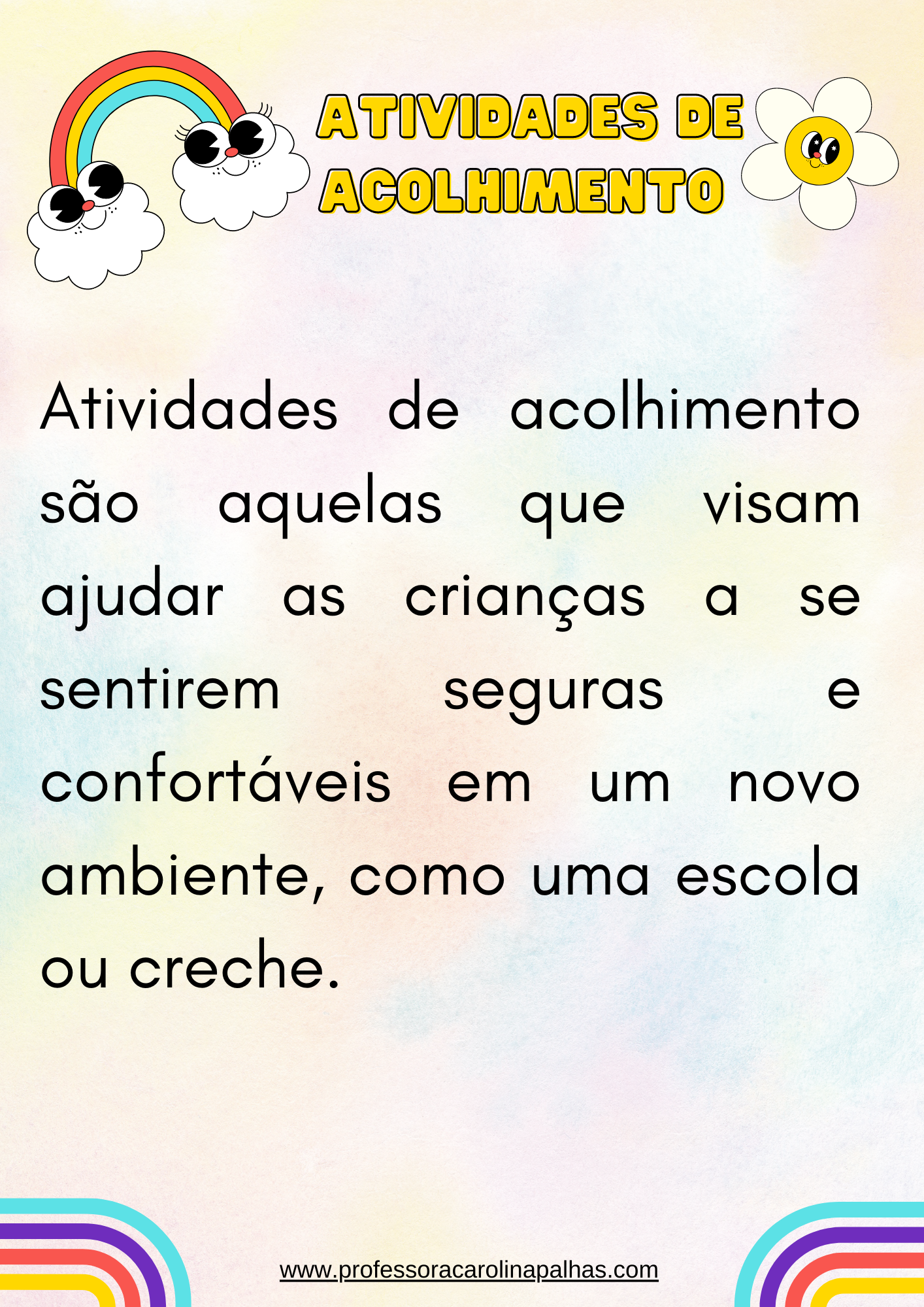 As atividades de acolhimento podem incluir a apresentação dos professores e funcionários, a explicação dos objetivos do programa de ensino, a apresentação das regras e rotinas da instituição, entre outras atividades que visem ajudar as crianças a se sentirem à vontade e integradas na nova escola.