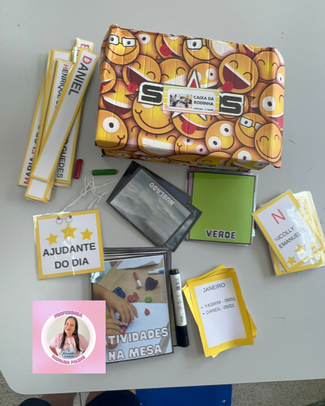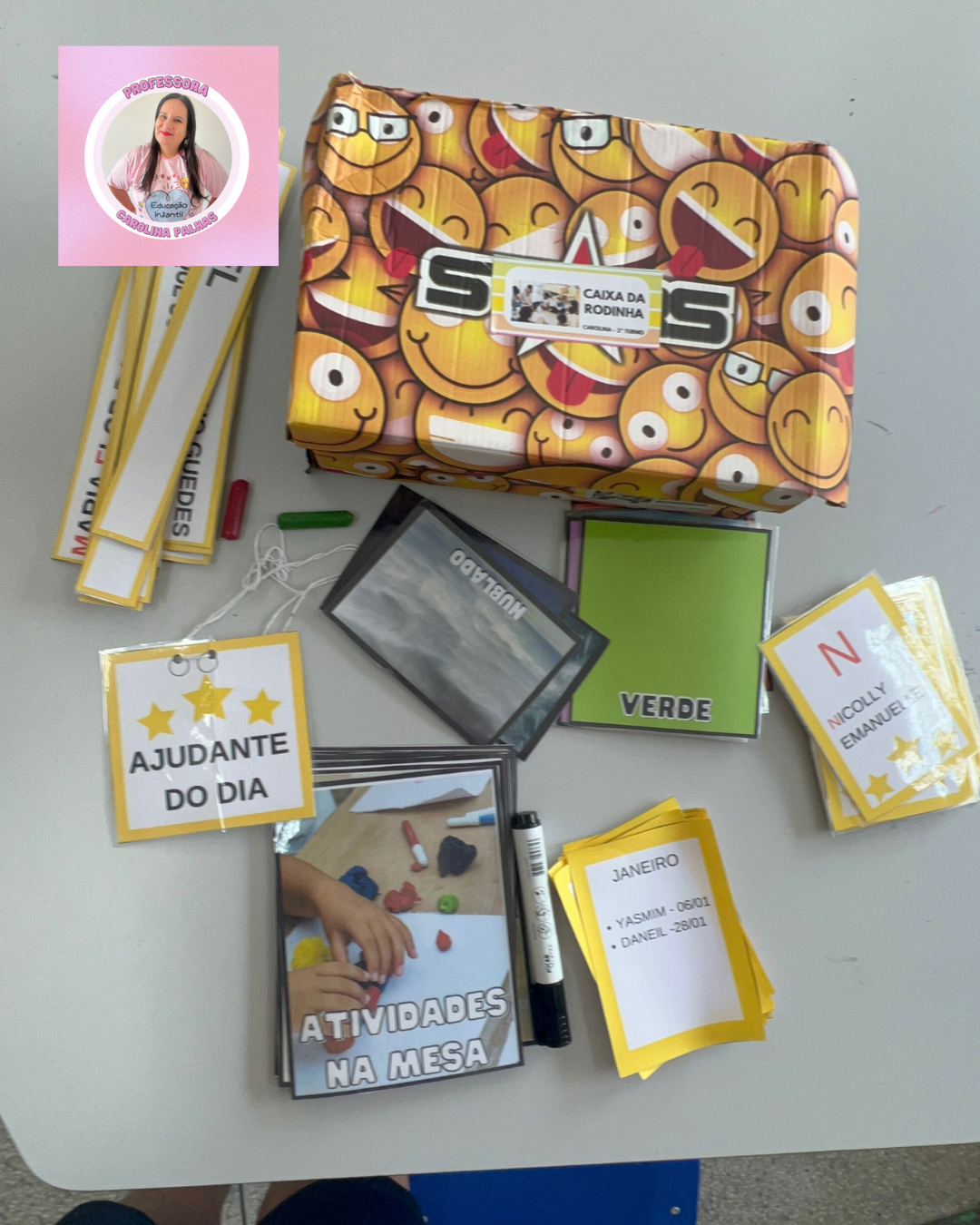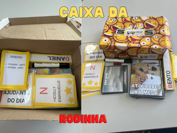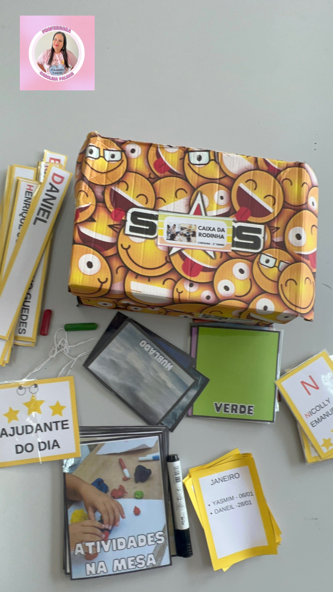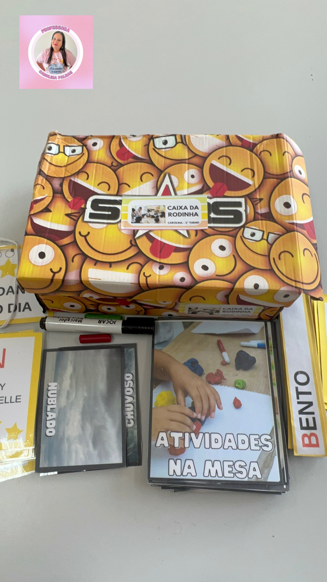 Para facilitar,eu uso caixa decorada onde eu coloco tudo que vou precisar para fazer a rodinha (chamadinha, coisas da janelinha do tempo, cartaz de ajudantes )