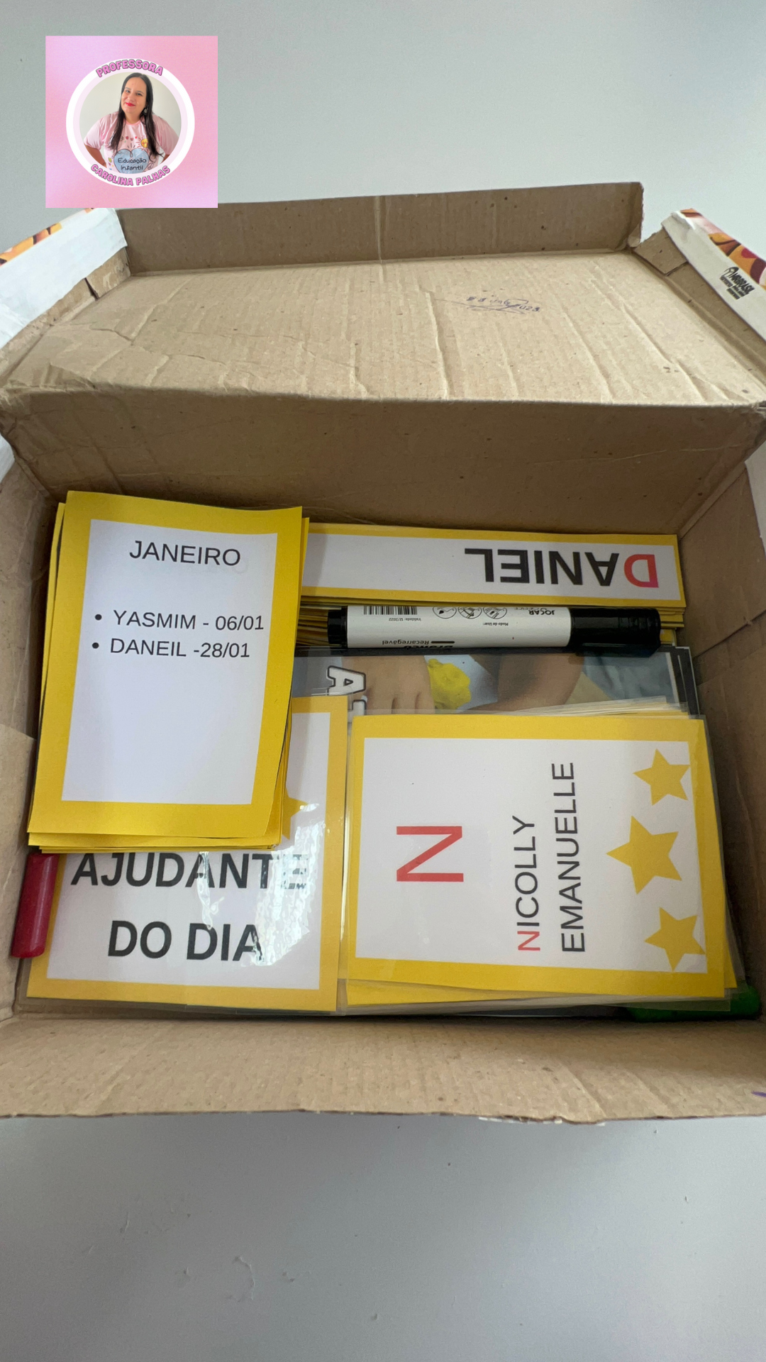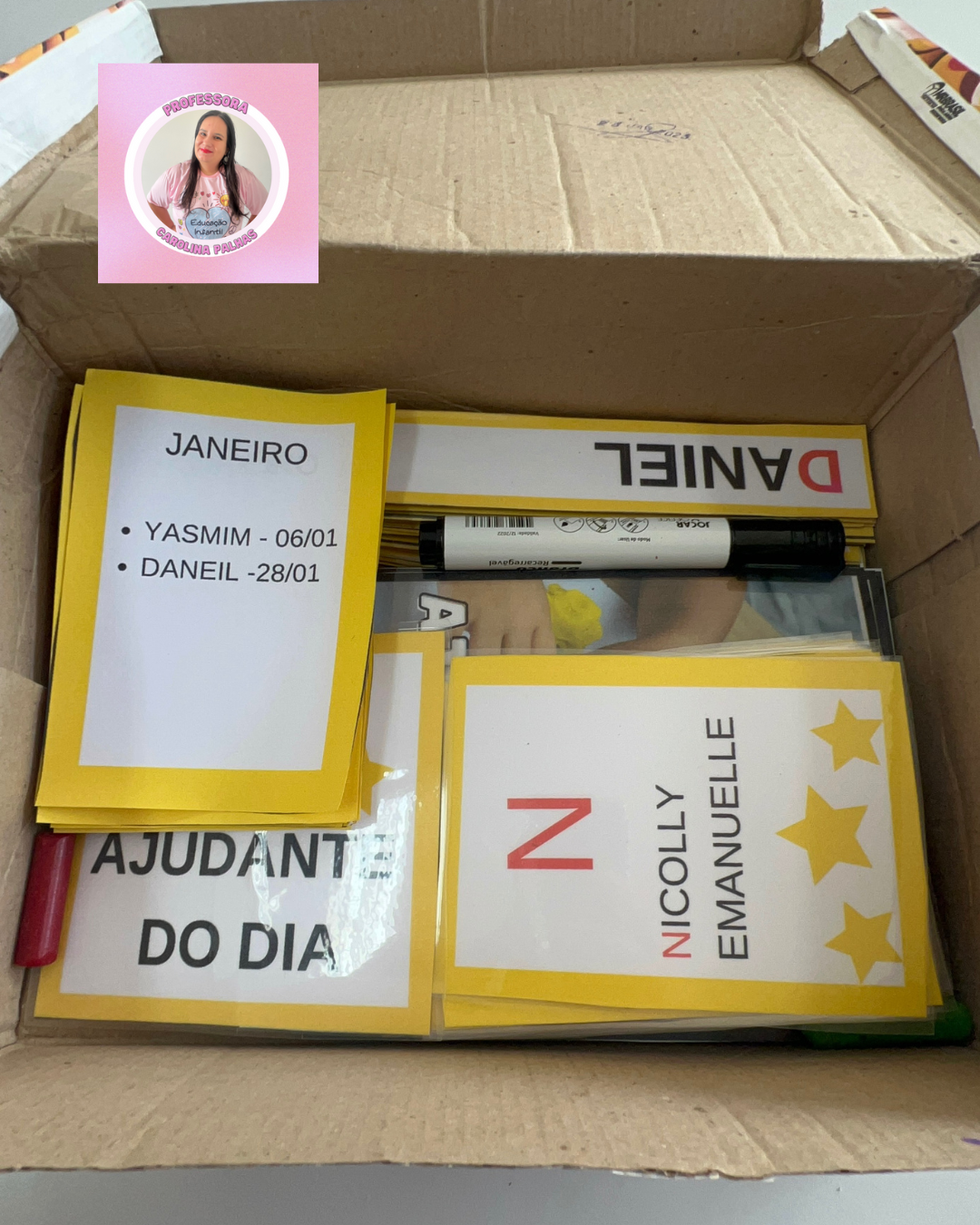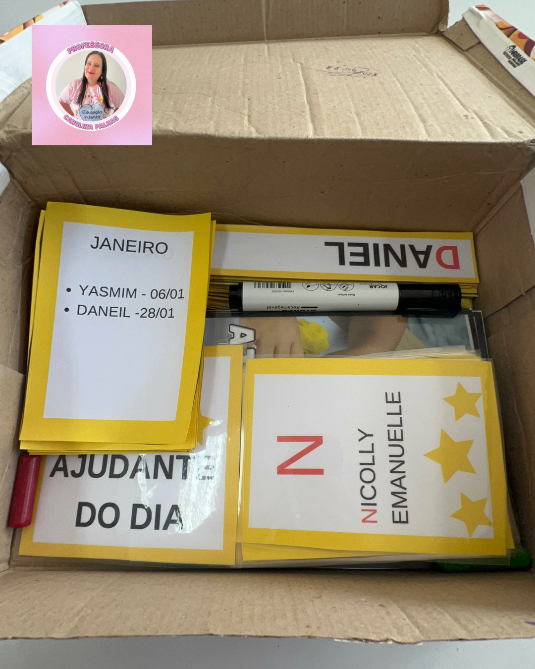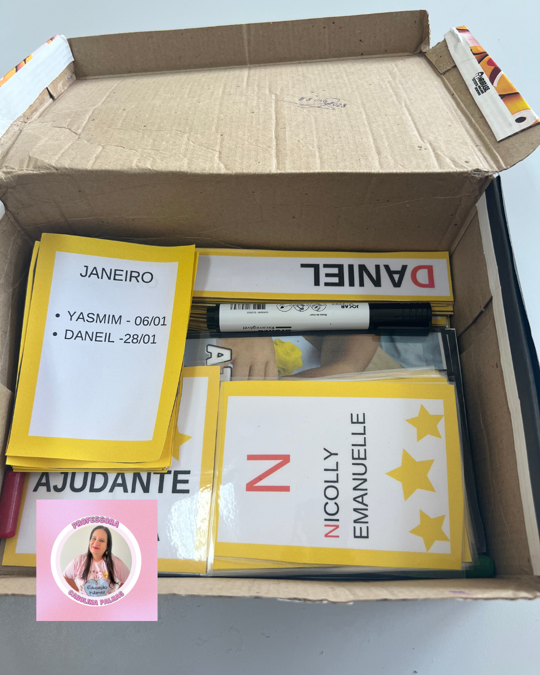 Para facilitar,eu uso caixa decorada onde eu coloco tudo que vou precisar para fazer a rodinha (chamadinha, coisas da janelinha do tempo, cartaz de ajudantes )