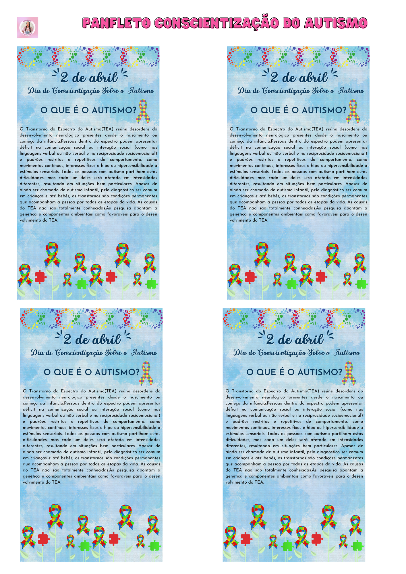 Planfleto Dia Mundial de Conscientização Sobre o Autismo