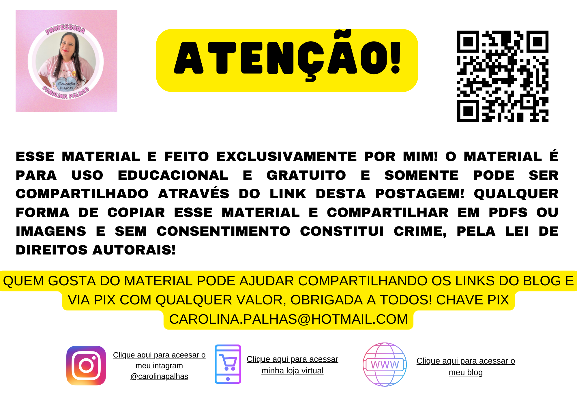 OBSERVAÇÃO: Esse material é feito exclusivamente por mim! O material é para uso educacional e gratuito e somente pode ser compartilhado através do link desta postagem! Qualquer forma de copiar esse material e compartilhar em PDFS ou imagens e sem consentimento constitui crime, pela lei de direitos autorais!