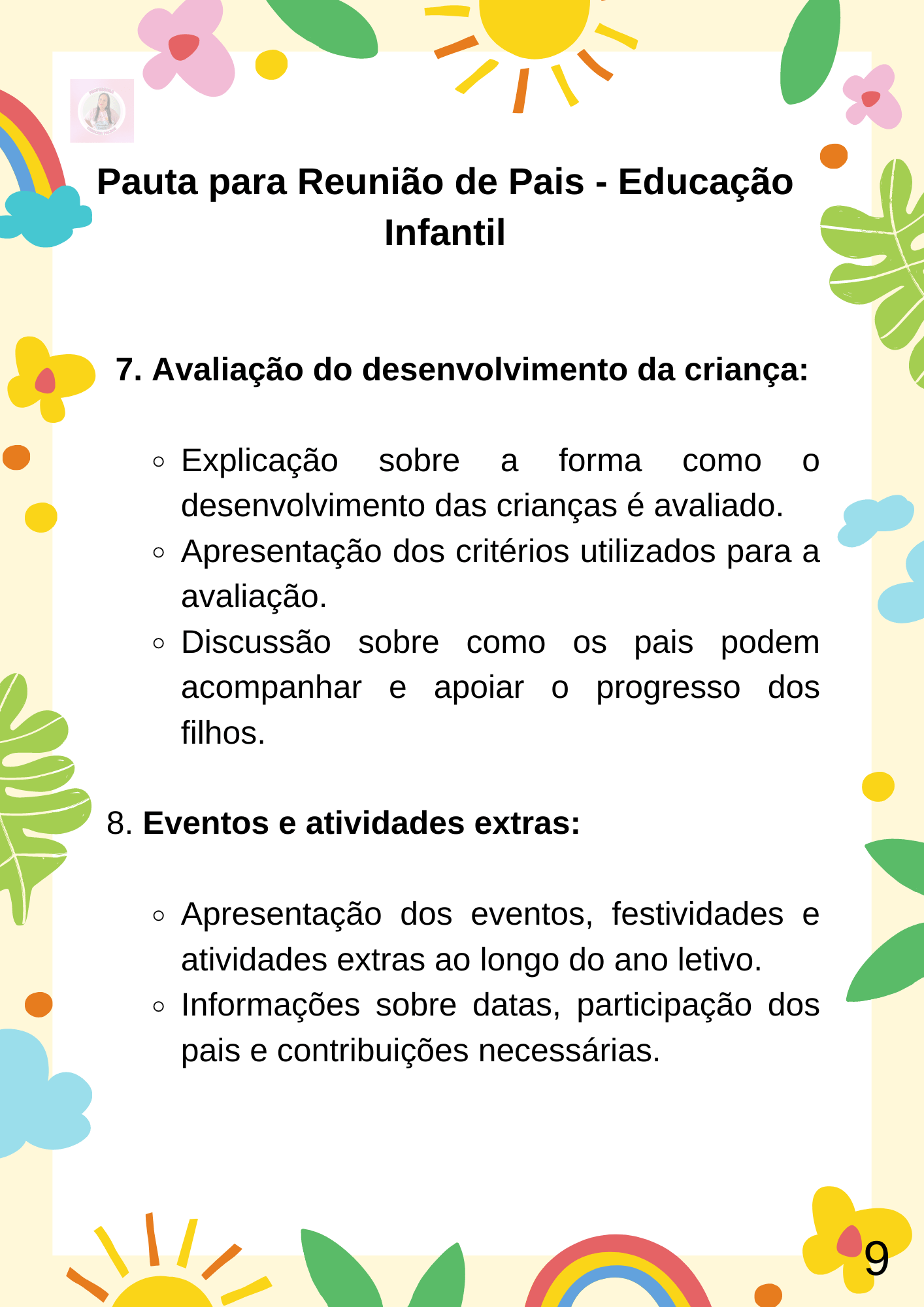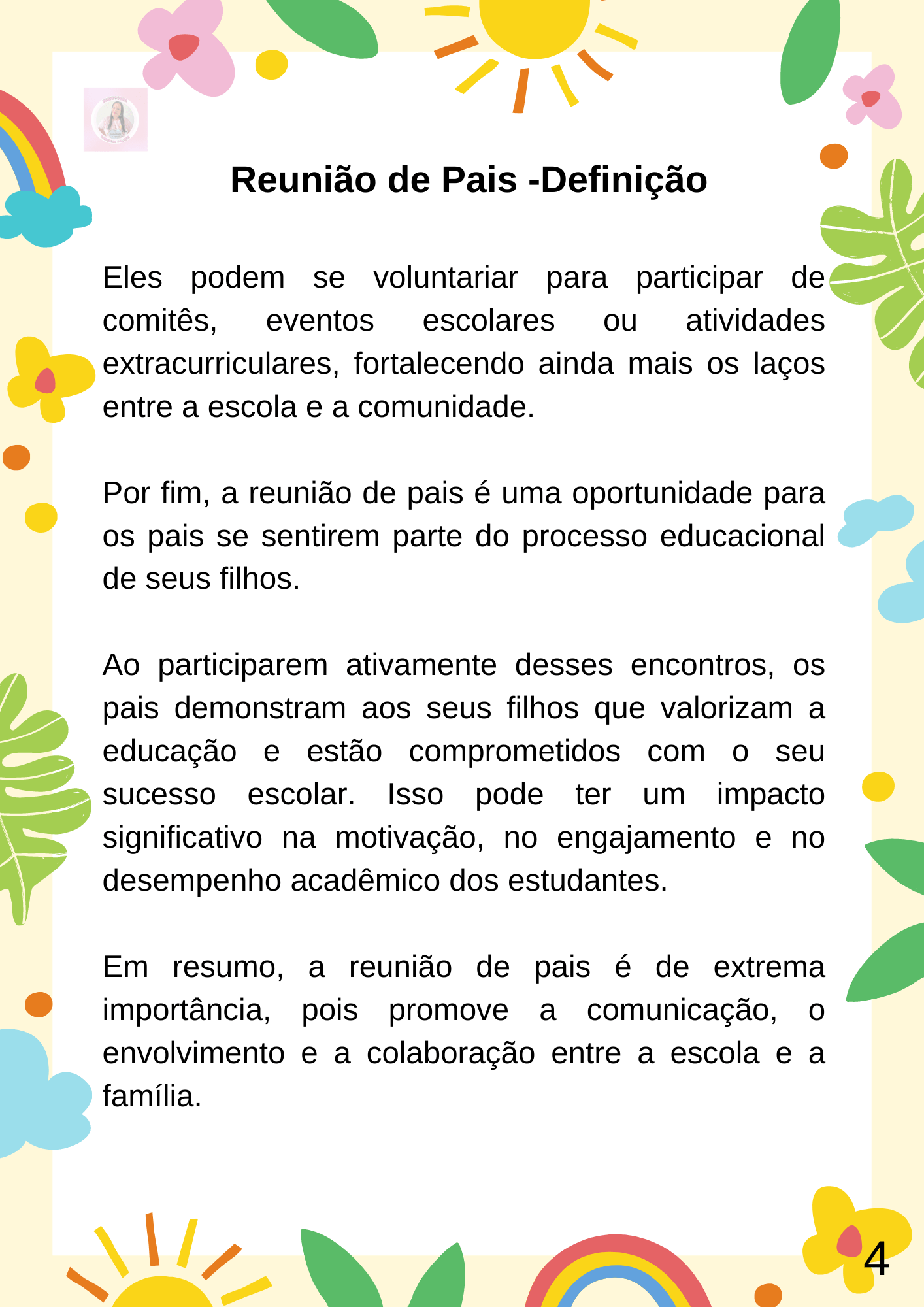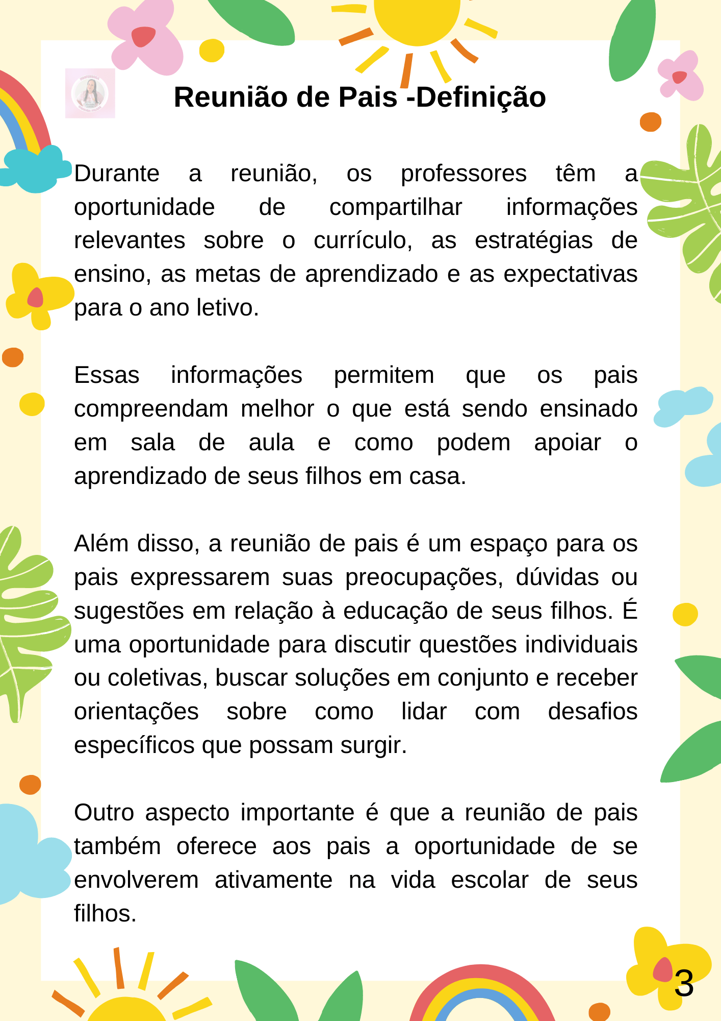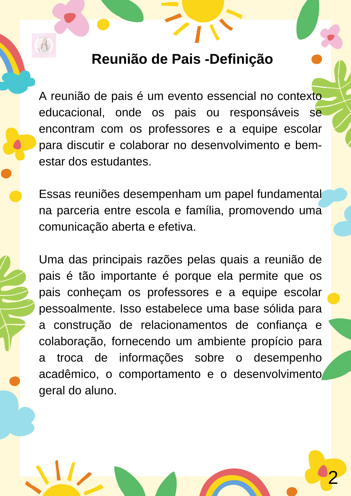 Em resumo, a reunião de pais é de extrema importância, pois promove a comunicação, o envolvimento e a colaboração entre a escola e a família. Ela fornece uma plataforma para o compartilhamento de informações, o estabelecimento de metas comuns e o apoio mútuo no processo educativo das crianças. Ao participar ativamente dessas reuniões, os pais demonstram seu compromisso com a educação e contribuem para o sucesso acadêmico e pessoal de seus filhos.