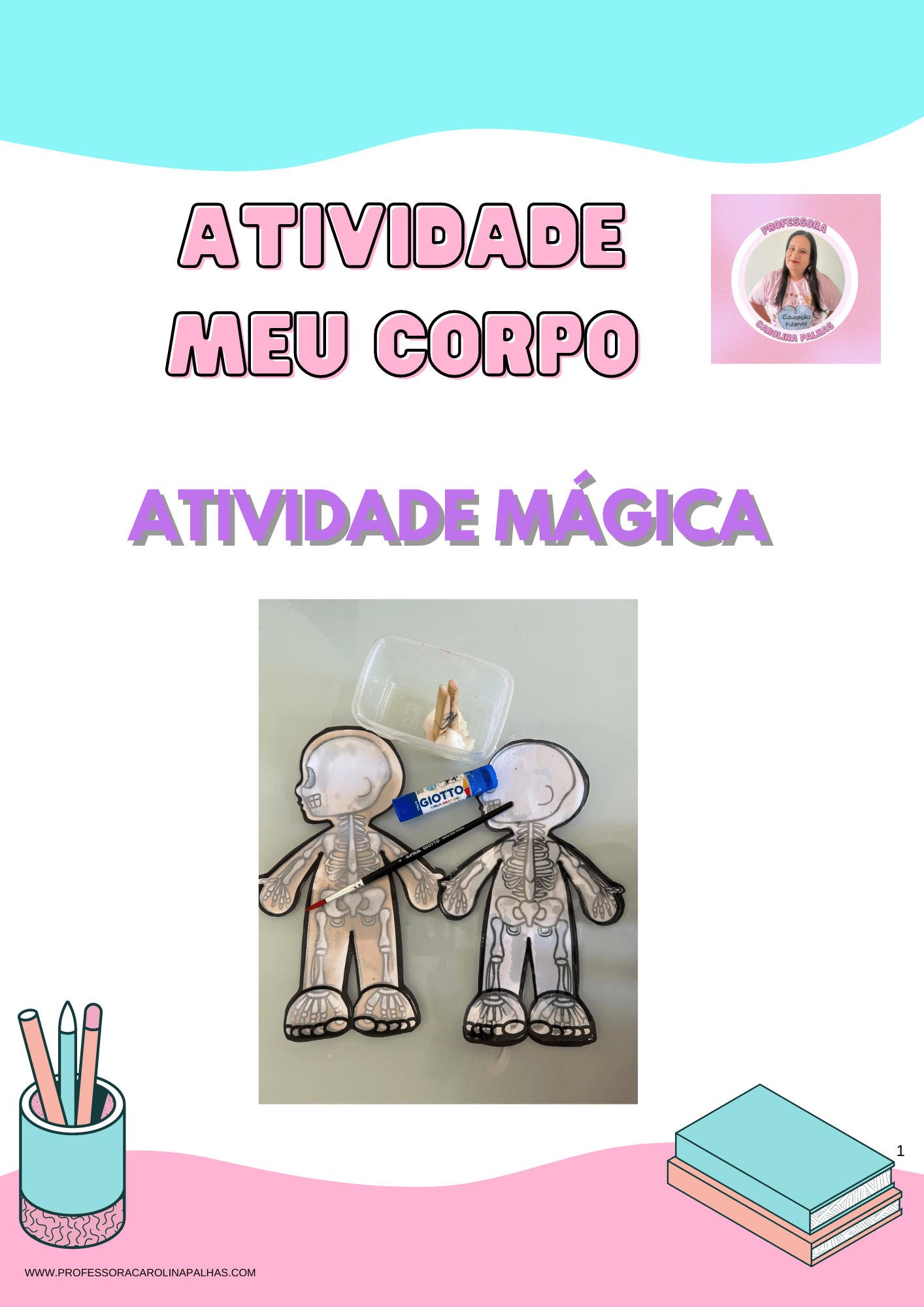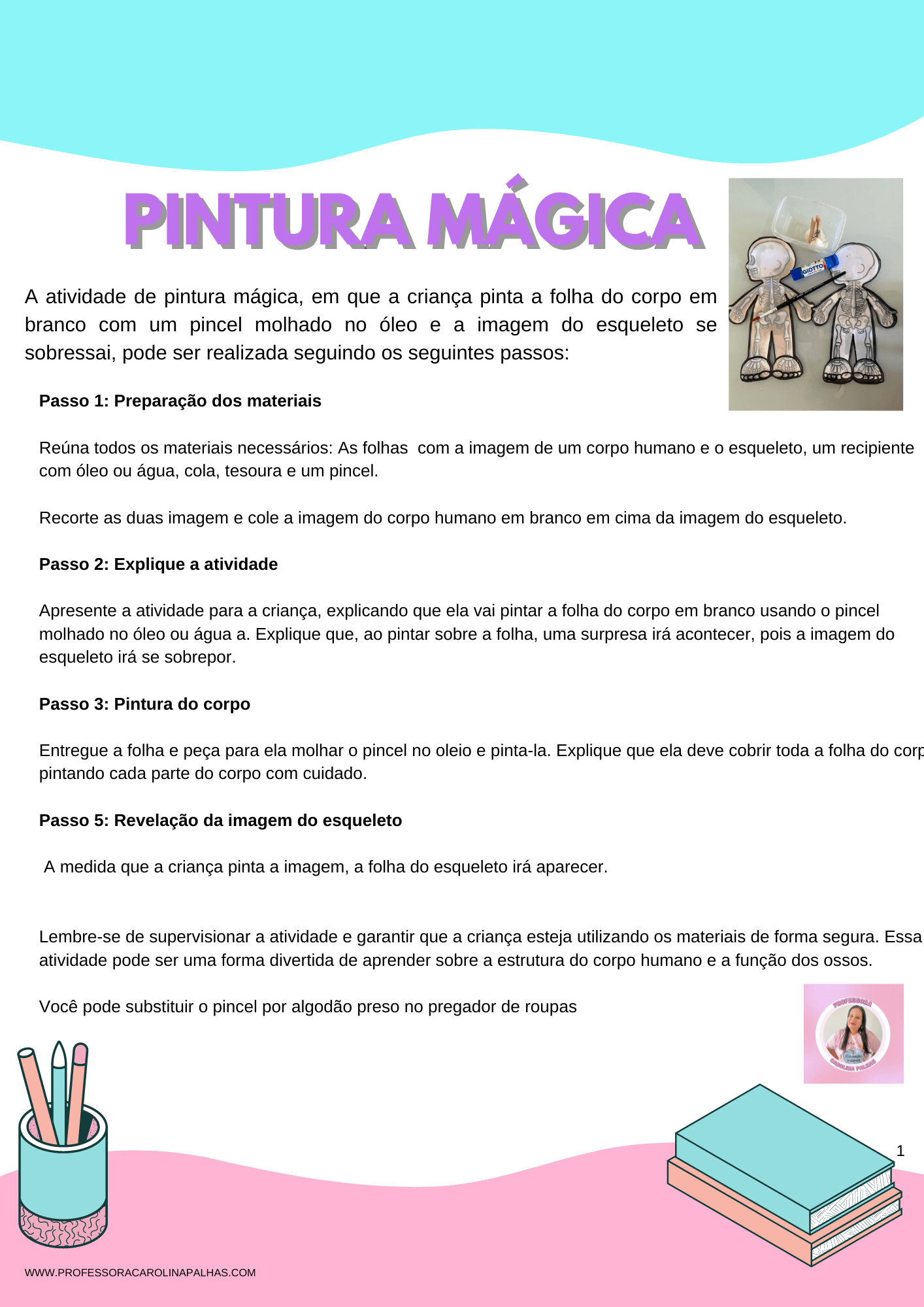 A atividade de pintura mágica, em que a criança pinta a folha do corpo em branco com um pincel molhado no óleo e a imagem do esqueleto se sobressai, pode ser realizada seguindo os seguintes passos: