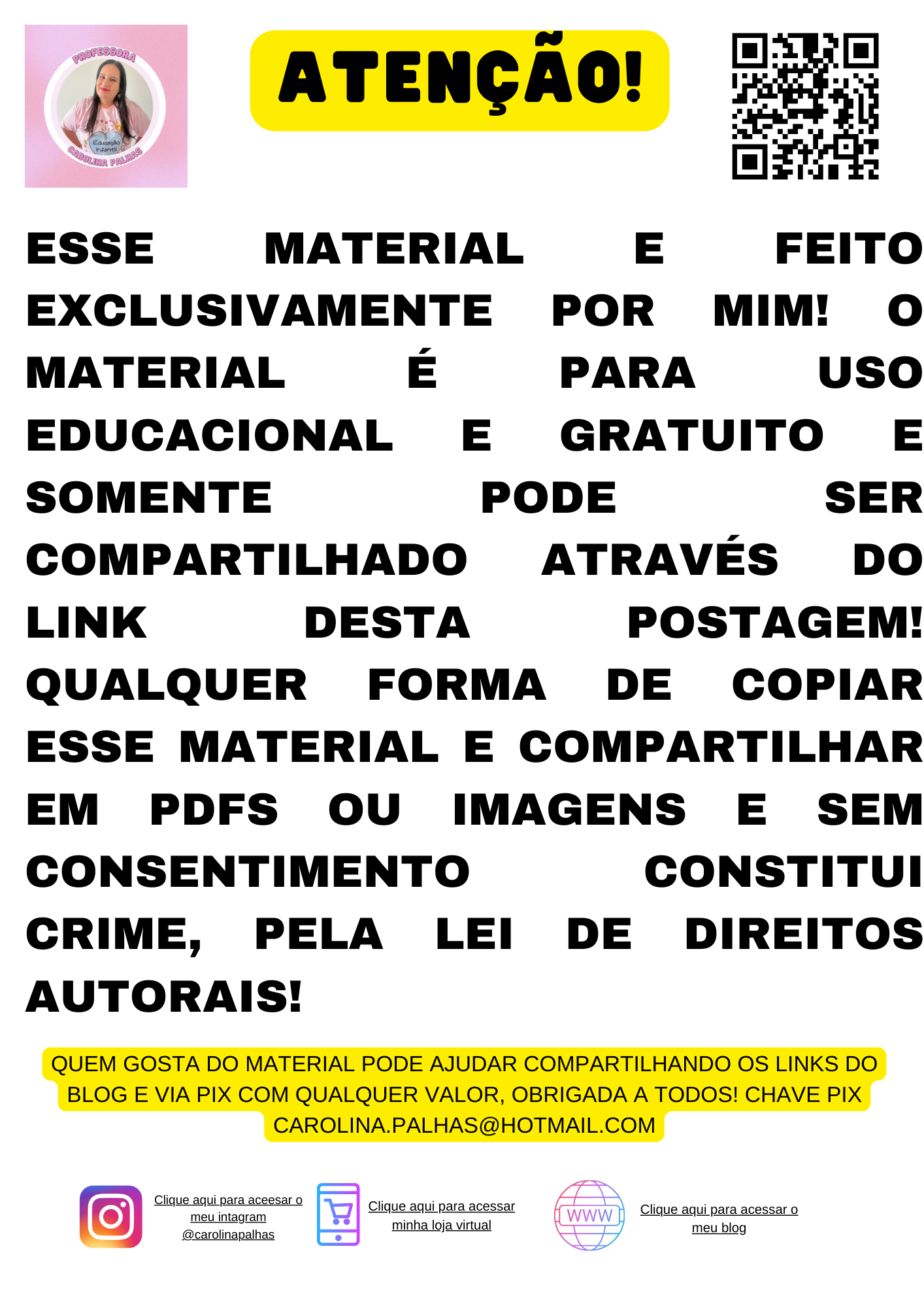 OBSERVAÇÃO: Esse material é feito exclusivamente por mim! O material é para uso educacional e gratuito e somente pode ser compartilhado através do link desta postagem! Qualquer forma de copiar esse material e compartilhar em PDFS ou imagens e sem consentimento constitui crime, pela lei de direitos autorais!