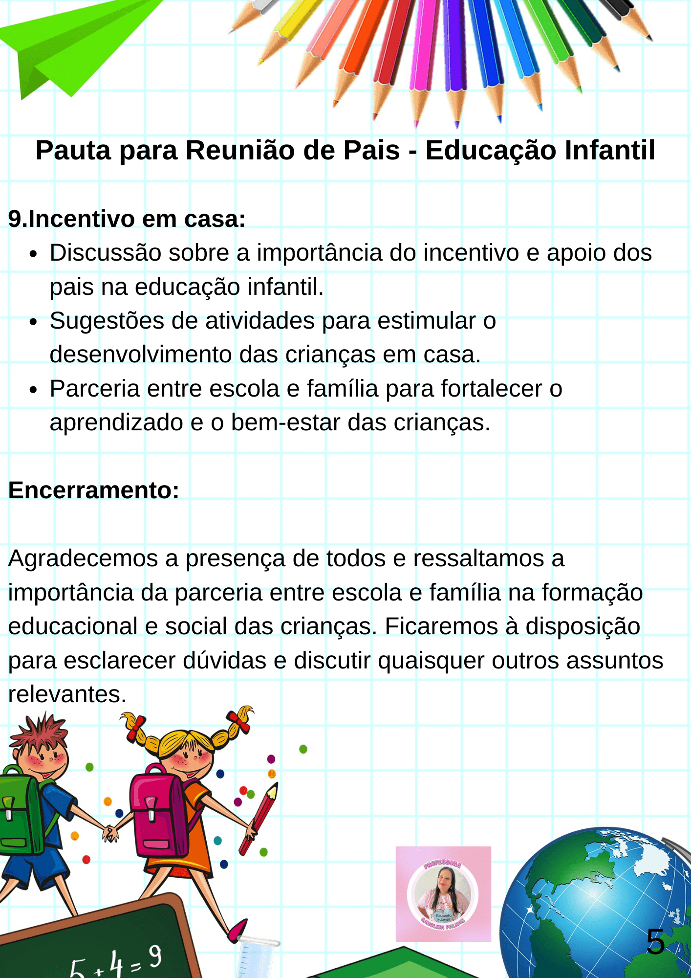 Em resumo, a reunião de pais é de extrema importância, pois promove a comunicação, o envolvimento e a colaboração entre a escola e a família. Ela fornece uma plataforma para o compartilhamento de informações, o estabelecimento de metas comuns e o apoio mútuo no processo educativo das crianças. Ao participar ativamente dessas reuniões, os pais demonstram seu compromisso com a educação e contribuem para o sucesso acadêmico e pessoal de seus filhos.