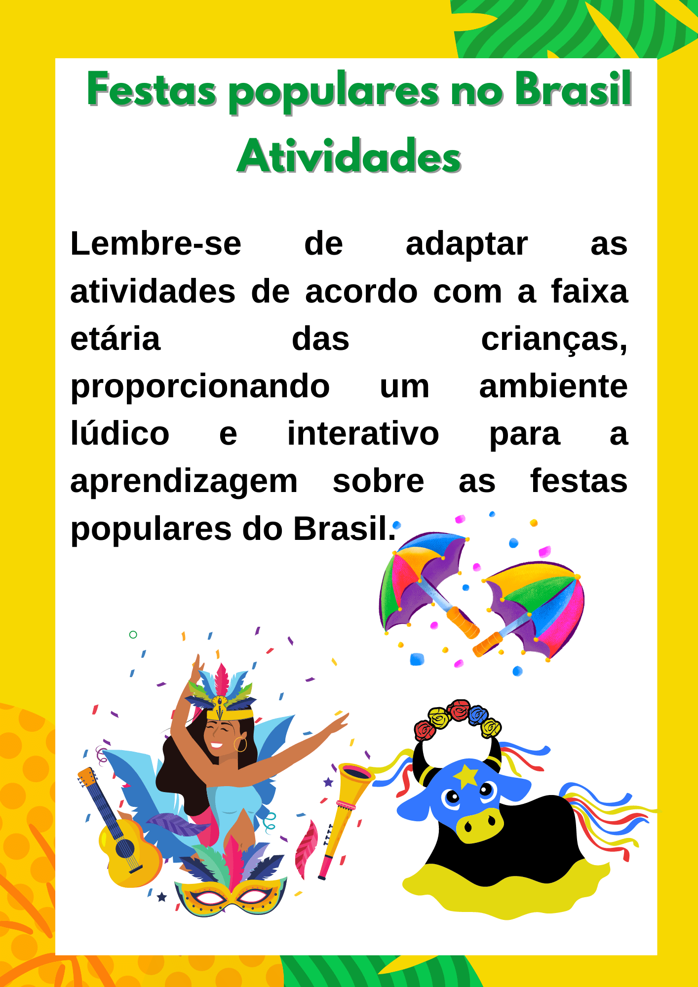 Uma das principais importâncias das atividades com o tema festas populares no Brasil é a preservação da cultura e das tradições locais. Essas festividades, transmitidas ao longo de gerações, mantêm vivas as narrativas históricas, os rituais religiosos, a música, a dança, a culinária típica e as artes populares. Por meio da participação ativa nessas festas, as pessoas se conectam com suas raízes e valorizam o patrimônio cultural do país.