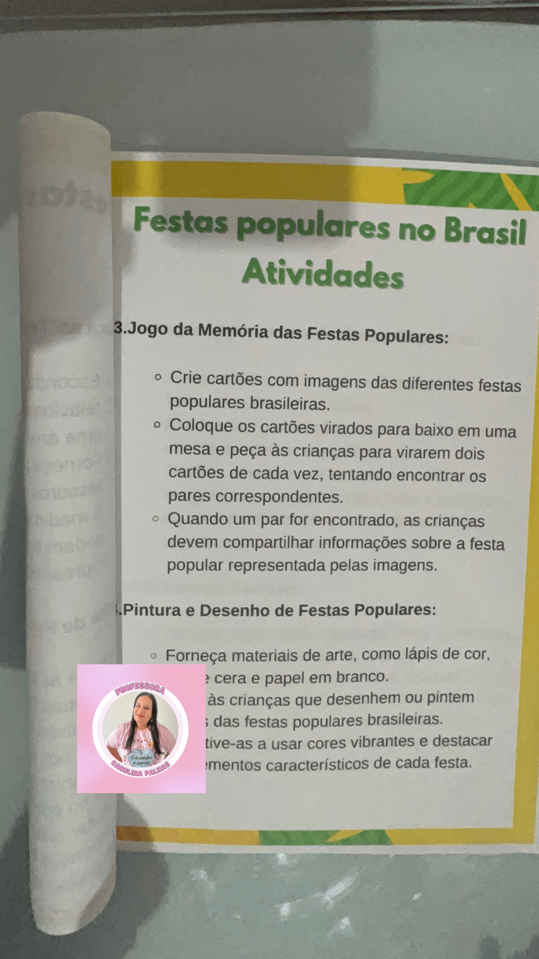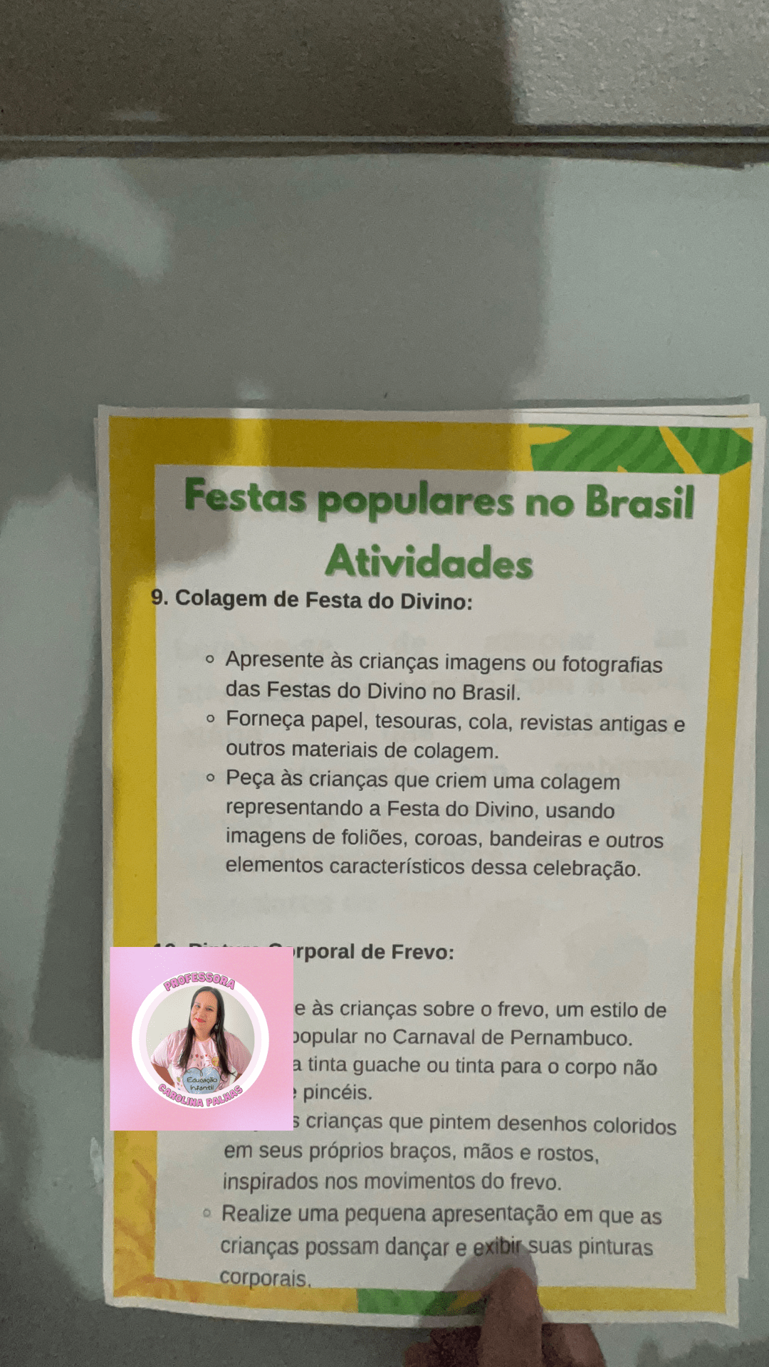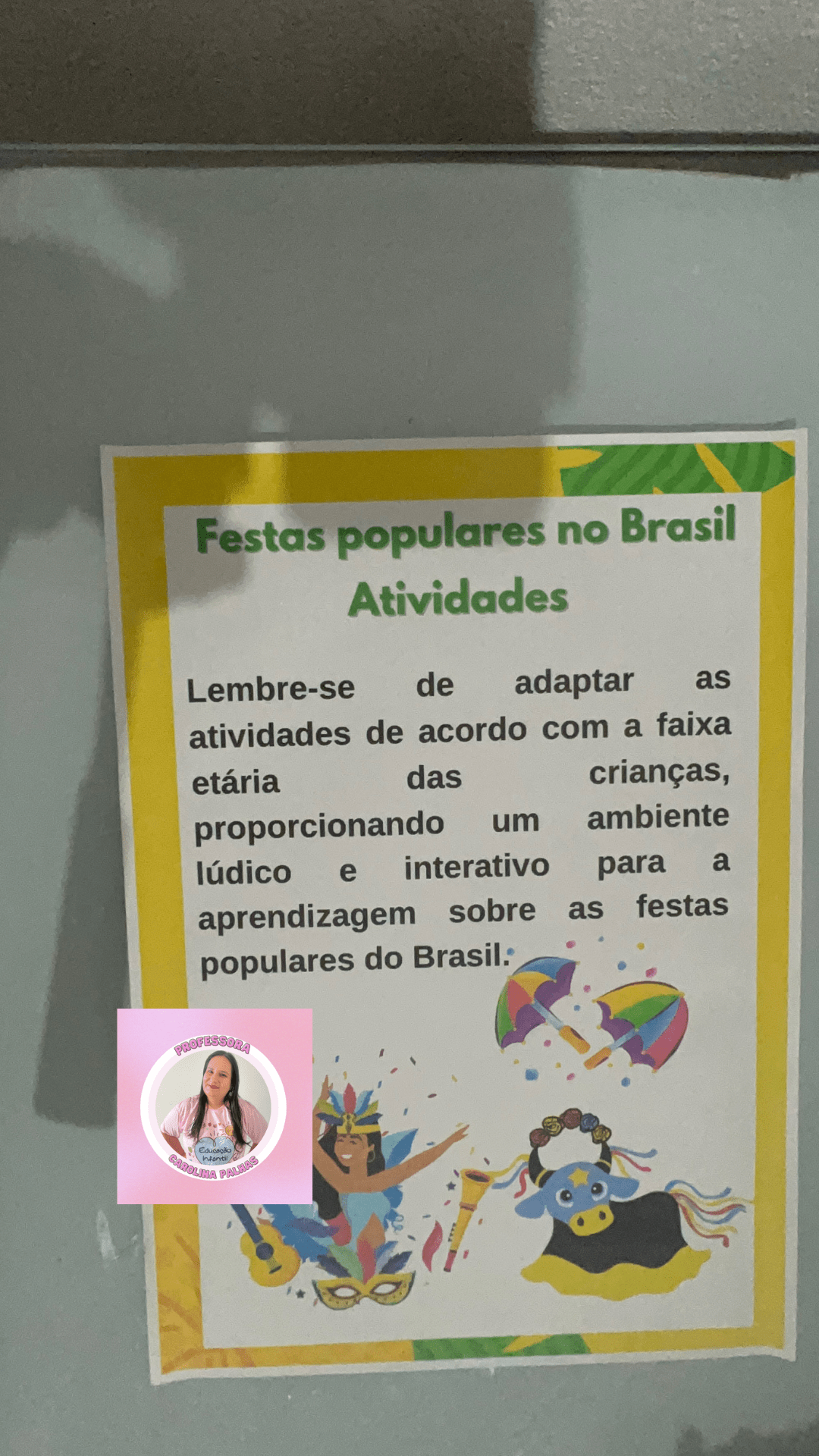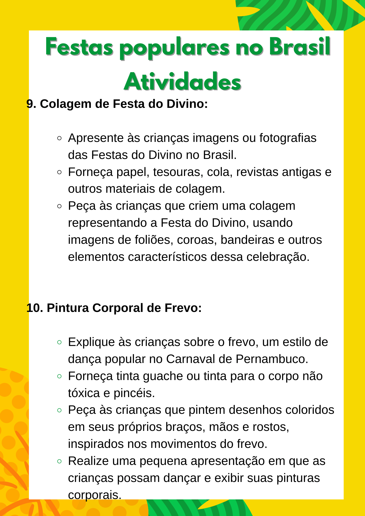 Em suma, as atividades com o tema festas populares no Brasil são de suma importância para a preservação cultural, a expressão da identidade nacional, o desenvolvimento do turismo e o fortalecimento das comunidades. Essas festividades desempenham um papel fundamental na valorização das tradições, na promoção da diversidade cultural e no enriquecimento do patrimônio imaterial do país. Ao participar e apoiar essas festas, contribuímos para a continuidade dessas manifestações culturais que fazem parte da rica tapeçaria cultural brasileira.
