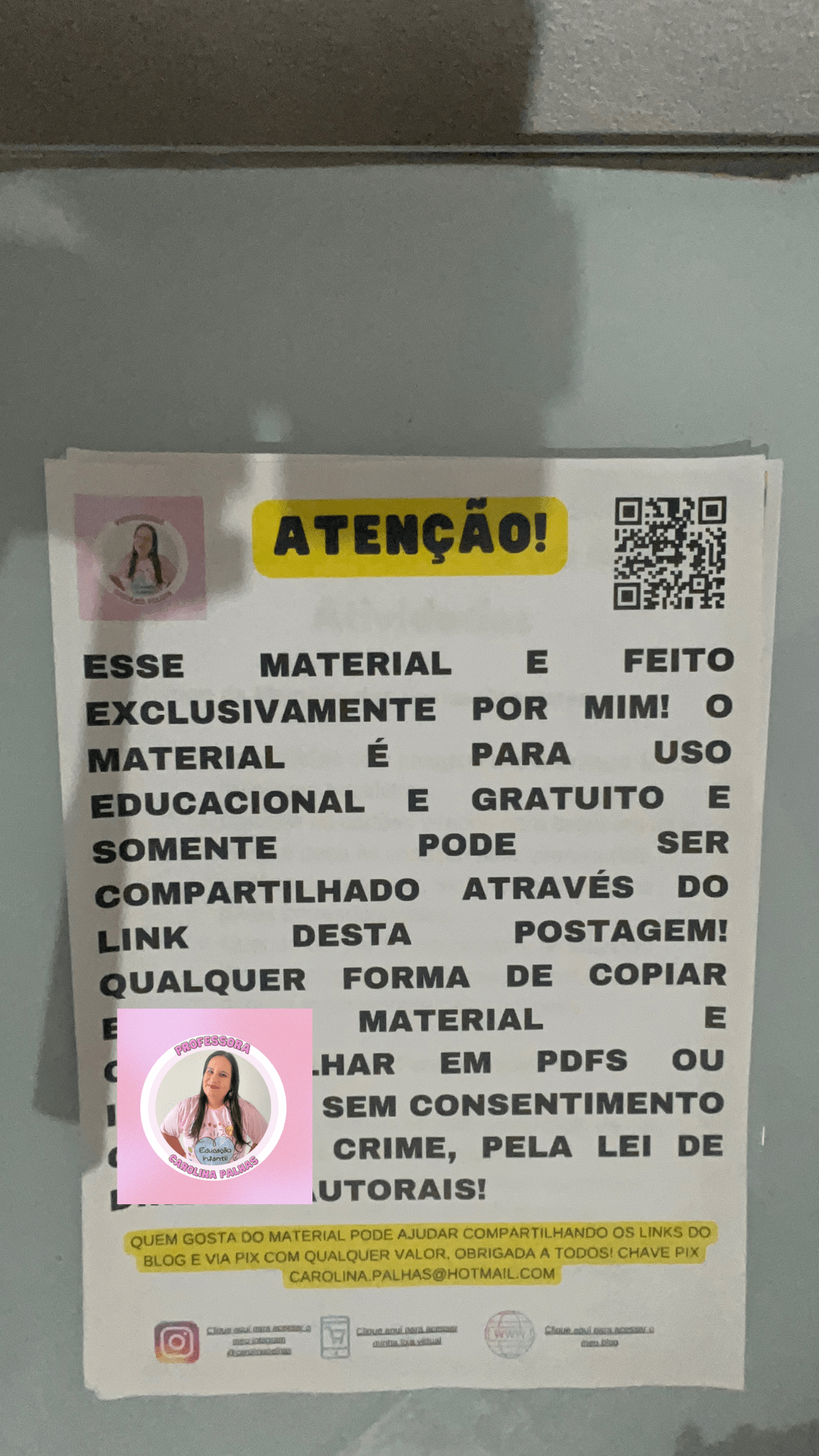 OBSERVAÇÃO: Esse material é feito exclusivamente por mim! O material é para uso educacional e gratuito e somente pode ser compartilhado através do link desta postagem! Qualquer forma de copiar esse material e compartilhar em PDFS ou imagens e sem consentimento constitui crime, pela lei de direitos autorais!