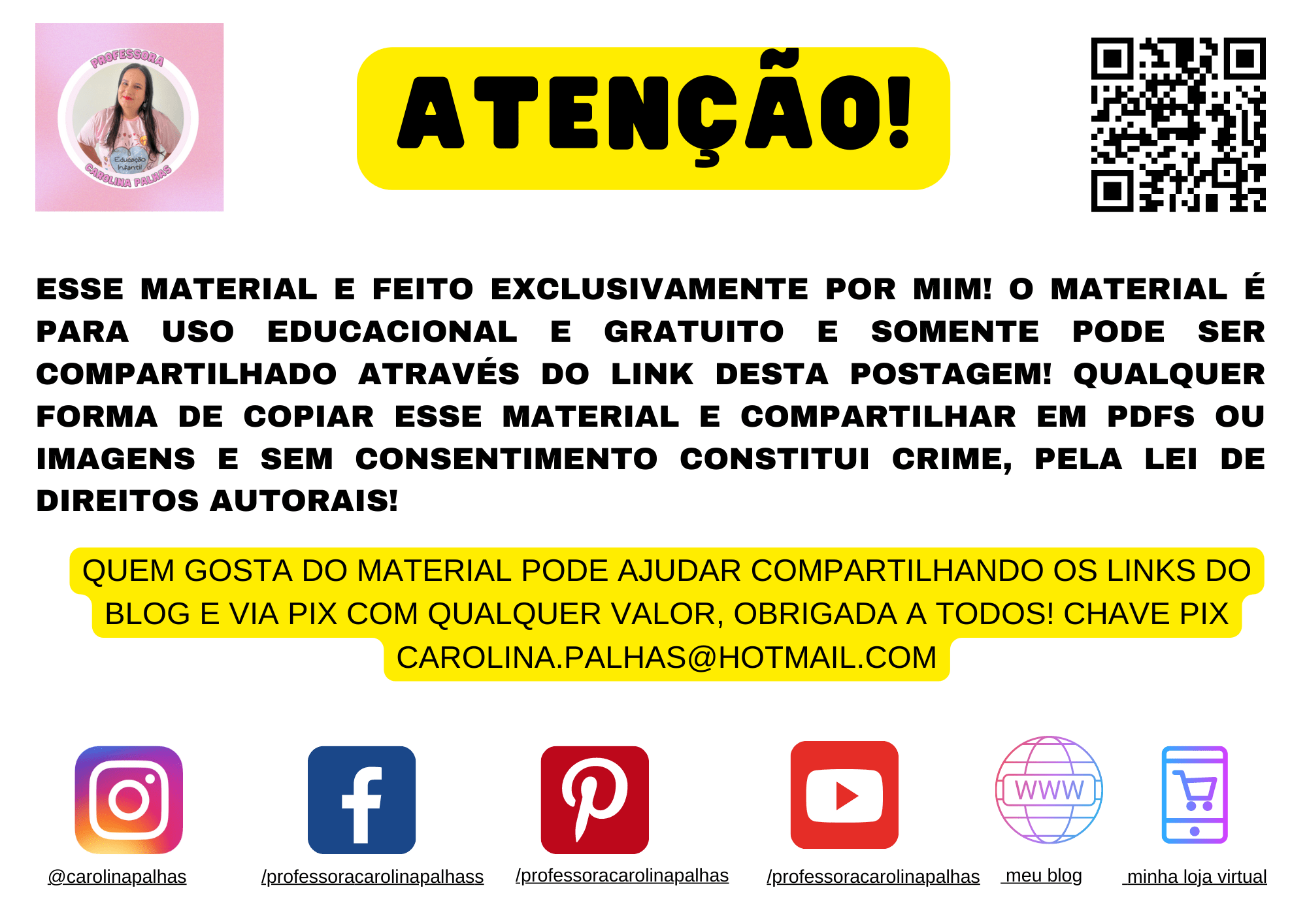 OBSERVAÇÃO: Esse material é feito exclusivamente por mim! O material é para uso educacional e gratuito e somente pode ser compartilhado através do link desta postagem! Qualquer forma de copiar esse material e compartilhar em PDFS ou imagens e sem consentimento constitui crime, pela lei de direitos autorais!