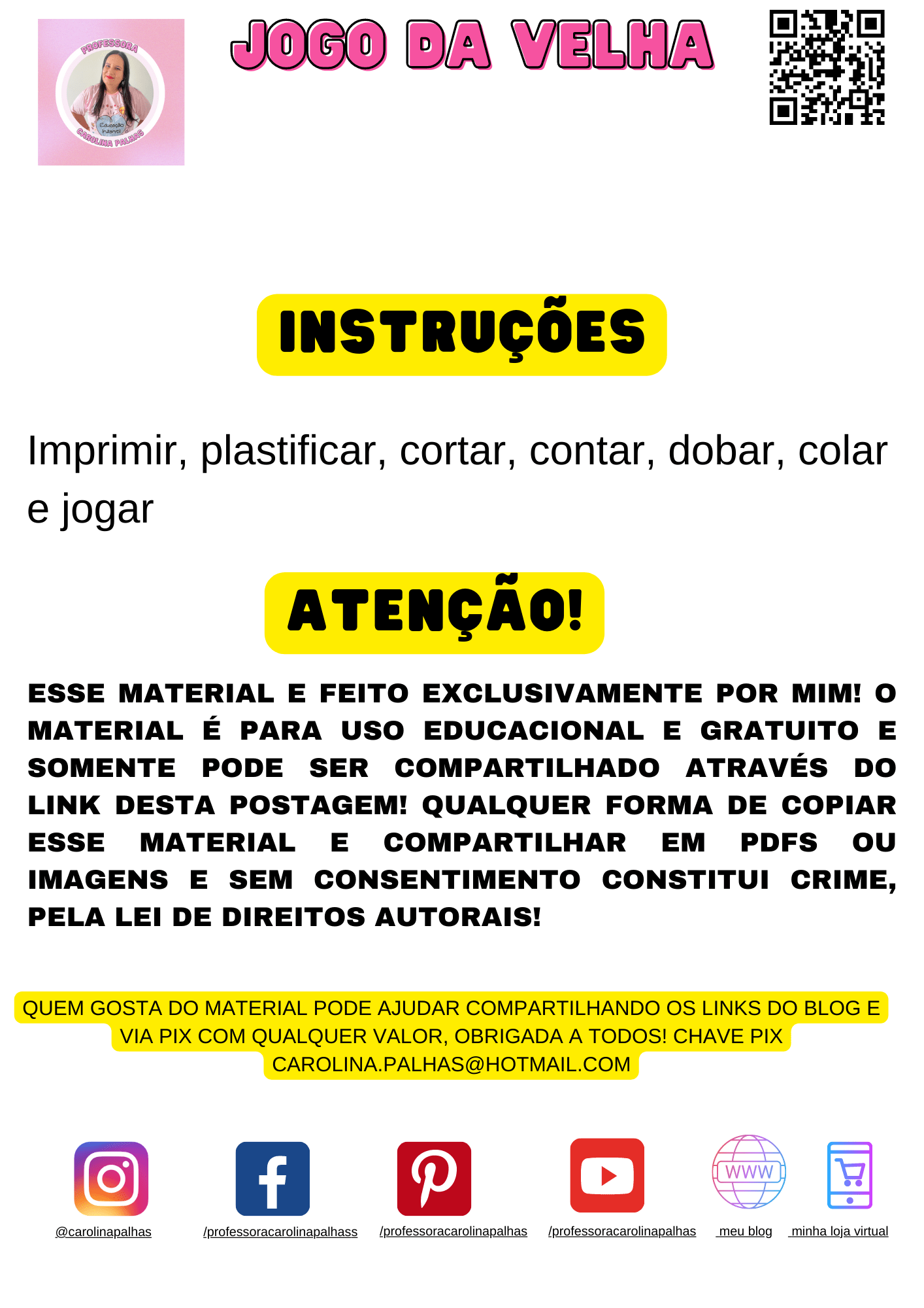 OBSERVAÇÃO: Esse material é feito exclusivamente por mim! O material é para uso educacional e gratuito e somente pode ser compartilhado através do link desta postagem! Qualquer forma de copiar esse material e compartilhar em PDFS ou imagens e sem consentimento constitui crime, pela lei de direitos autorais!