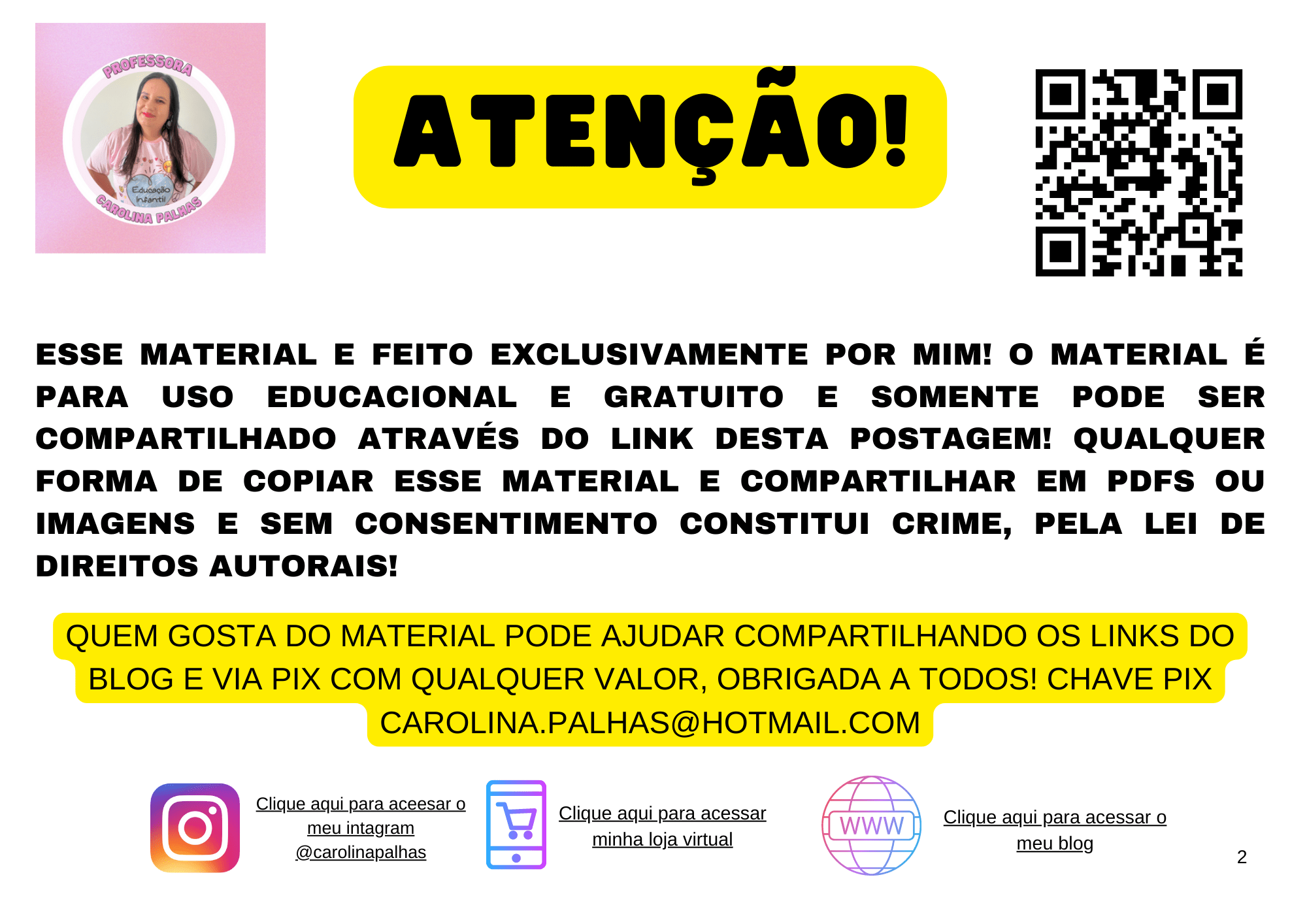 OBSERVAÇÃO: Esse material é feito exclusivamente por mim! O material é para uso educacional e gratuito e somente pode ser compartilhado através do link desta postagem! Qualquer forma de copiar esse material e compartilhar em PDFS ou imagens e sem consentimento constitui crime, pela lei de direitos autorais!