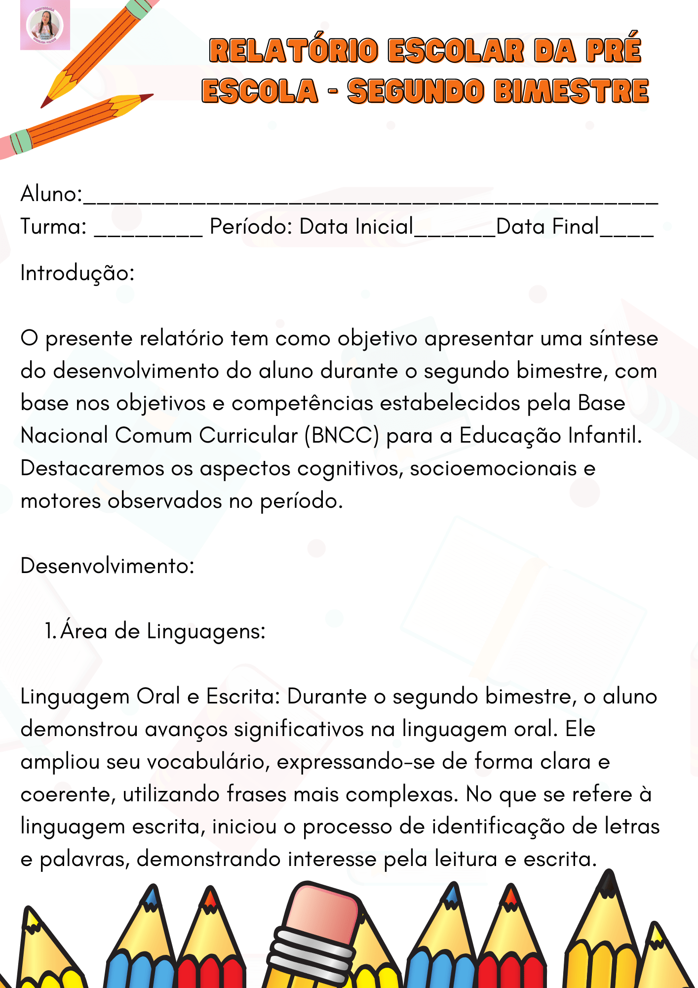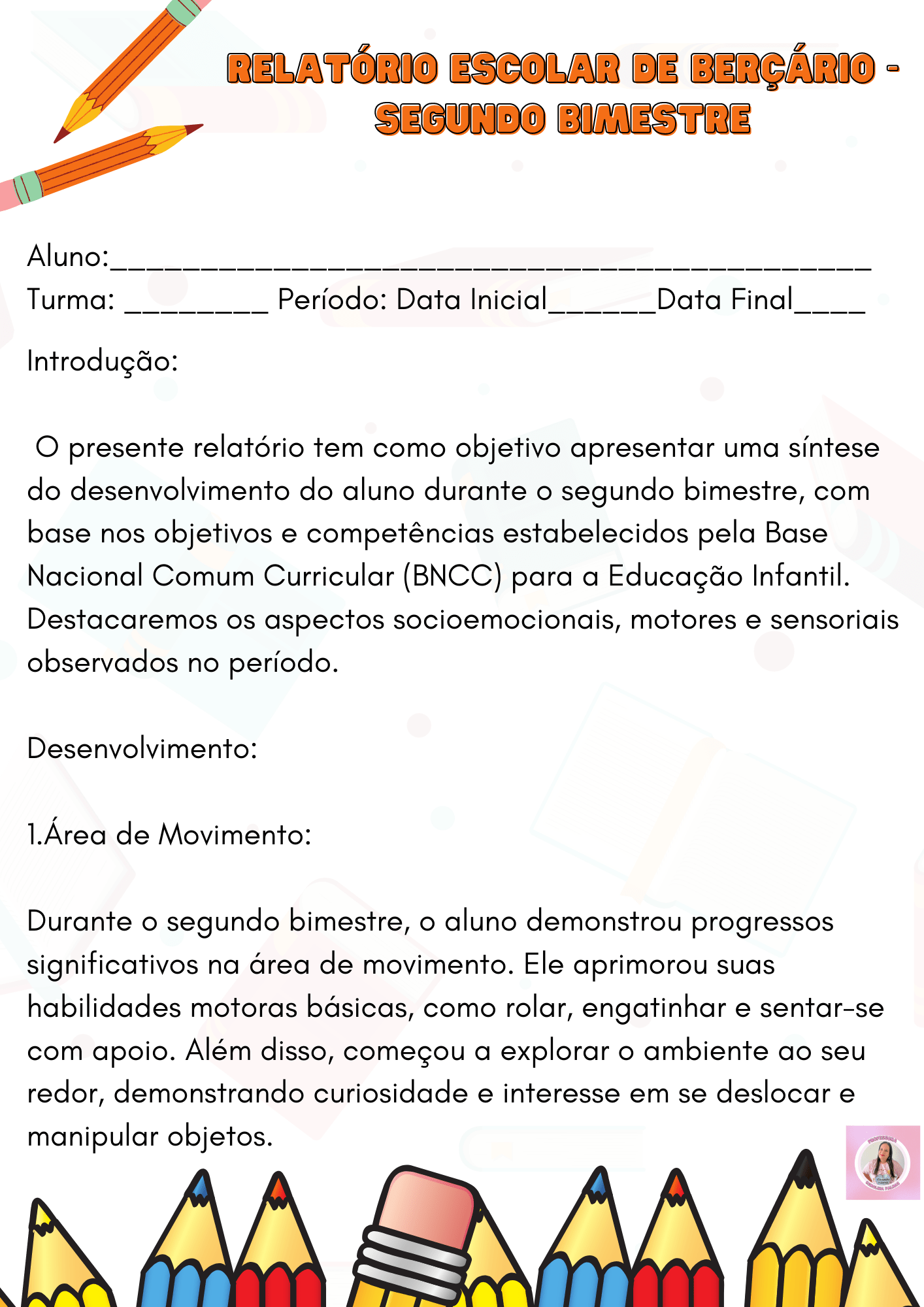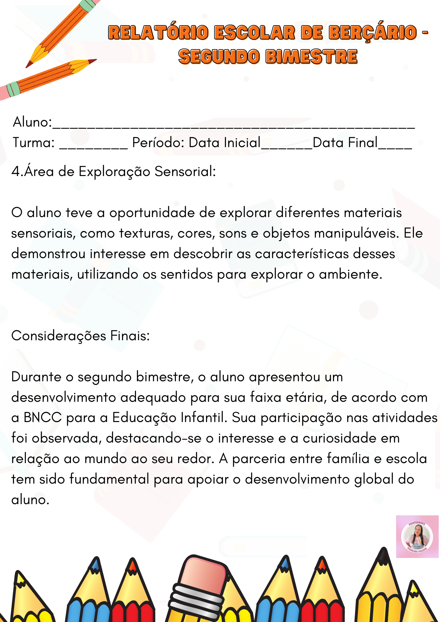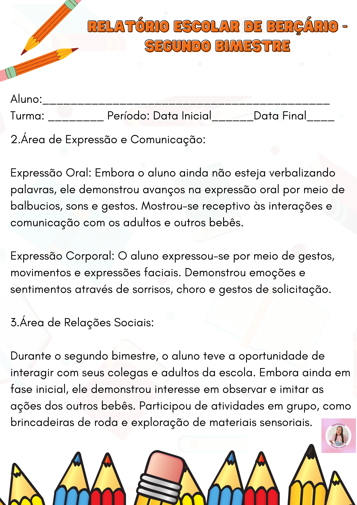 Estou empolgado em compartilhar com vocês dois modelos de relatórios descritivos de avaliação para o segundo bimestre, um voltado para o berçário e outro para a pré-escola. Esses relatórios foram elaborados com muito carinho e cuidado, visando fornecer informações detalhadas sobre o desenvolvimento e o progresso das crianças nessa fase tão importante de suas vidas.