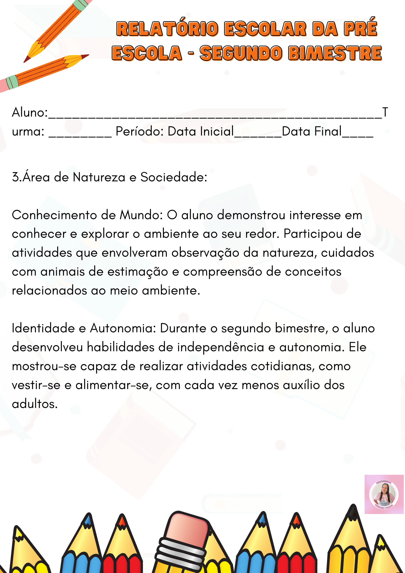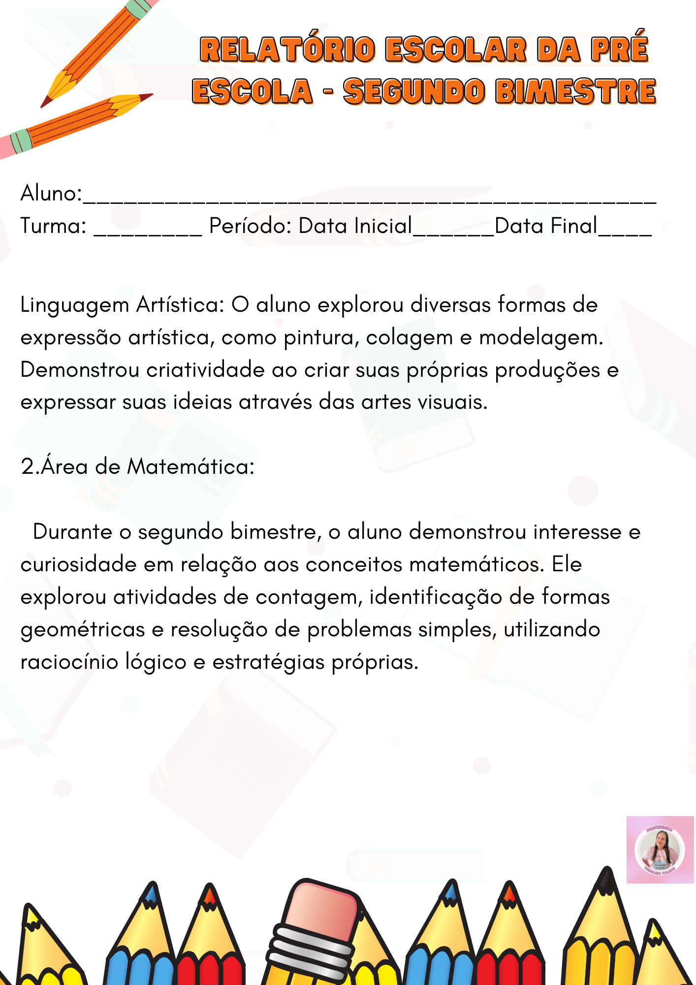 Ambos os modelos de relatório estão disponíveis para download em formato de PDF no meu blog [inserir link para o blog]. Lá, vocês poderão encontrar esses modelos completos, com todas as informações necessárias para acompanhar o desenvolvimento das crianças durante o segundo bimestre. Lembre-se de que cada criança é única, e esses relatórios foram elaborados com o objetivo de valorizar suas conquistas individuais e auxiliar seu crescimento em áreas específicas.