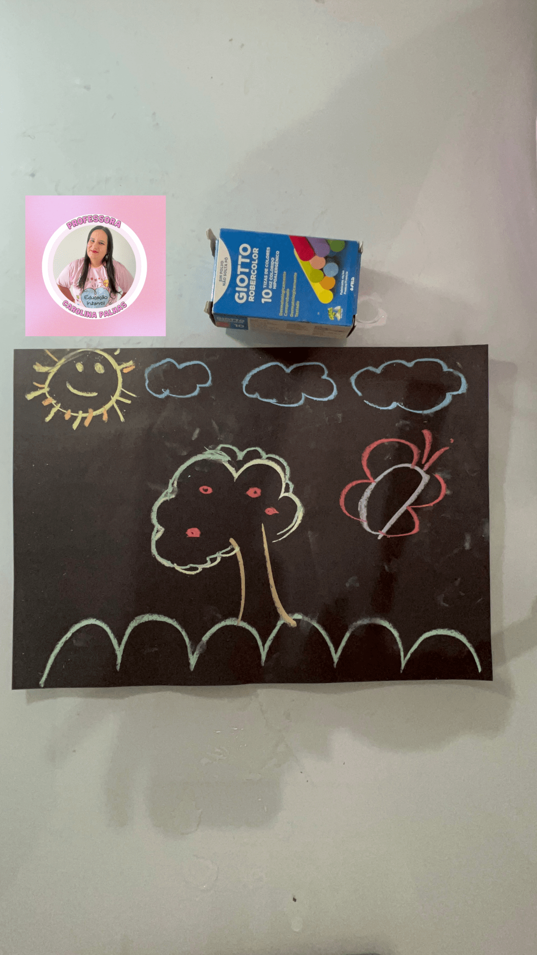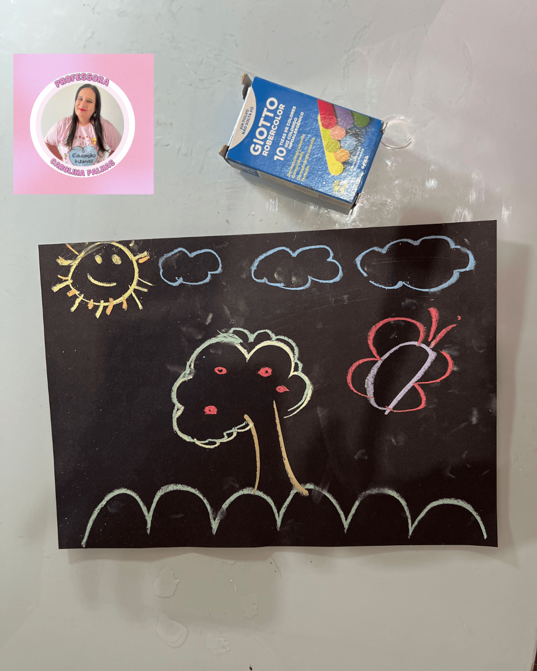 Em resumo, a técnica com giz colorido de quadro negro na folha preta utilizando o giz de quadro da marca Giotto é uma atividade envolvente e educativa para as crianças da educação infantil. Ela estimula a criatividade, desenvolve habilidades motoras e promove a expressão artística, permitindo que as crianças explorem o mundo das cores e da imaginação de forma divertida e cativante.