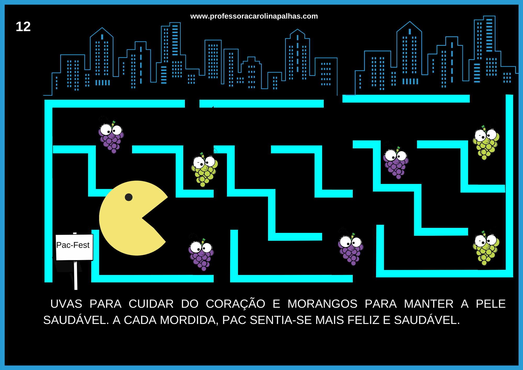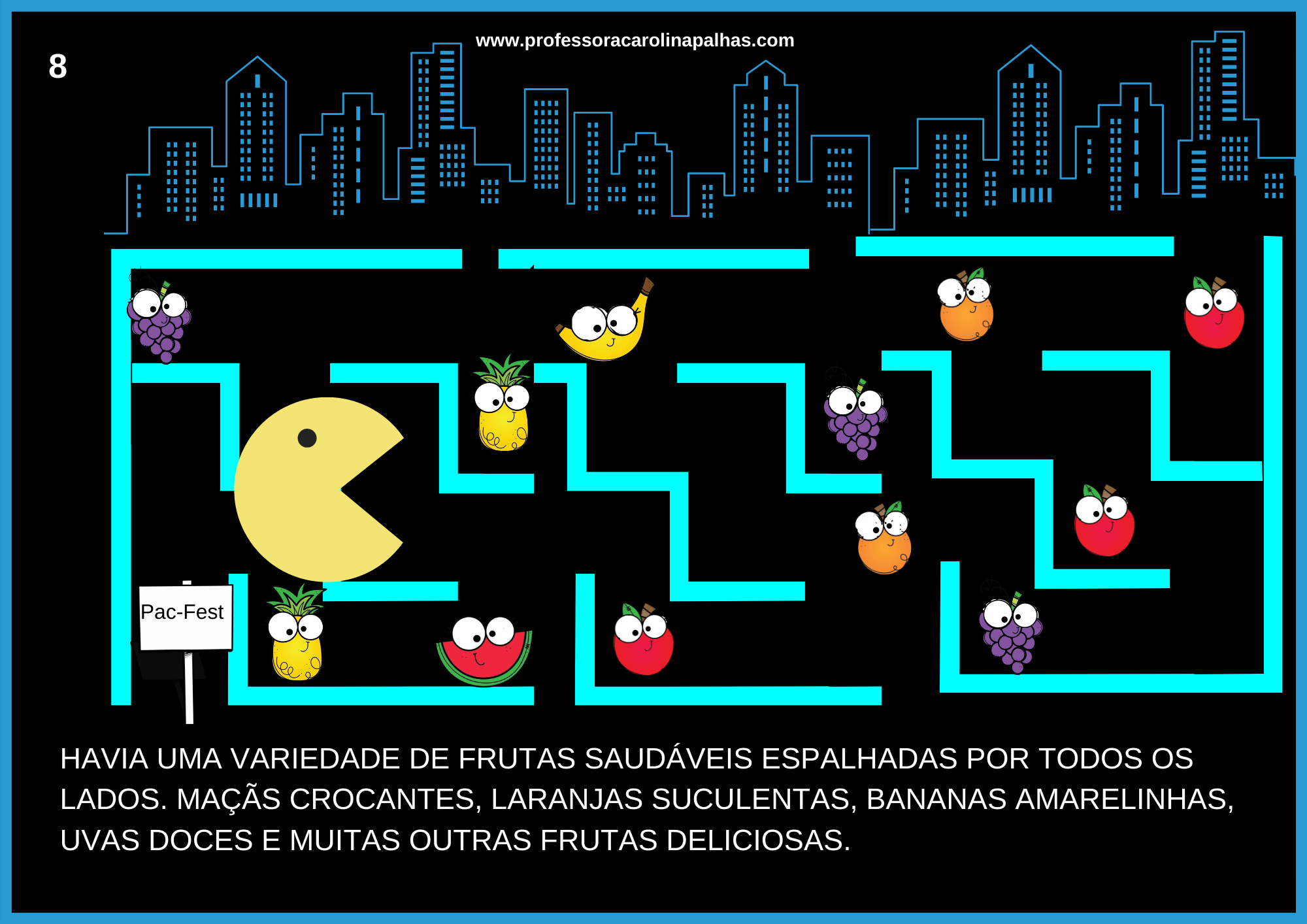 Nessa atividade, decidi explorar o tema da alimentação saudável e a importância de consumir frutas para manter uma vida equilibrada. Através dessa história envolvente, as crianças embarcaram em uma aventura com o famoso personagem Pac-Man, que precisa encontrar as frutas mágicas para restaurar sua energia e superar os desafios.