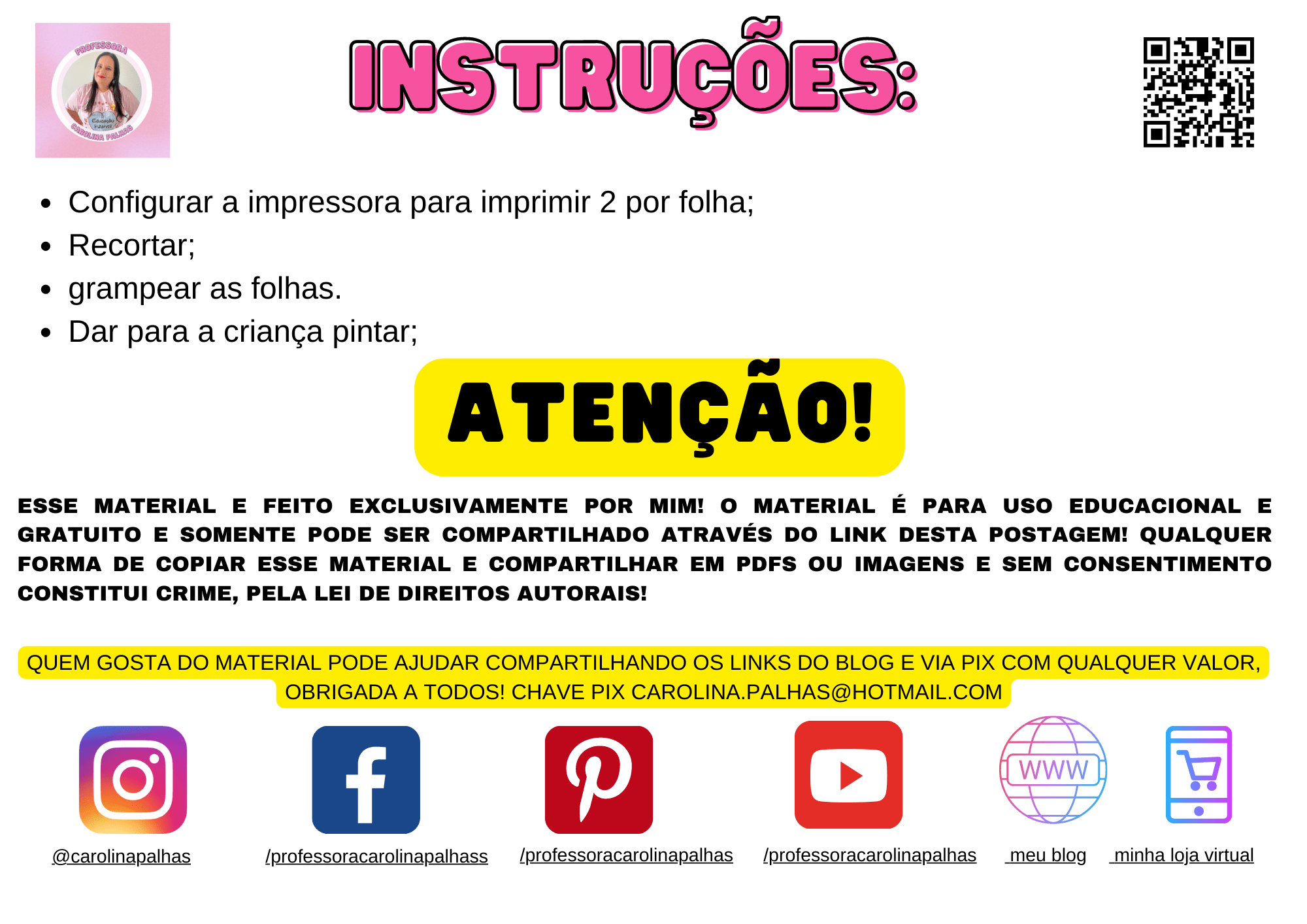 OBSERVAÇÃO: Esse material é feito exclusivamente por mim! O material é para uso educacional e gratuito e somente pode ser compartilhado através do link desta postagem! Qualquer forma de copiar esse material e compartilhar em PDFS ou imagens e sem consentimento constitui crime, pela lei de direitos autorais!