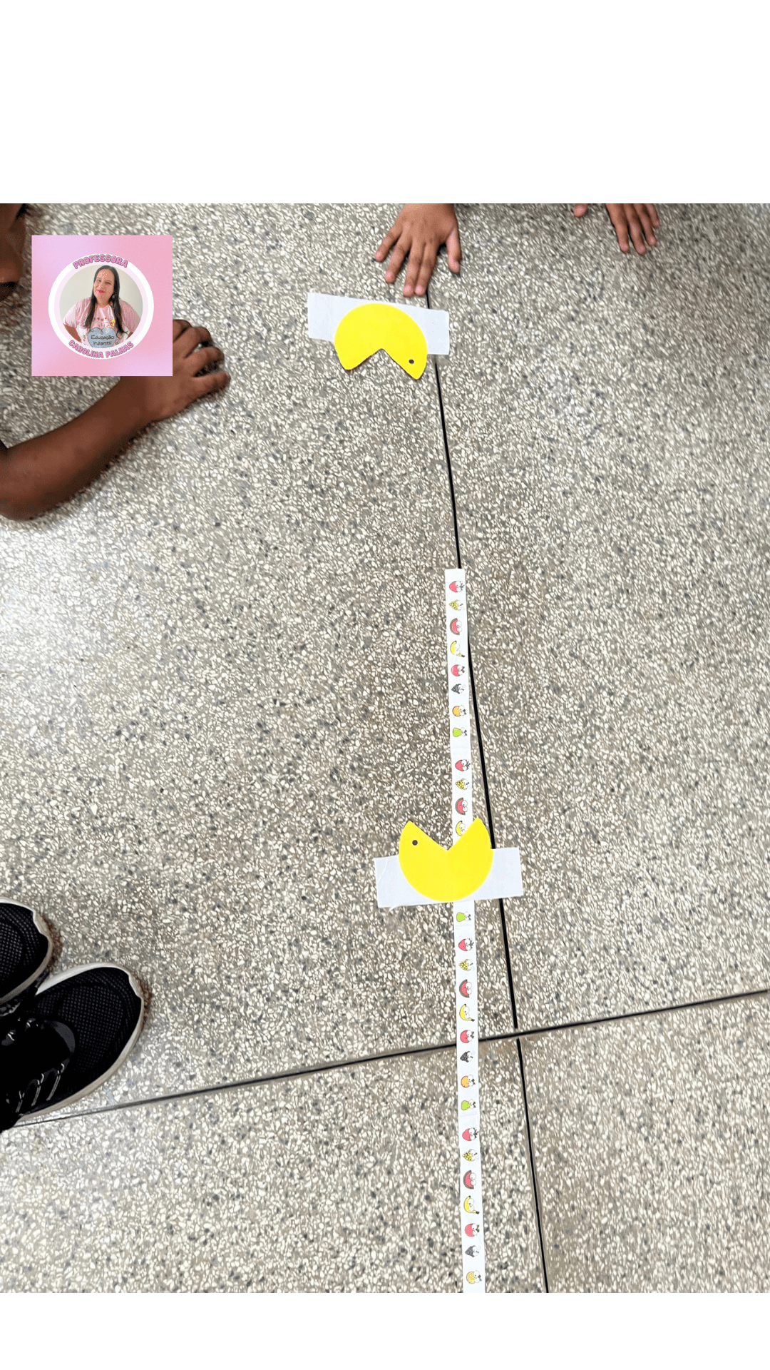 Imaginem só: um Jogo do Pac Man no chão! Foi uma experiência incrível! 💛 Na atividade, colei as boquinhas do Pac Man no chão, uma de frente para a outra, e coloquei uma faixa com frutas na ponta de cada boquinha. Em duplas, os alunos se alternaram para puxar a faixa com as frutas para o seu lado, fazendo com que o Pac Man “comesse” as frutas.