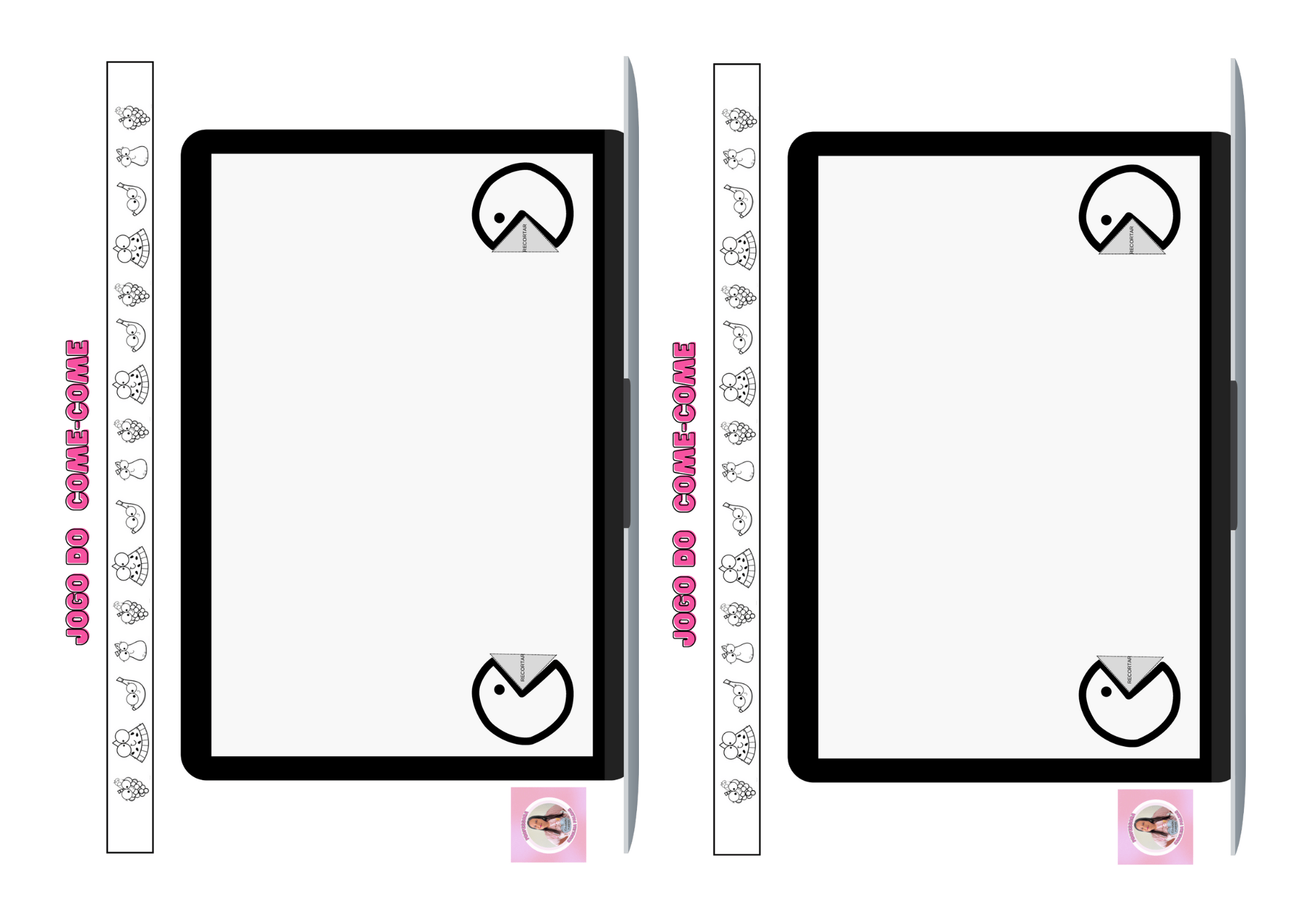 Ao finalizar os desenhos, eu cortei a folha nas pontas onde estão os Pac-Man e coloquei a tira com as frutas. O momento mais emocionante era quando a criança puxava a tira com as frutas, permitindo que o Pac-Man “comesse” as frutas.