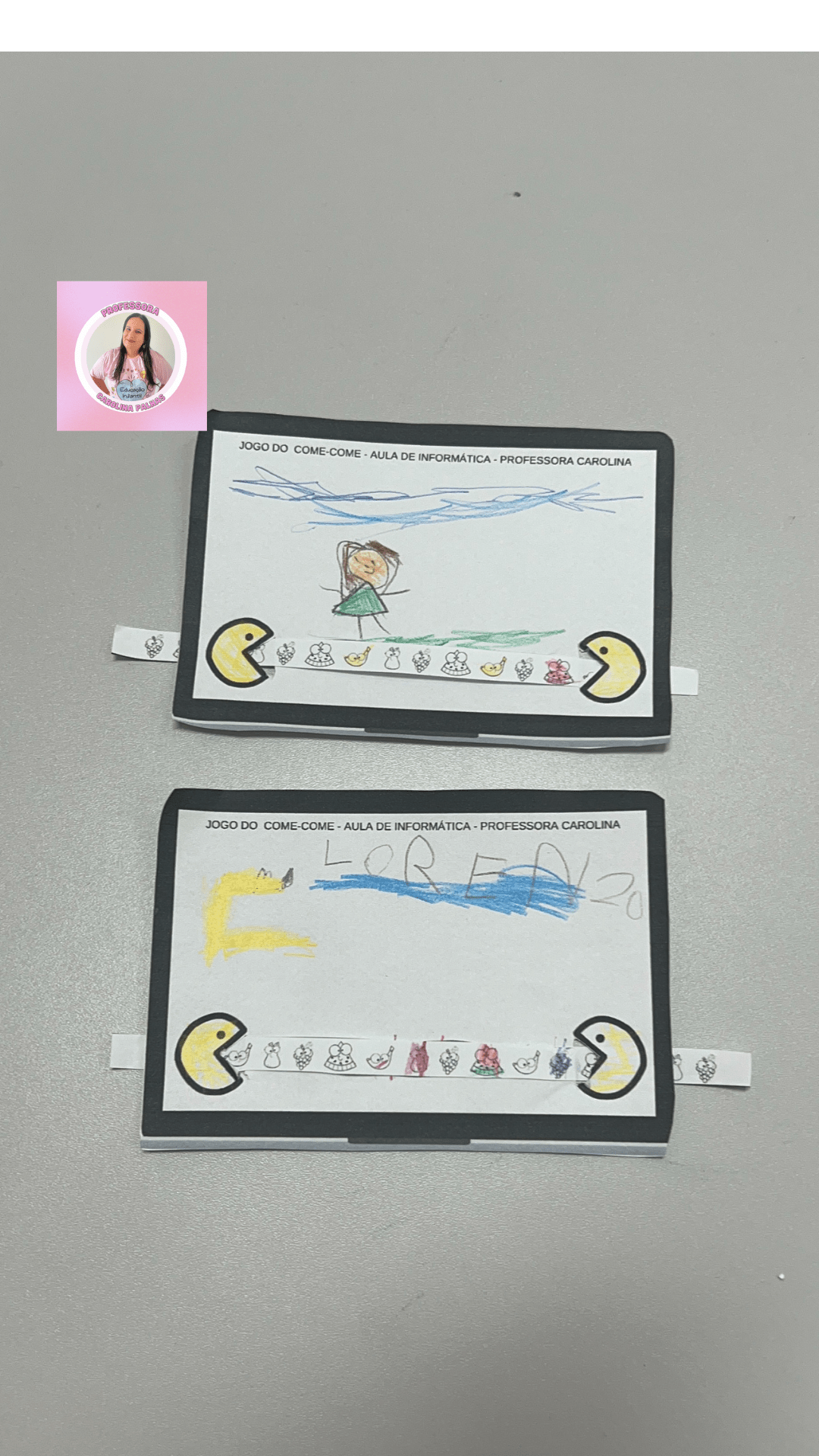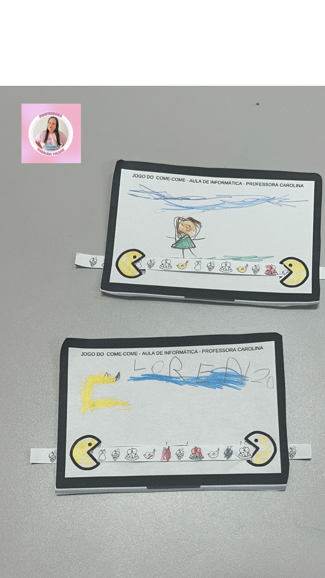 Você já imaginou poder criar o seu próprio Jogo do Pac-Man no papel? Foi uma experiência incrível! 💛 Entreguei para cada criança uma imagem de tela com os Pac-Man e uma tira com as frutas. A proposta era que elas usassem toda a imaginação e criatividade para desenharem na tela do jogo.