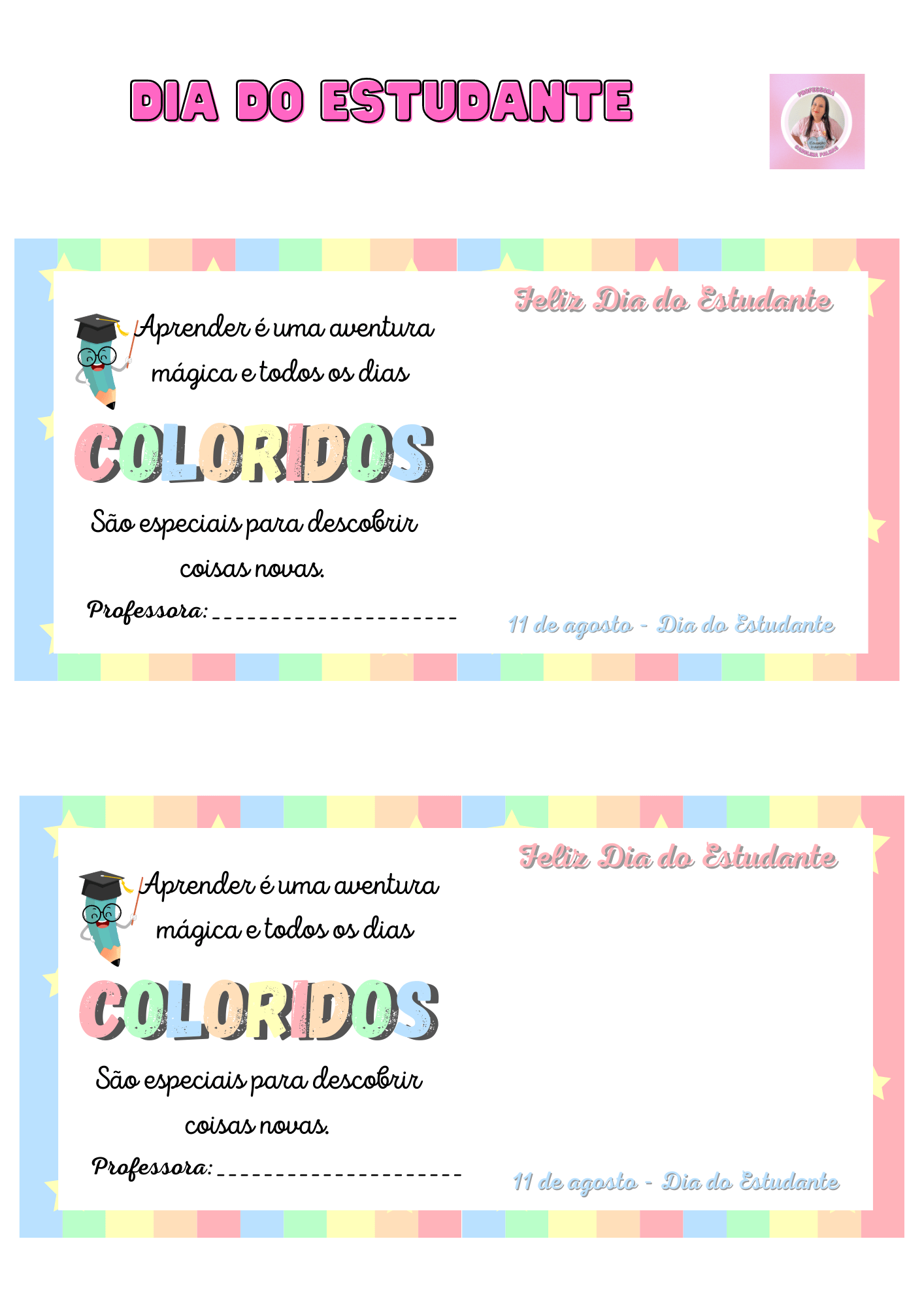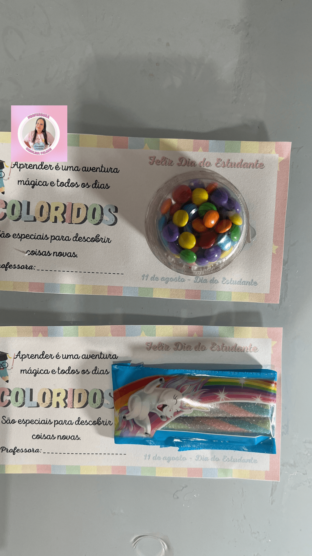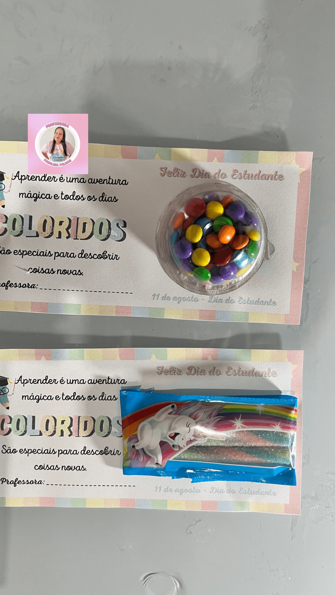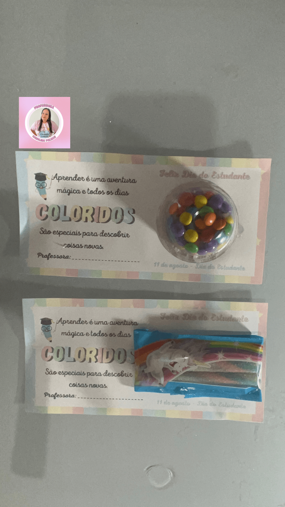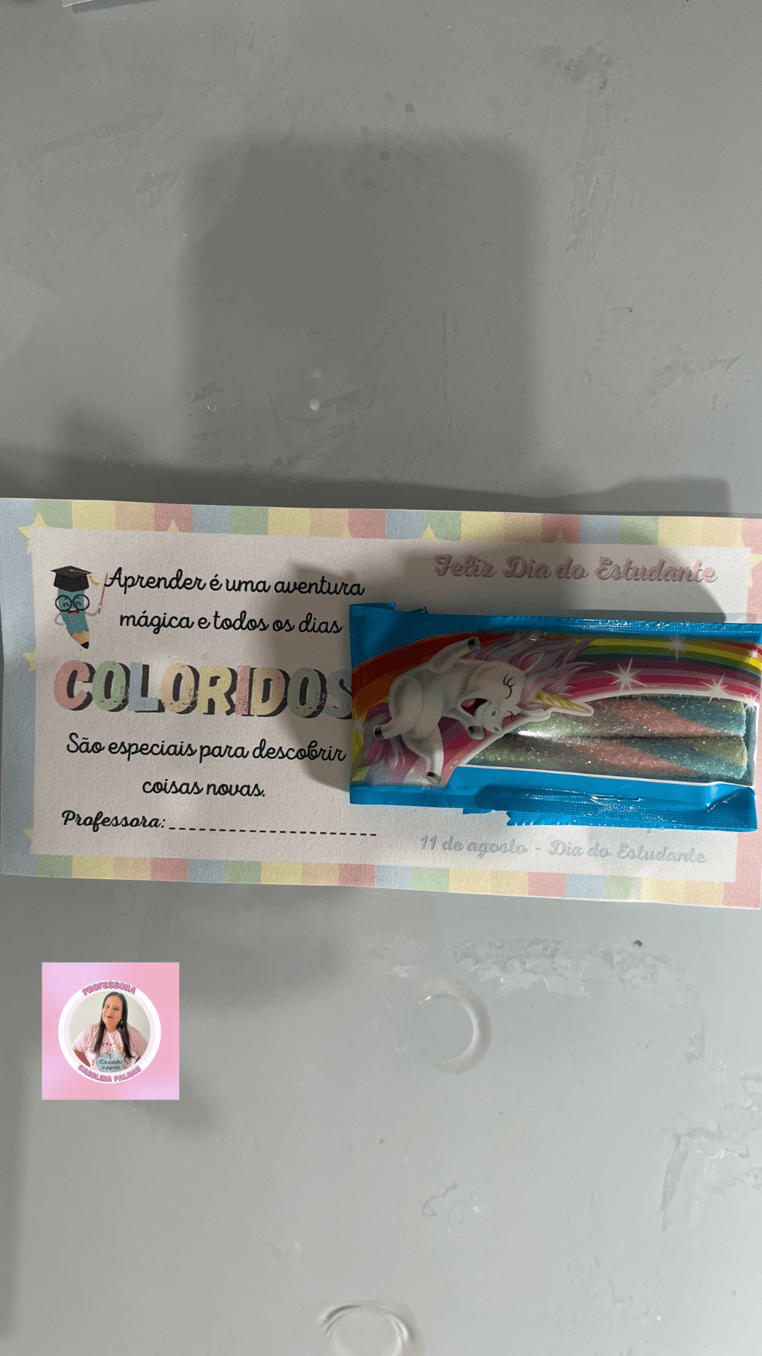 Aqui está uma ideia encantadora para tornar essa celebração ainda mais especial: um cartão de lembrança que pode ser impresso e colado um mimo, como um doce ou um brinquedinho. Essa é uma maneira de surpreender e encantar os alunos, proporcionando um presente que eles possam guardar como uma lembrança especial desse dia.