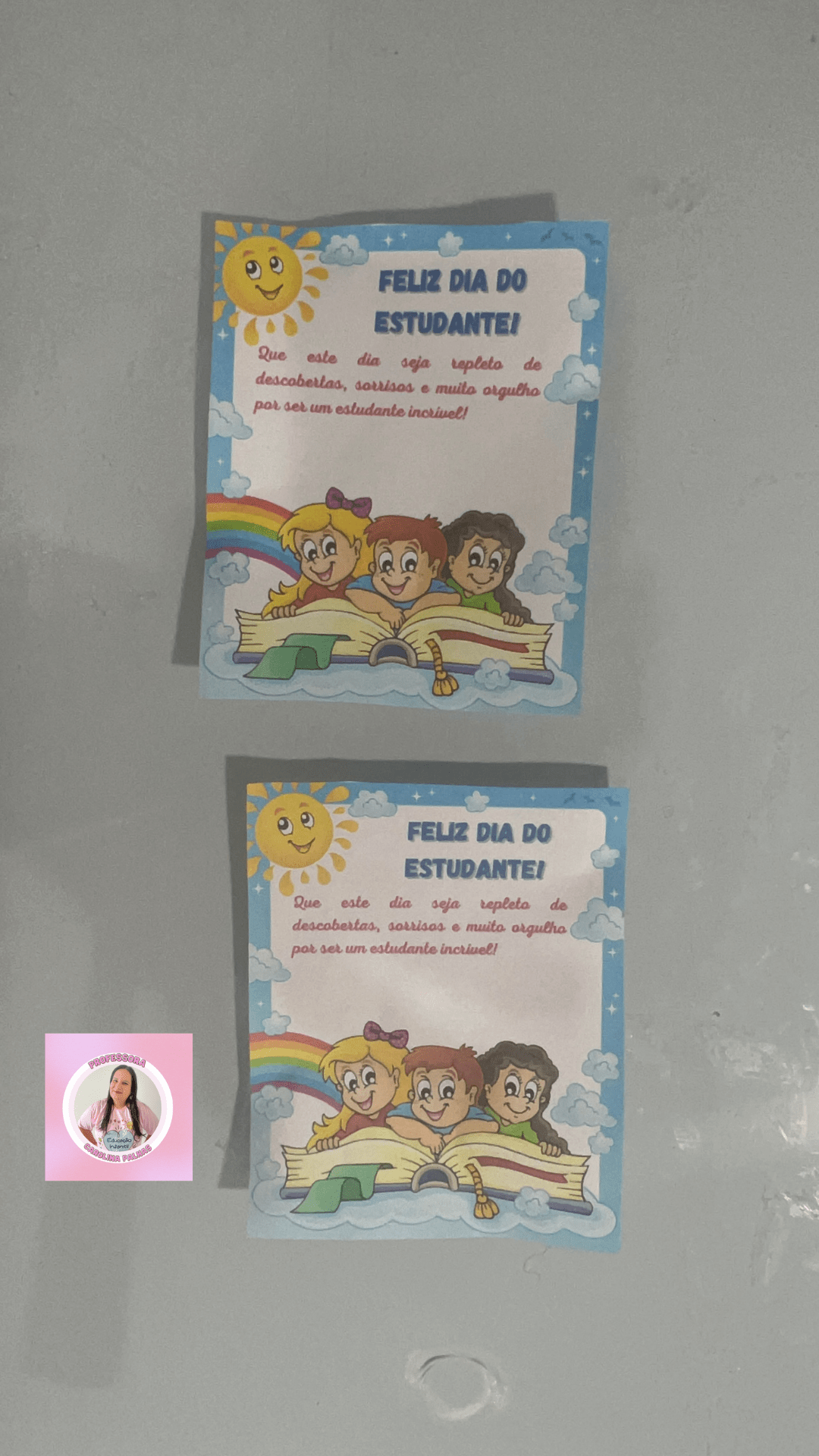 Aqui está uma ideia encantadora para tornar essa celebração ainda mais especial: um cartão de lembrança que pode ser impresso e colado um mimo, como um doce ou um brinquedinho. Essa é uma maneira de surpreender e encantar os alunos, proporcionando um presente que eles possam guardar como uma lembrança especial desse dia.