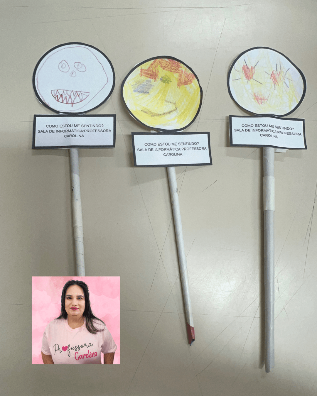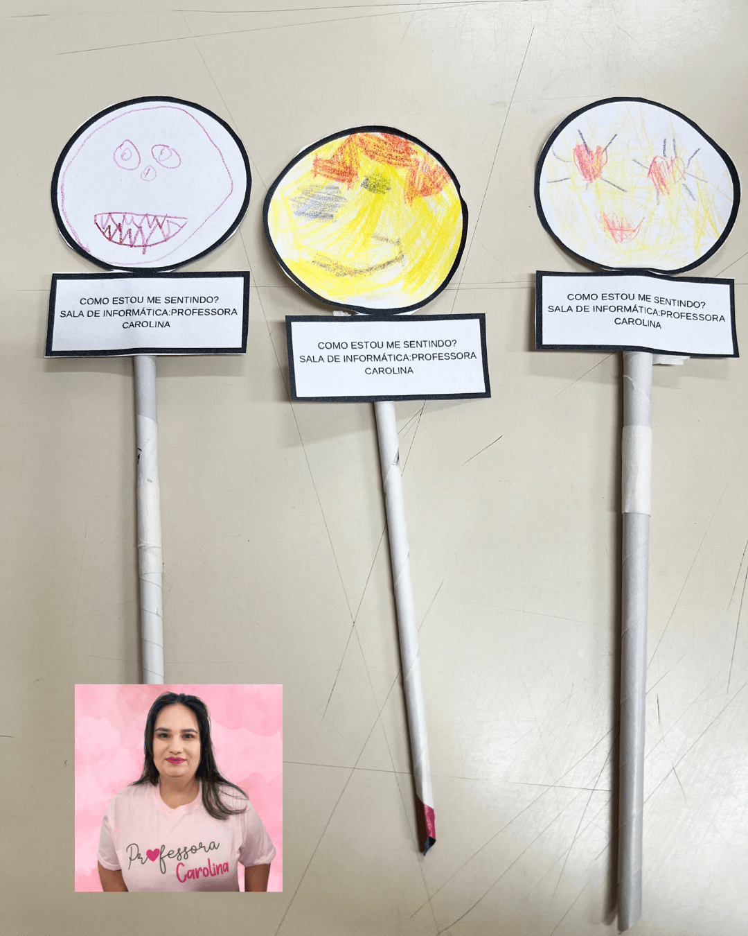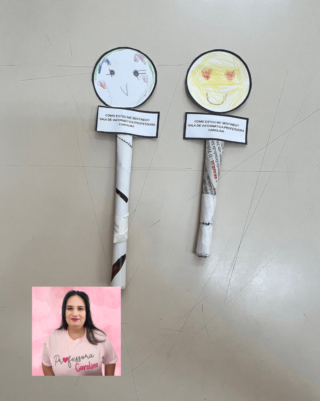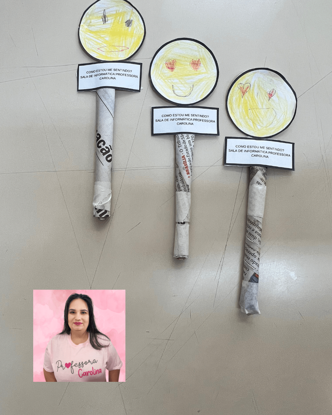 Imagina só: círculos em branco prontos para serem preenchidos com emojis que refletiam seus sentimentos. Cada traço revelava um pedacinho do que estava dentro delas. E a transformação aconteceu quando colocamos esses círculos em canudos de papel, transformando-os em adoráveis Palitoches.