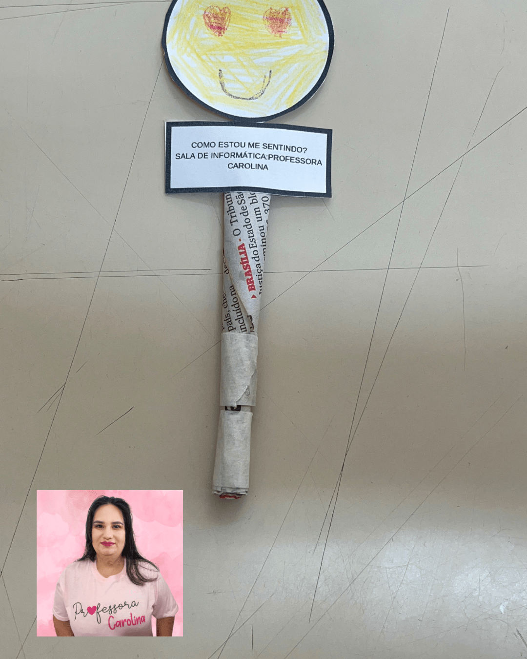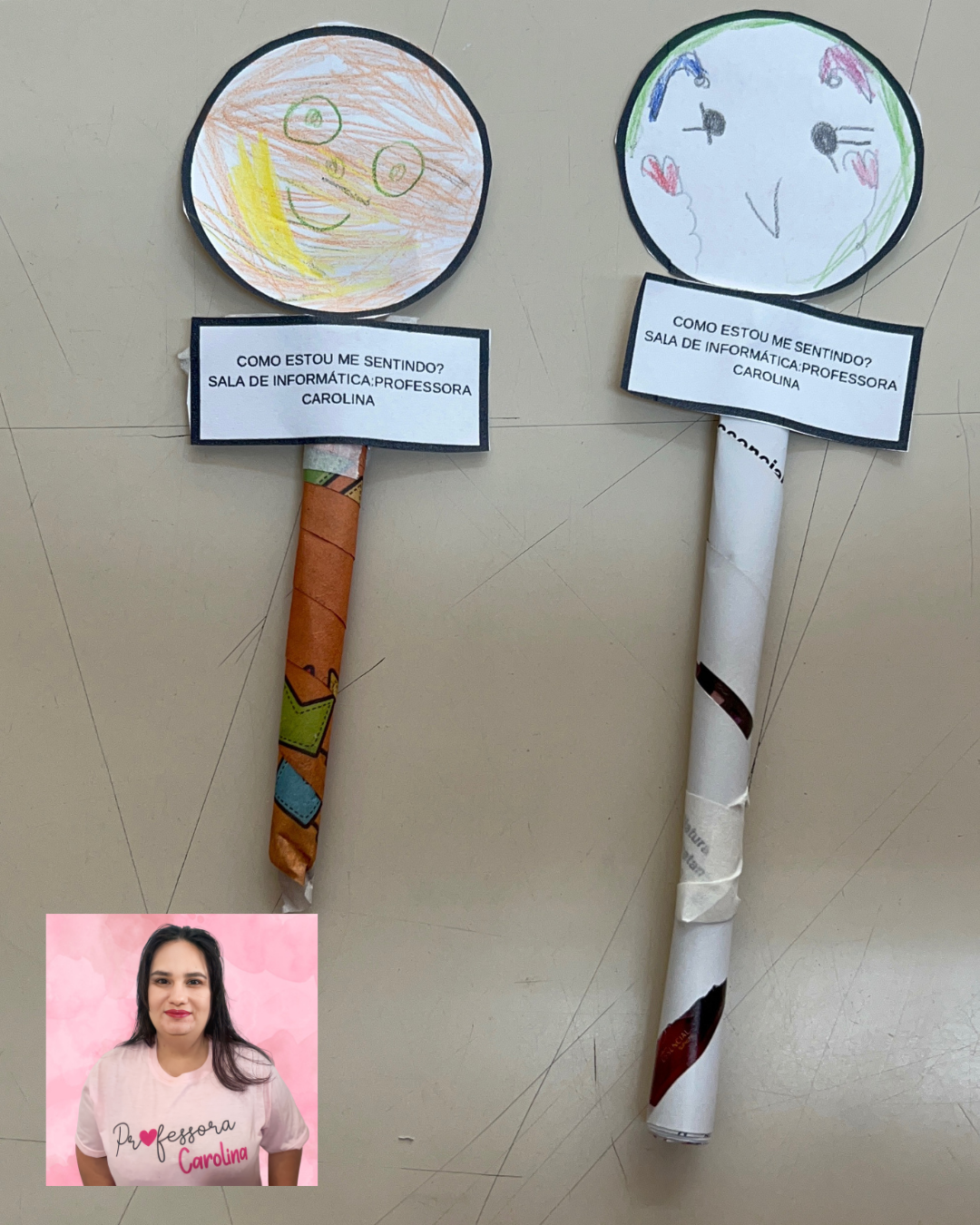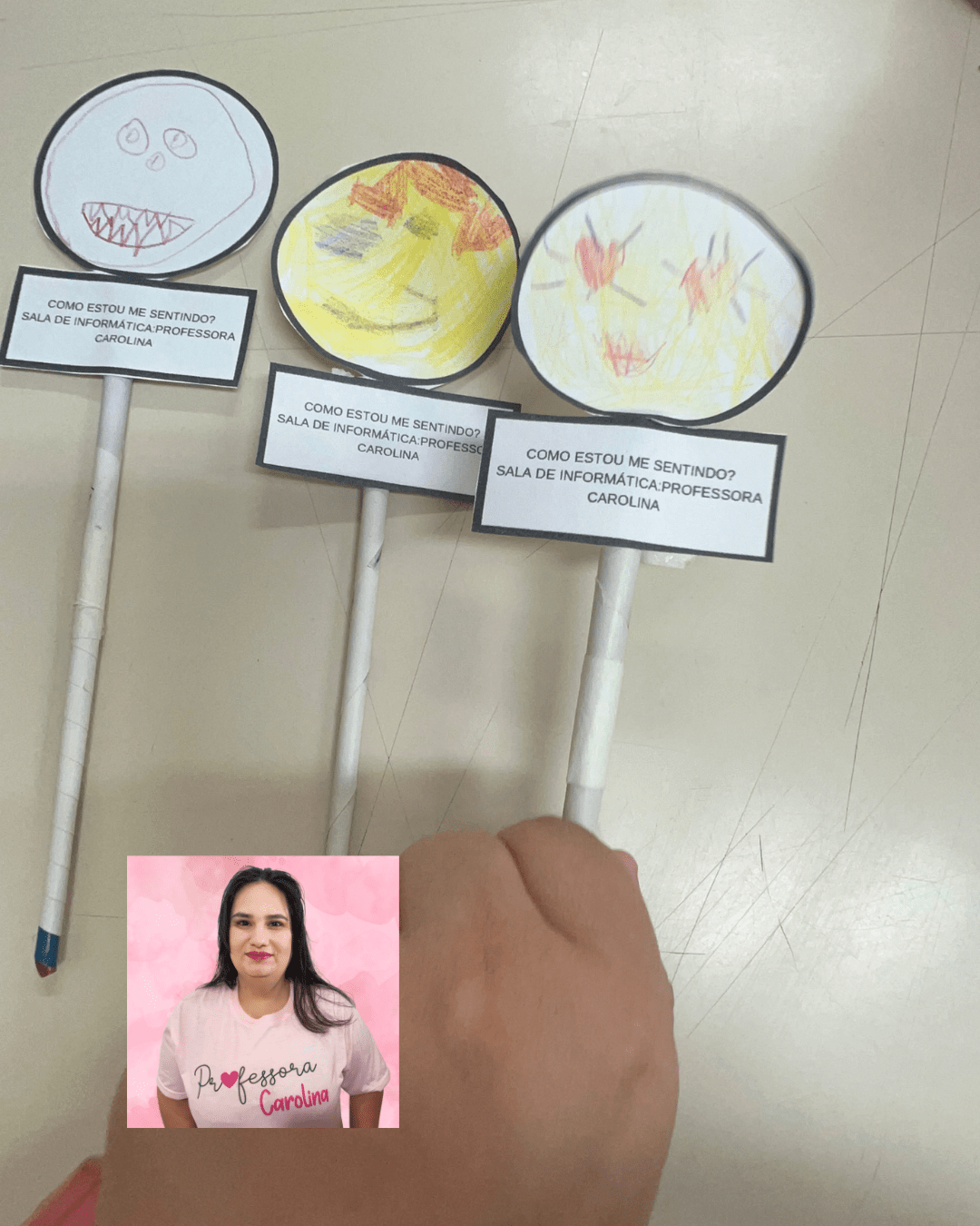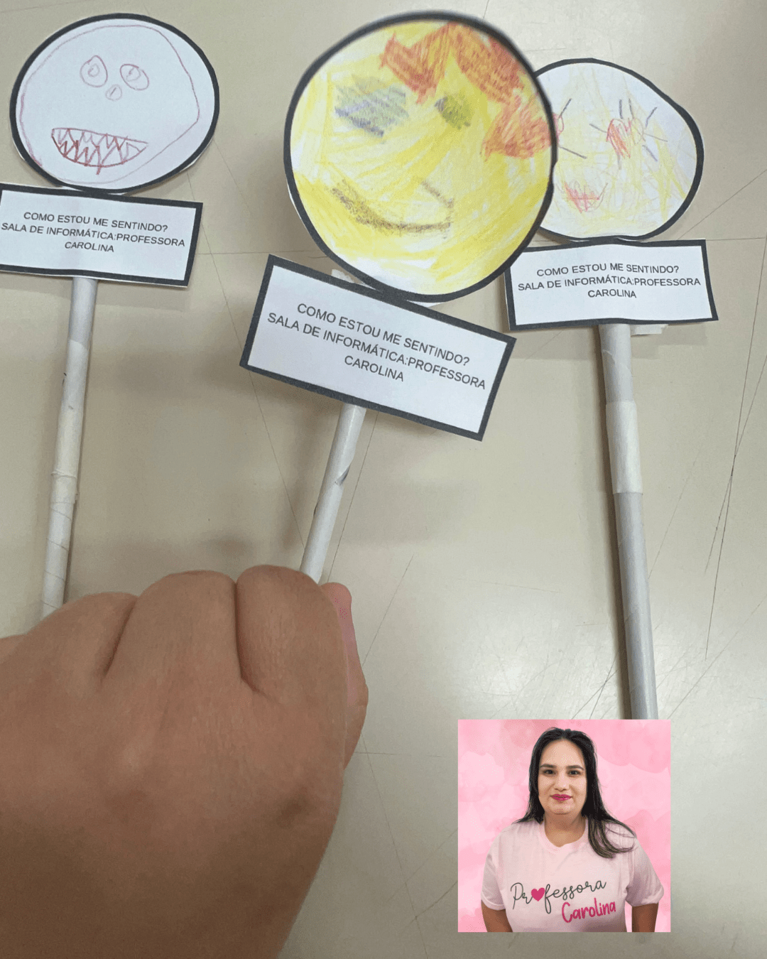 Imagina só: círculos em branco prontos para serem preenchidos com emojis que refletiam seus sentimentos. Cada traço revelava um pedacinho do que estava dentro delas. E a transformação aconteceu quando colocamos esses círculos em canudos de papel, transformando-os em adoráveis Palitoches.