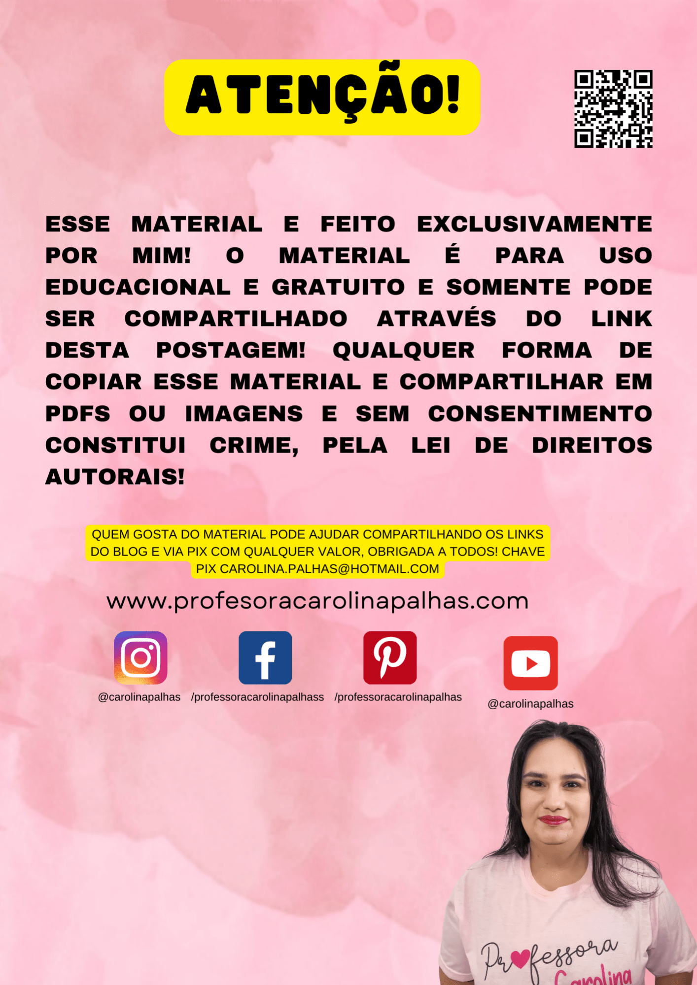 OBSERVAÇÃO: Esse material e feito exclusivamente por mim! O material é para uso educacional e gratuito e somente pode ser compartilhado através do link desta postagem! Qualquer forma de copiar esse material e compartilhar em PDFS ou imagens e sem consentimento constitui crime, pela lei de direitos autorais!