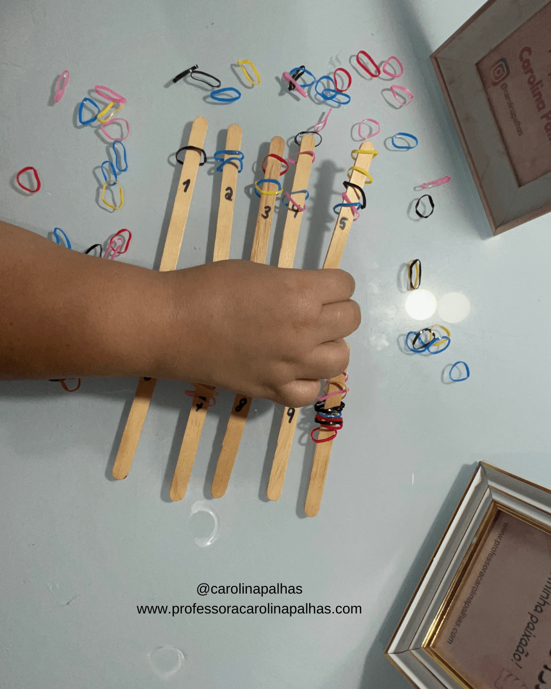 Inspire-se, desperte o amor pelos números e fortaleça a coordenação motora fina de maneira única e envolvente com esta atividade educativa. Junte-se a nós nesta emocionante aventura de aprendizado, onde os palitos e elásticos se transformam em uma ferramenta mágica para explorar o mundo dos números e quantidades de maneira divertida e educativa!