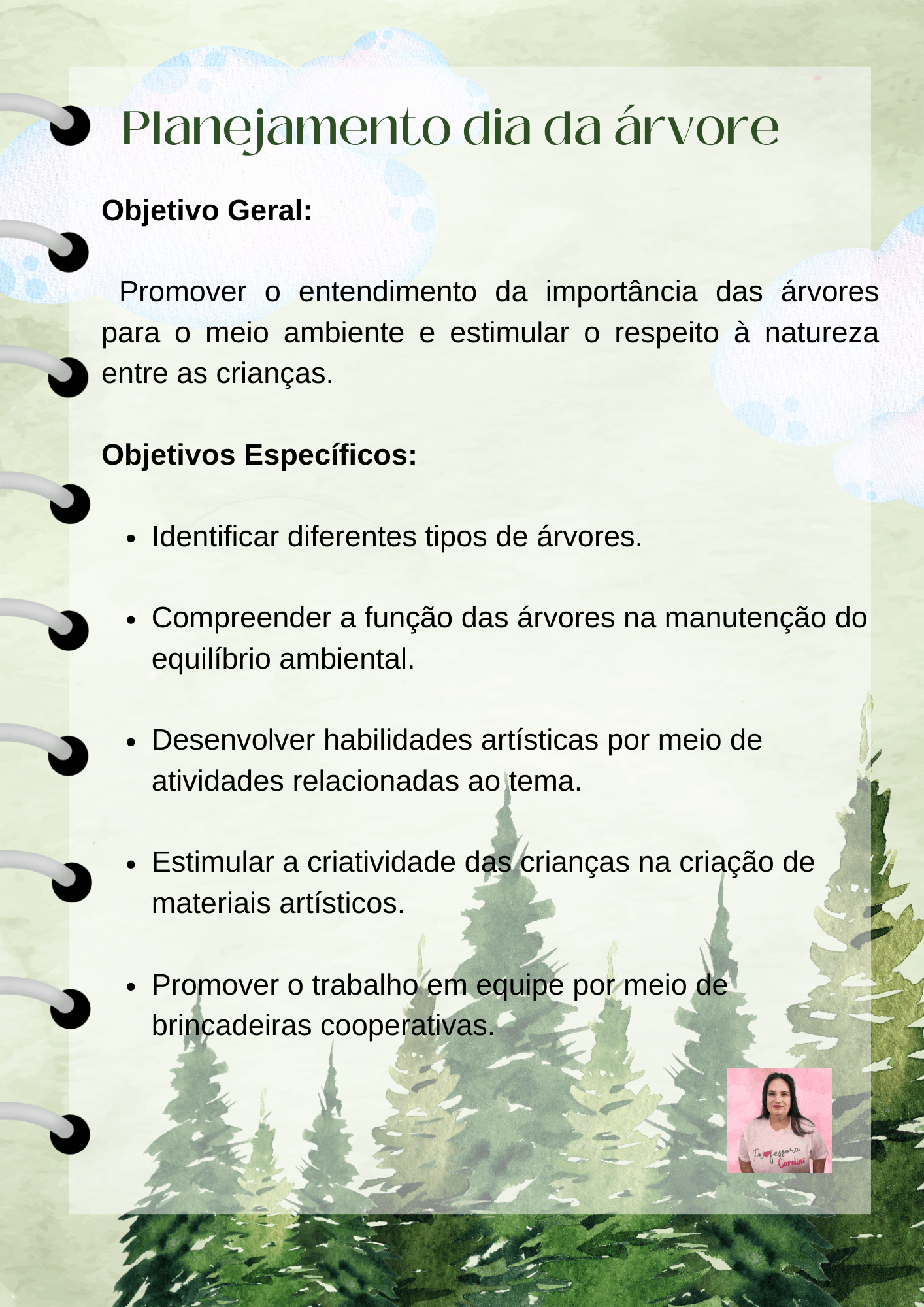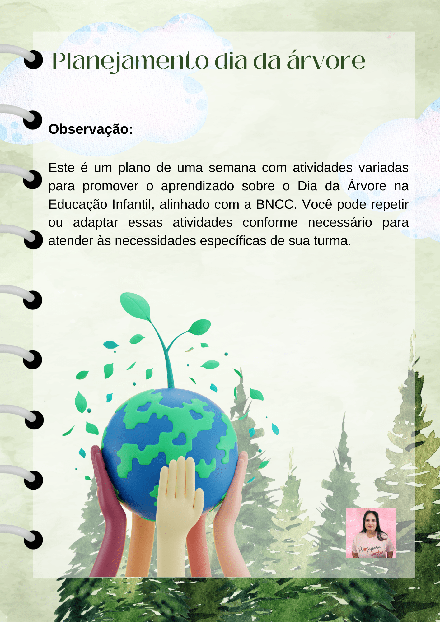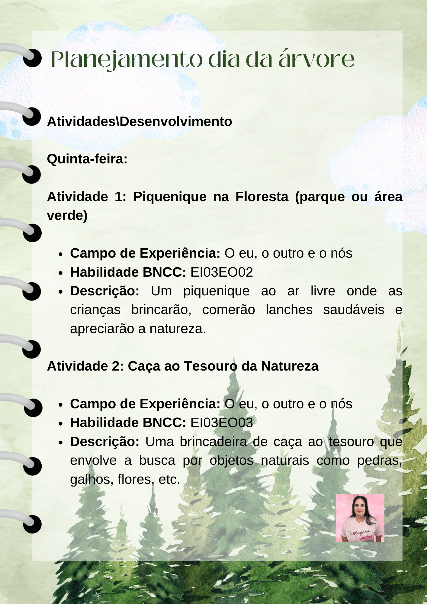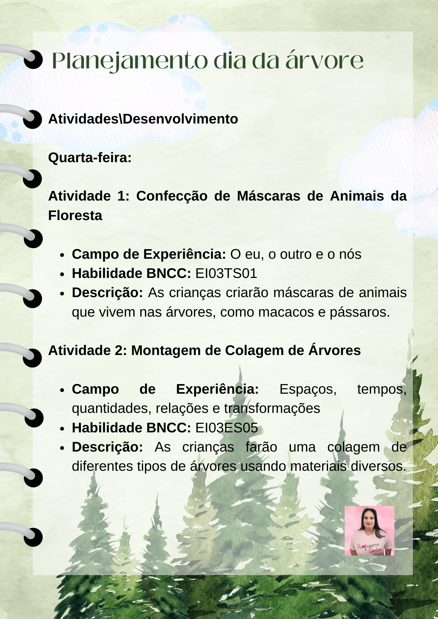 Olá, sou a professora Carlina Palhas, e estou empolgada em compartilhar com vocês um emocionante planejamento semanal na Educação Infantil, centrado no tema do Dia da Árvore e alinhado com a Base Nacional Comum Curricular (BNCC).