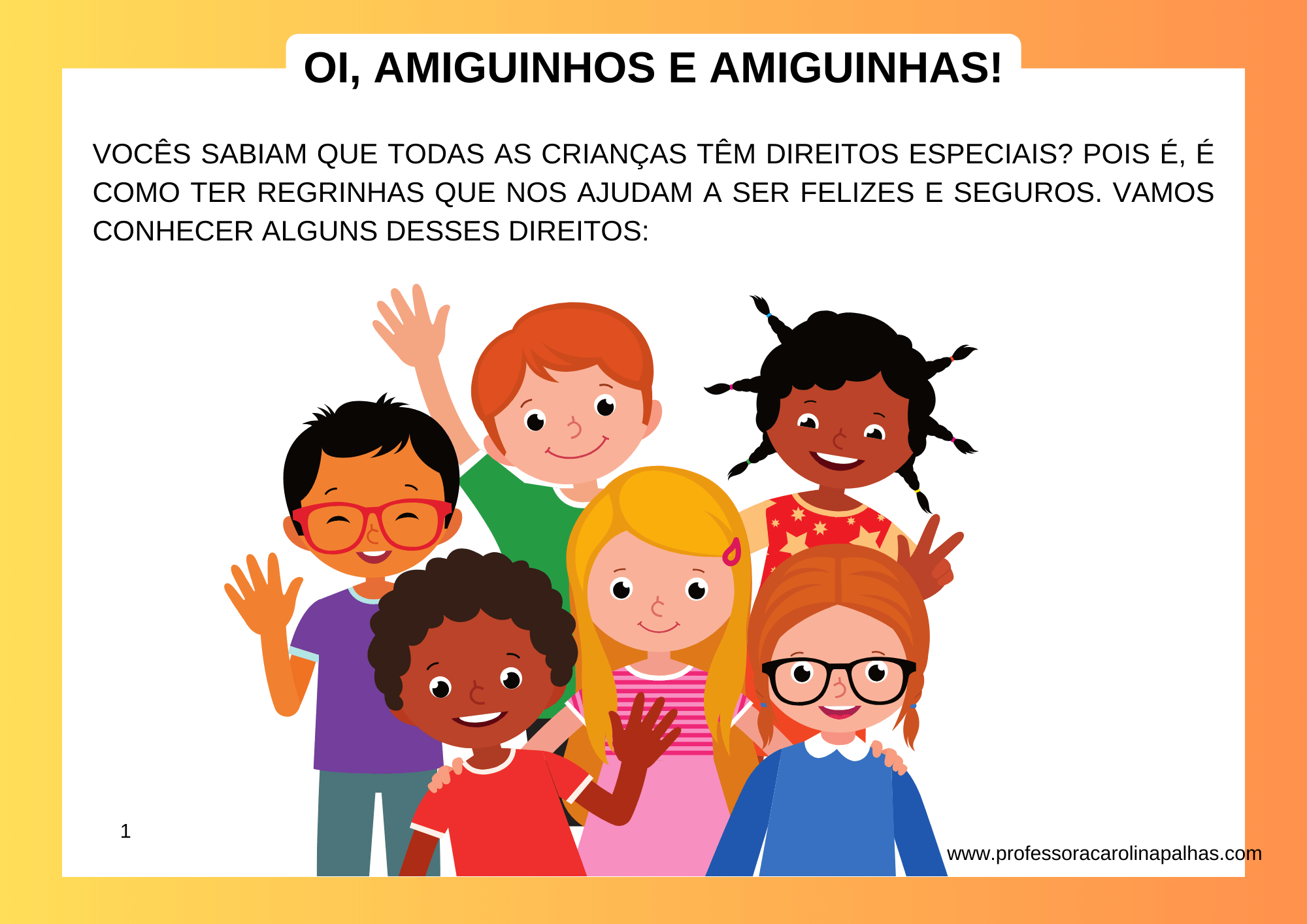 É com alegria que eu trago  esse recurso valioso para auxiliar na educação das crianças: um texto especial sobre os Direitos das Crianças, apresentado de forma acessível e cativante, disponível em formato PDF e enriquecido com imagens atrativas.