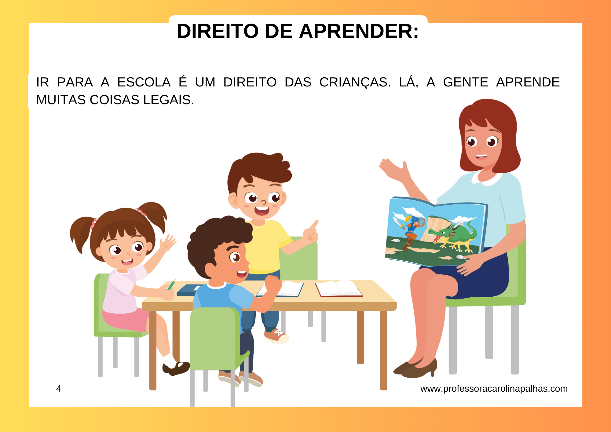 No PDF que preparei com carinho, vocês encontrarão um texto escrito de forma apropriada para a faixa etária das crianças, com a sensação de que a Professora Carolina está conversando diretamente com elas. Além disso, coloquei imagens coloridas que tornarão a leitura mais envolvente e fácil de assimilar.