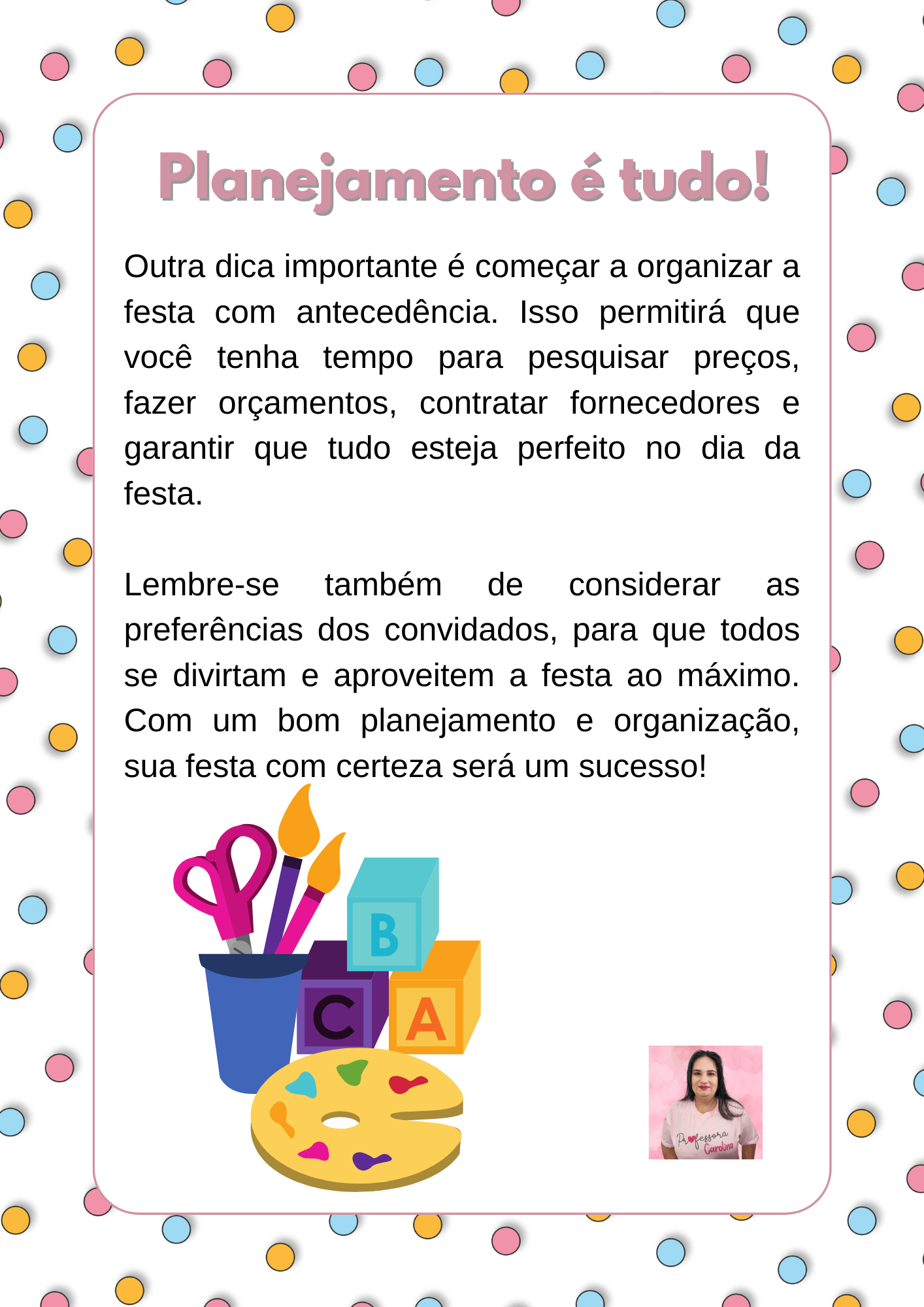 Outra dica importante é começar a organizar a festa com antecedência. Isso permitirá que você tenha tempo para pesquisar preços, fazer orçamentos, contratar fornecedores e garantir que tudo esteja perfeito no dia da festa.
