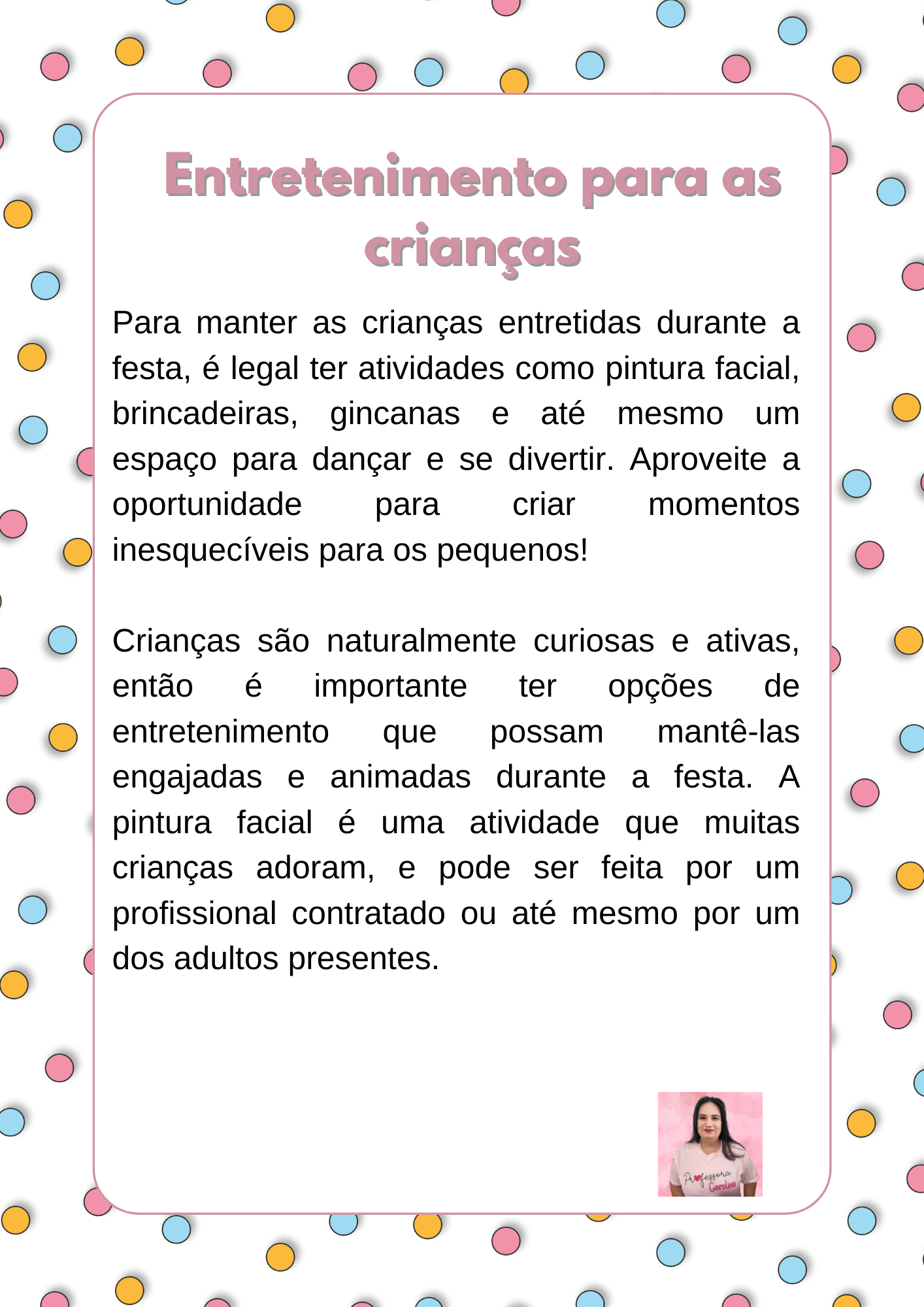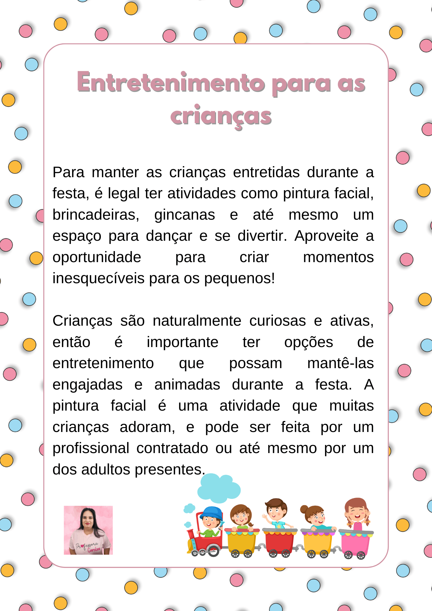 Para manter as crianças entretidas durante a festa, é legal ter atividades como pintura facial, brincadeiras, gincanas e até mesmo um espaço para dançar e se divertir. Aproveite a oportunidade para criar momentos inesquecíveis para os pequenos!