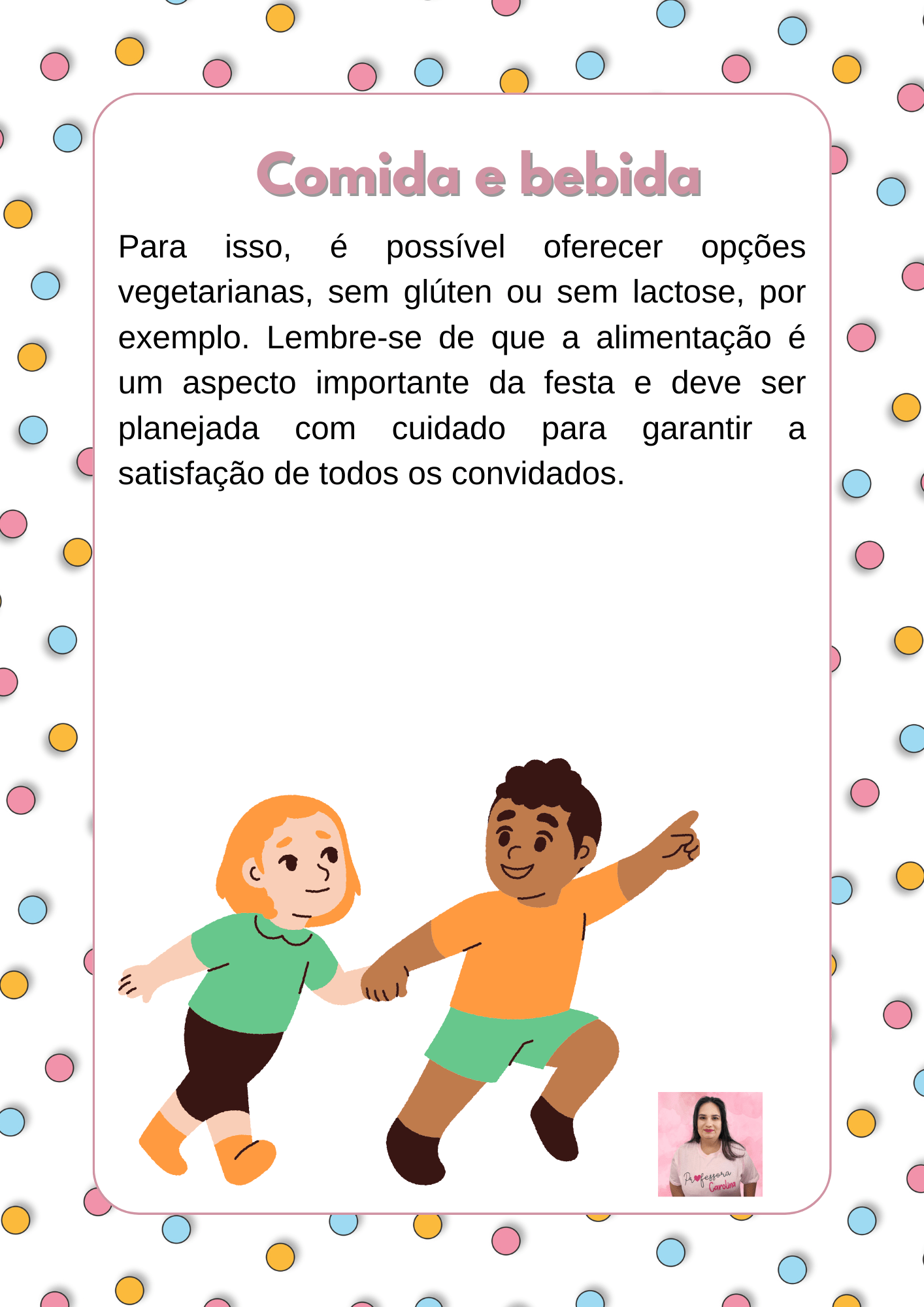 Na hora de escolher a comida e bebida, opte por opções simples e que agradem as crianças, como mini sanduíches, salgadinhos, suco e refrigerante. Lembre-se também de ter opções para crianças com restrições alimentares.
