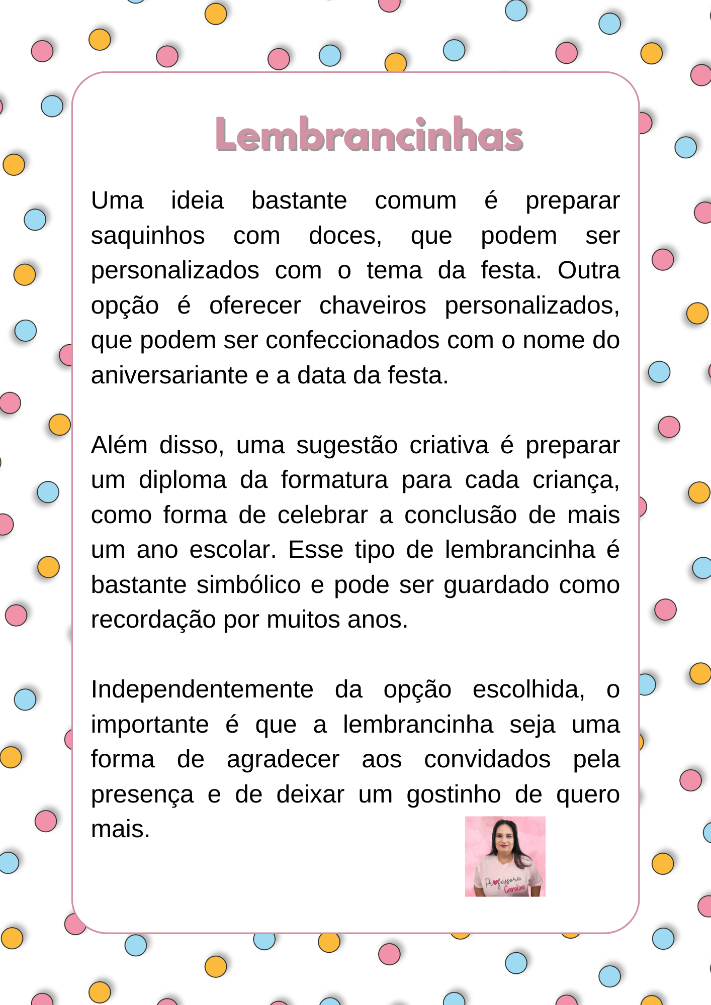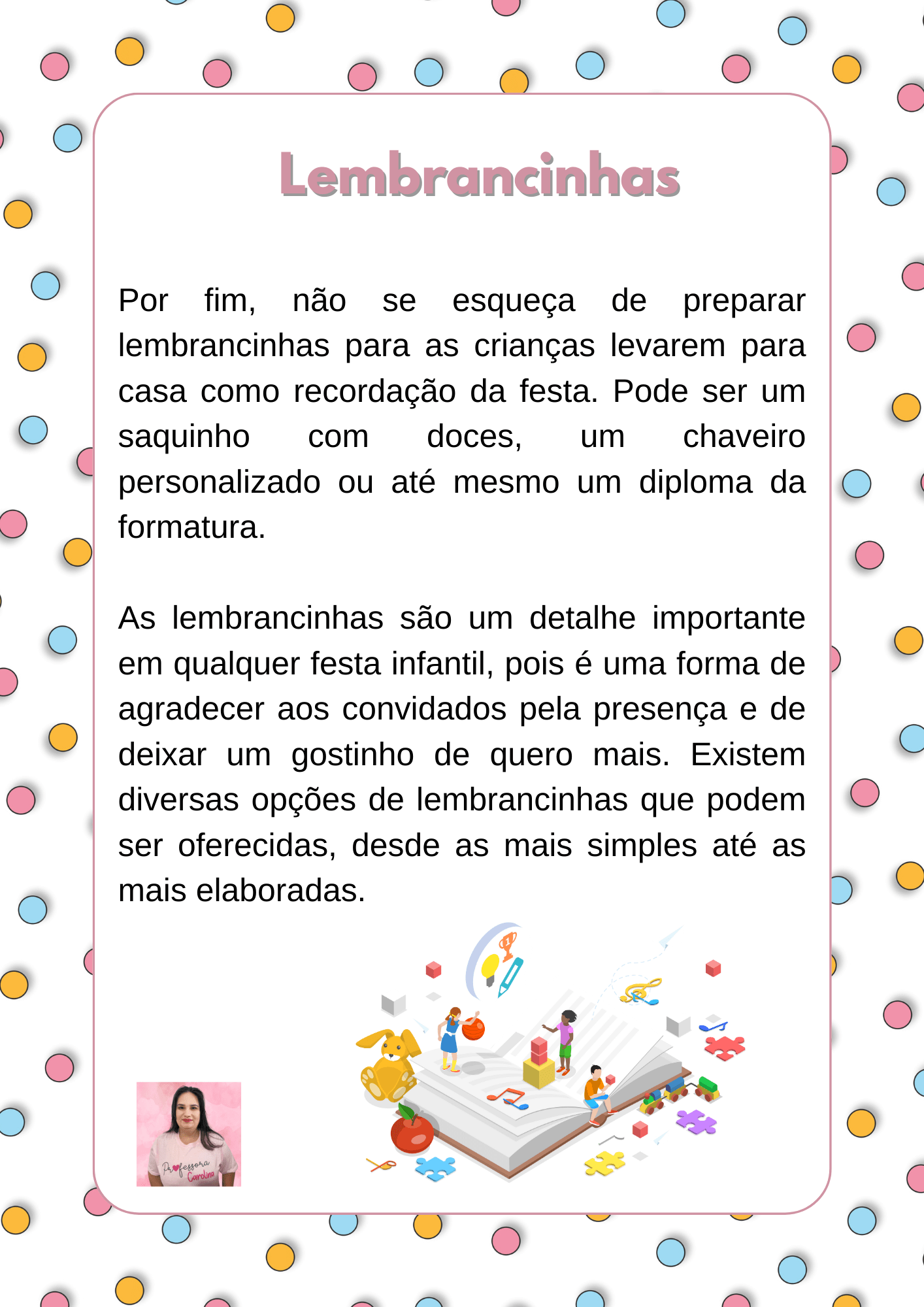 Por fim, não se esqueça de preparar lembrancinhas para as crianças levarem para casa como recordação da festa. Pode ser um saquinho com doces, um chaveiro personalizado ou até mesmo um diploma da formatura.